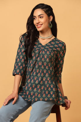 Dark green naturally complements the floral pattern, offering a classic look. This top comes with a floral print on a dark green fabric with a light flare at the waist. Designed with a loose and airy look, this one’s ideal if you want to hide your body imperfections yet look simple and classy in the top-jeans combination.