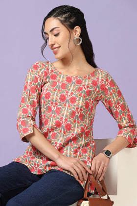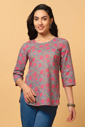 Women’s Grey Cotton Floral Print Regular Tunic Top