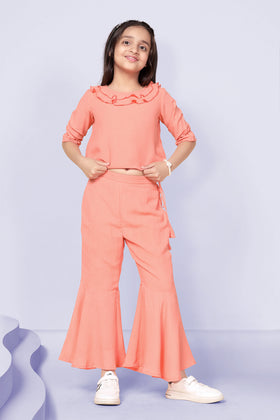 A ruffled flare can transform any colour into a mesmerizing outfit. Here, we’ve used a ruffled design on both the top and skirt to create a unique co ord set for girls that can be used for any casual event. Though this doesn’t require accessories, a simple pair of earrings or a delicate bracelet will surely elevate the look.