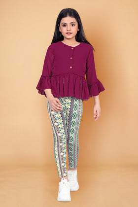 Girl’s Maroon Georgette Top With Geometric Printed Jeggings
