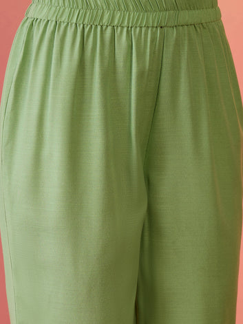 Girl’s Green Taffeta Foil Printed Peplum Kurta With Solid Dhoti Set