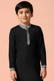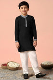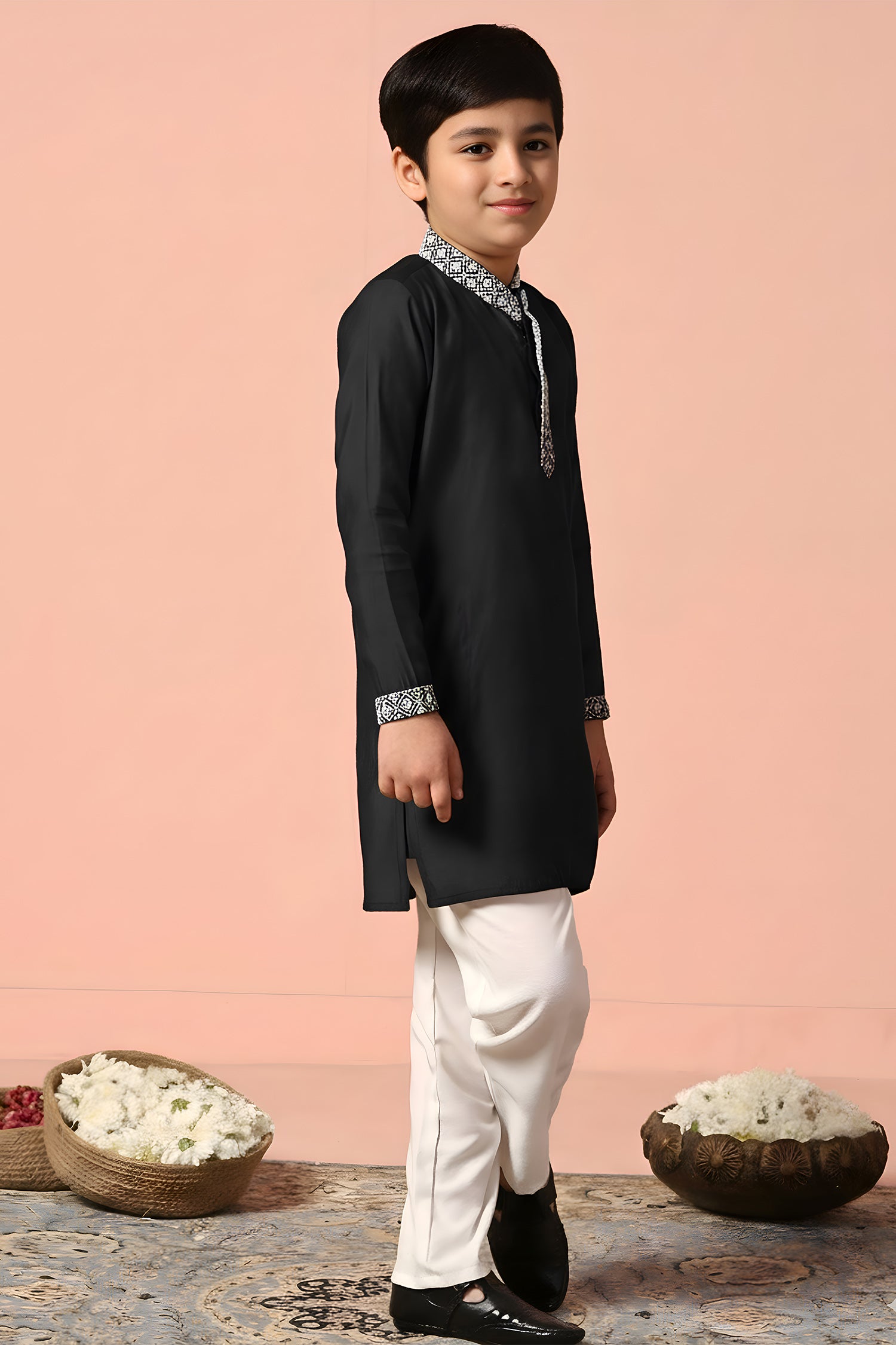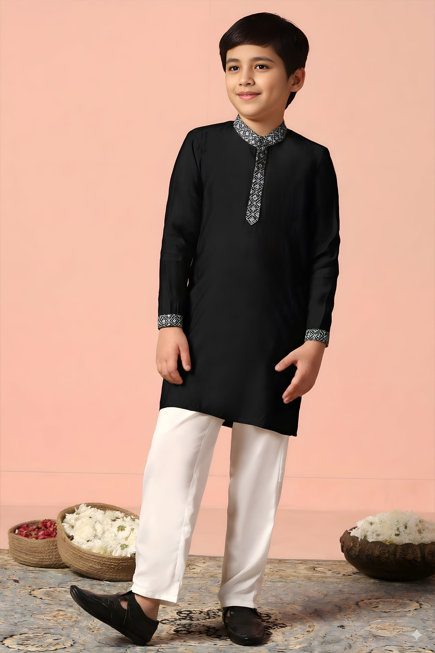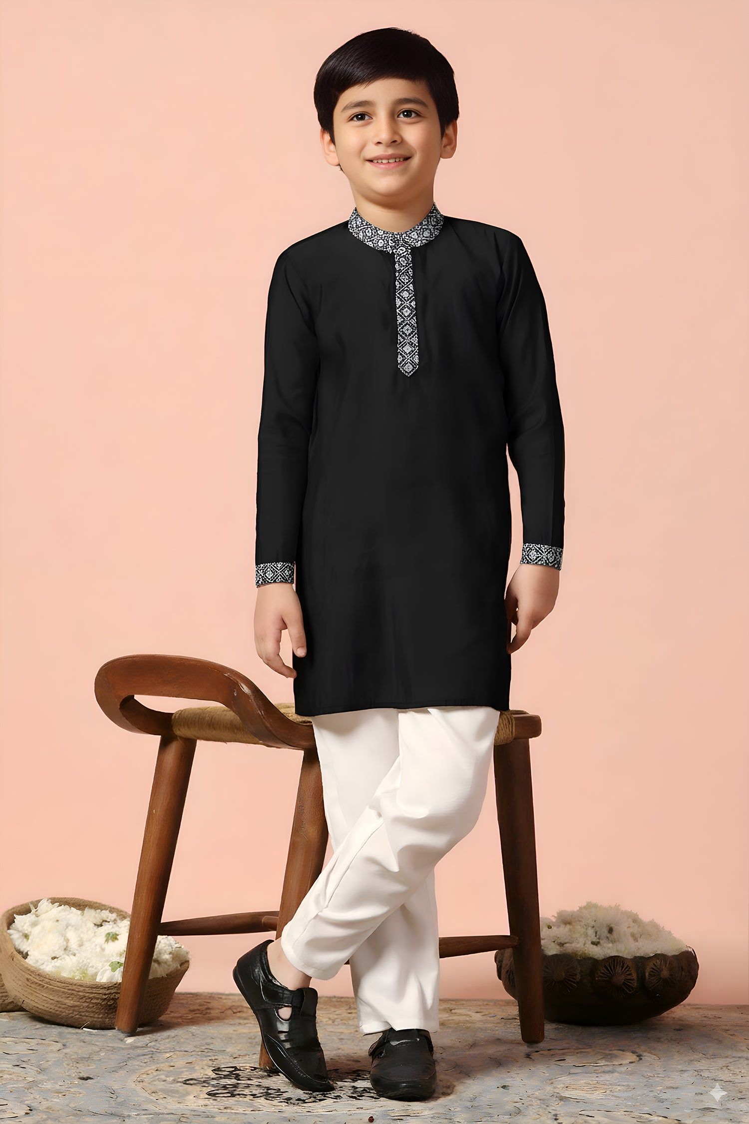 Add timeless charm to your child’s wardrobe with this Black boys kurta pajama set crafted in lightweight Chanderi silk, available on Amazon. The soft sheen of the fabric combined with delicate embroidery on the yoke, sleeve cuffs, and hemline gives the ensemble a refined ethnic look that feels both festive and wearable. Designed with a straight silhouette, the kurta features full sleeves, a mandarin collar, front button closure, and functional side slits for movement and style. The matching white pajama is fully elasticated, offering flexibility and day-long comfort during weddings, poojas, or family gatherings. Whether you're dressing your child for traditional functions or capturing candid moments during a celebration, this boys kurta set balances elegance and ease in one ready-to-wear outfit. It’s an ideal pick for those looking for cultural clothing that feels current, stylish, and rooted in tradition. Hand wash separately with care to preserve the embroidery and softness of the Chanderi silk.