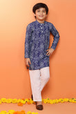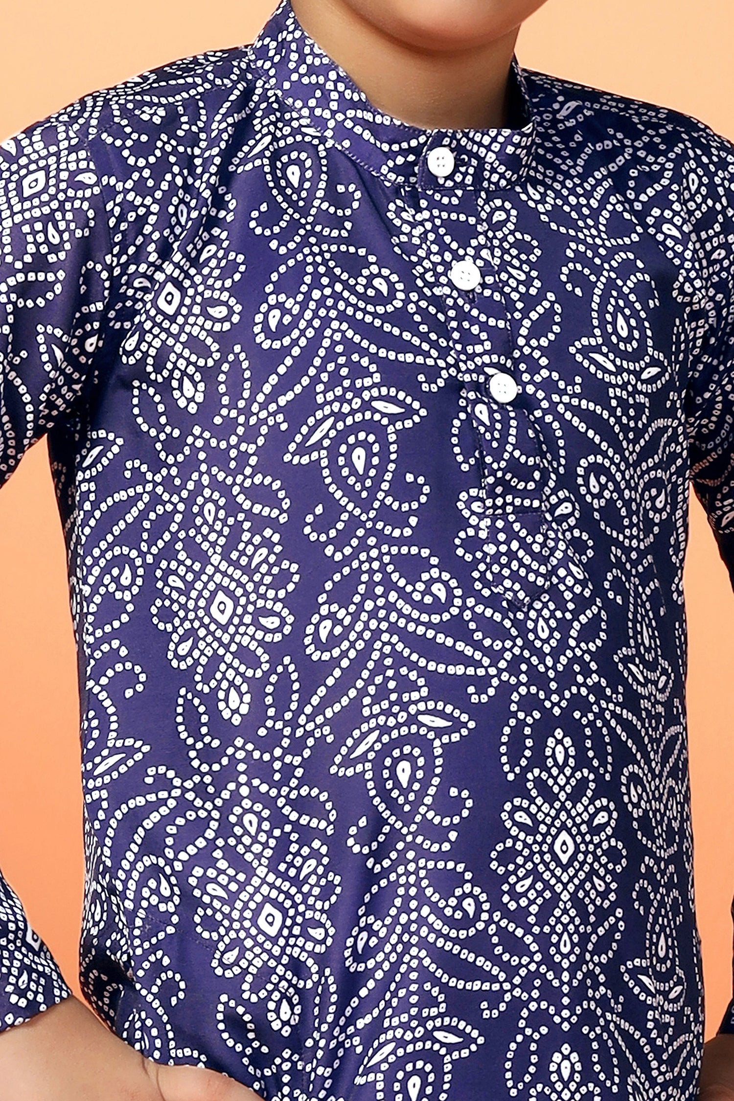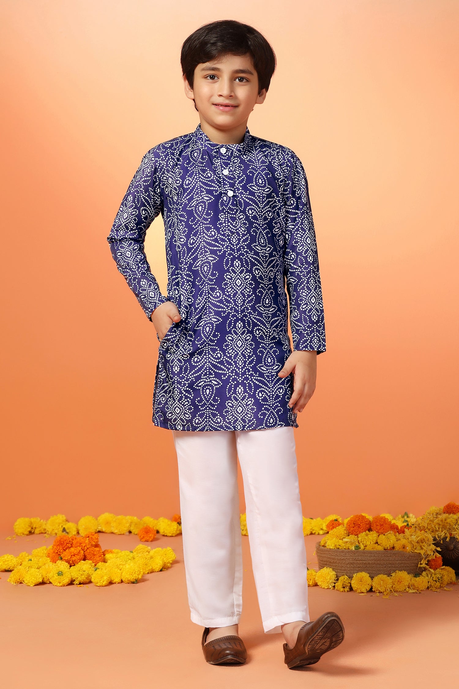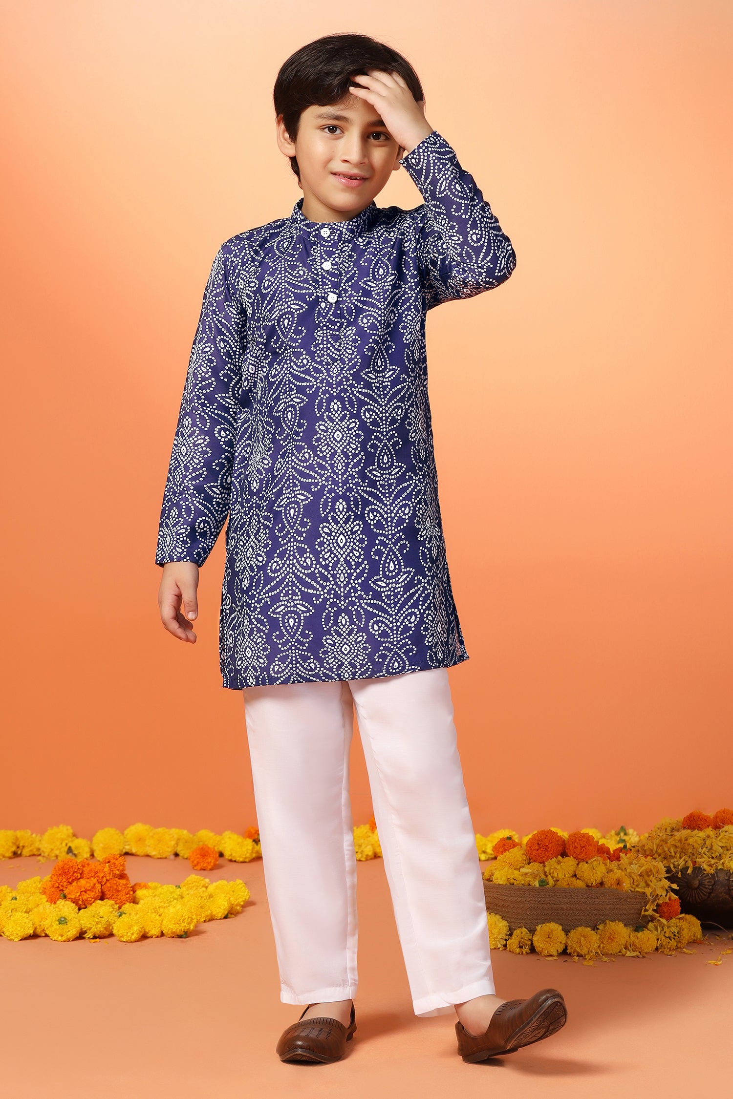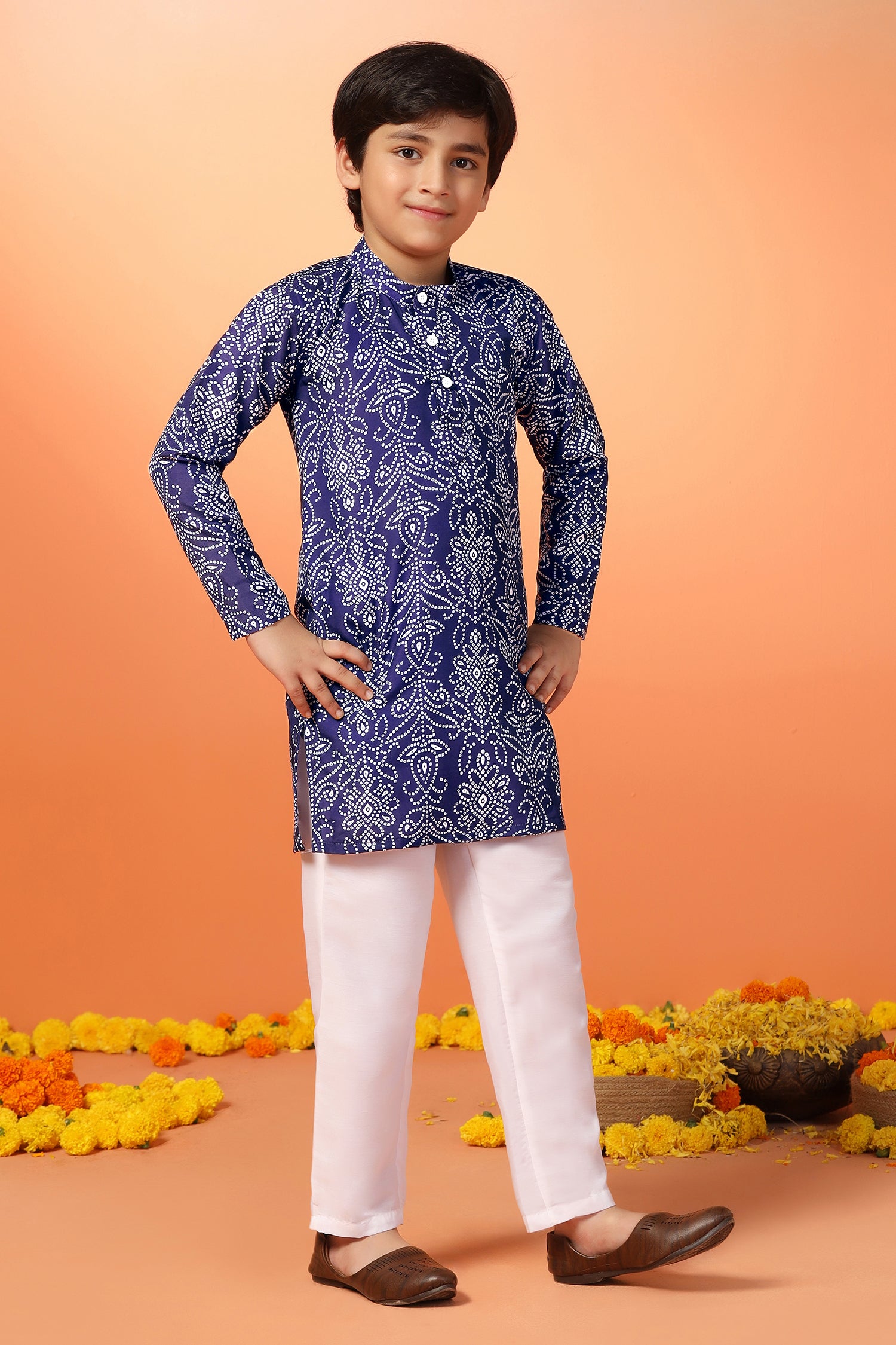 Shop a wide range of collection of boys kurta and pant set from Fashion Dream available on Amazon. This festive get styled up with this trendy kurta and pant set. You are sure to win a lot of compliments wearing this Dark Blue kurta set. Add a stylish edge to your ethnic wear collection by opting for this bandhani printed kurta set. This regular fit kurta pant crafted cotton blend fabric. This regular kurta features a mandarin collar, front button closure, overall printed, side slits, straight hemline hem, one side pocket for keep tiny treasure and has full-sleeves. It comes with a solid white pant that features slip on closure and elasticated waist band. Team it with a pair of Brown jutti to achieve the desired look. "Note: The accessories and props used in these photoshoots are for aesthetic purposes only and may not be included in the final product or service."