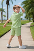 Add a fresh twist to your child’s summer wardrobe with this Light Green Co-ord Set for kids – a classic two-piece ensemble combining breezy comfort with timeless style. Made from a breathable cotton-blend fabric, this top and bottom set for kids includes a short-sleeve collared shirt with a clean button-down front and neatly stitched seams. The minimalistic wave-textured fabric introduces subtle sophistication, making it a perfect pick for beach holidays, family outings, or casual weekends. Paired with matching knee-length shorts featuring an elasticated waistband for a comfortable, adjustable fit, this co-ord set for kids promises both style and functionality. Whether styled for a summer dress for kids, playdate look, or a polished casual moment, this shirt and shorts combo ensures your child stays cool and photo-ready. Ideal for those browsing kids dress sets, this look blends contemporary taste with everyday ease. Note: Accessories and props shown in the images are for styling purposes only and are not included with the product.