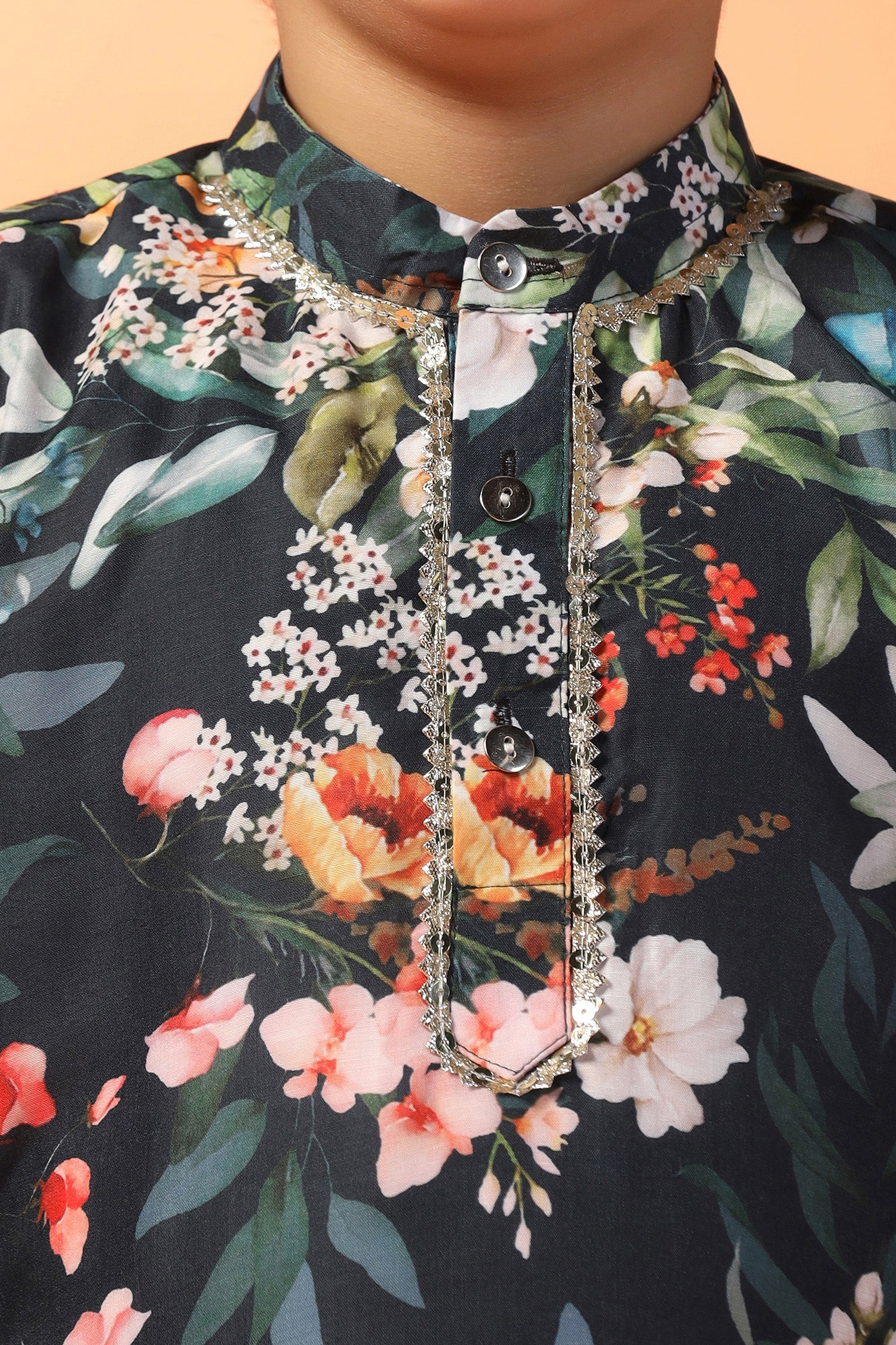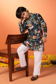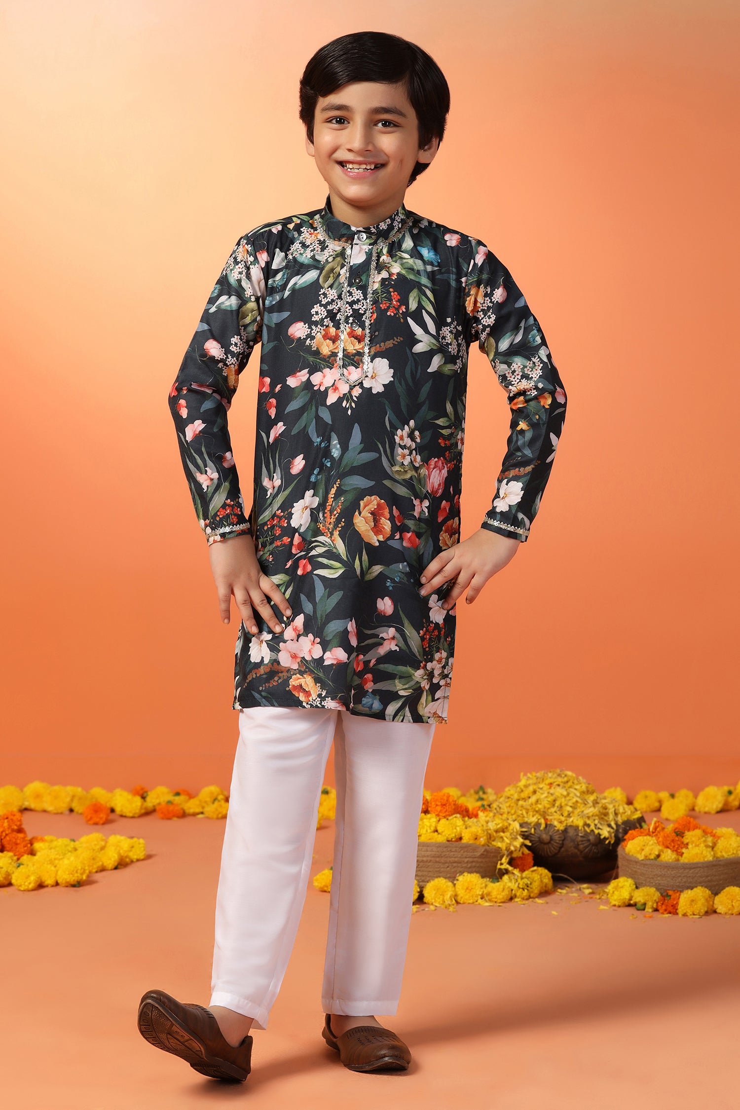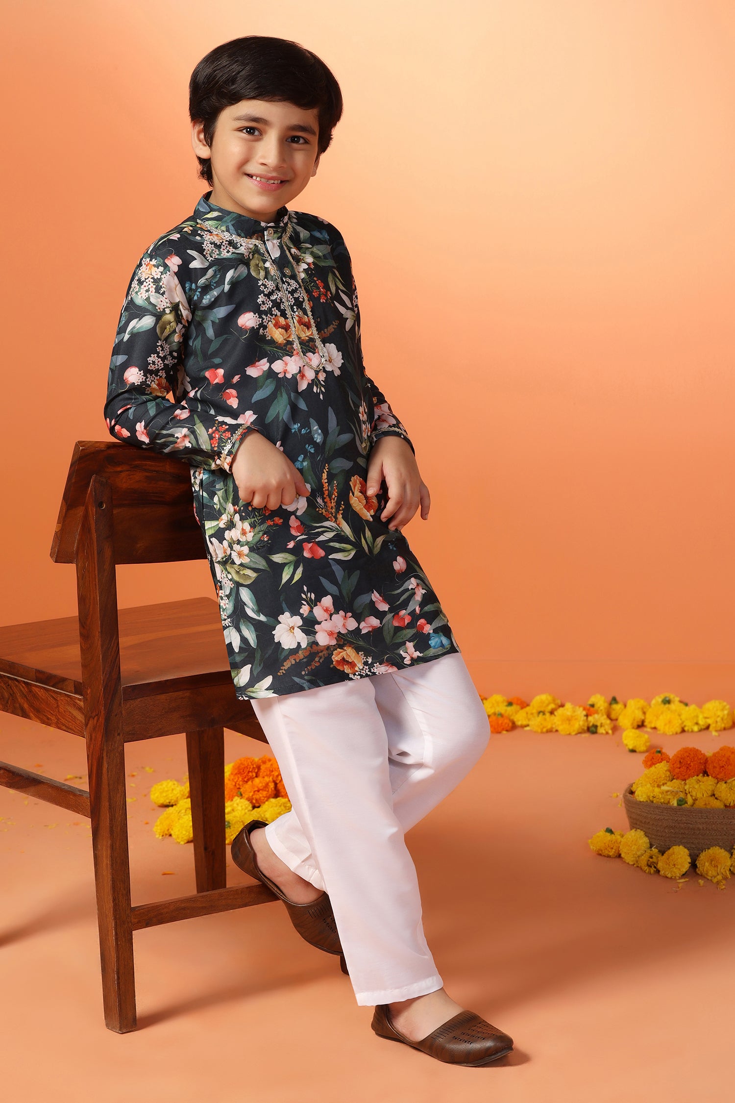 This festive get styled up with this trendy kurta and pant set. Show-off your charming personality by wearing this navy blue colored kurta set. Add a stylish to your ethnic wear collection by opting for this floral printed kurta set. This regular fit kurta set made from lightweight and breathable cotton blend fabric so that you'll stay cool and comfortable all day long. This regular kurta features a mandarin collar neck with front button closure, long sleeves, side slits, straight hem and two side pockets for keep tiny treasure. It comes with a solid white pant that features slip on closure and fully elasticated waist band. Style it with a pair of ethnic jutti to complete the look. "Note: The accessories and props used in these photoshoots are for aesthetic purposes only and may not be included in the final product or service."
