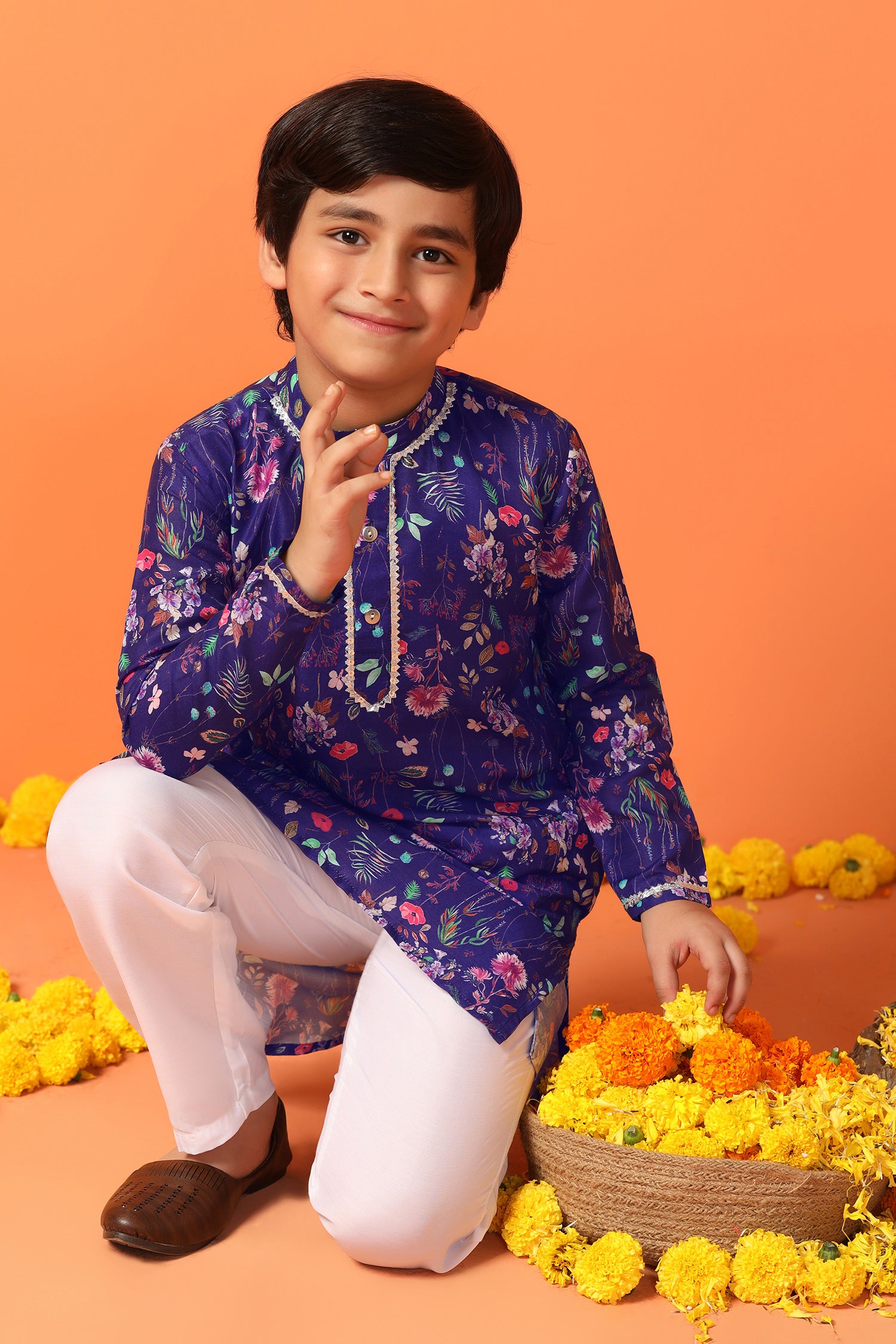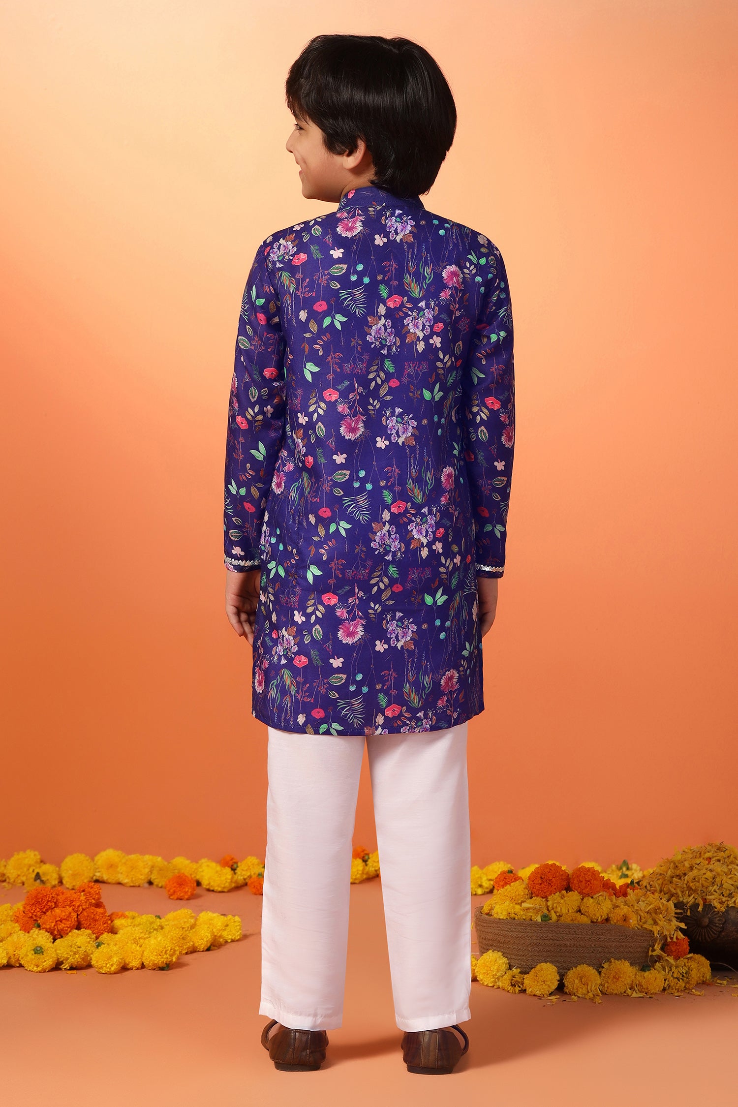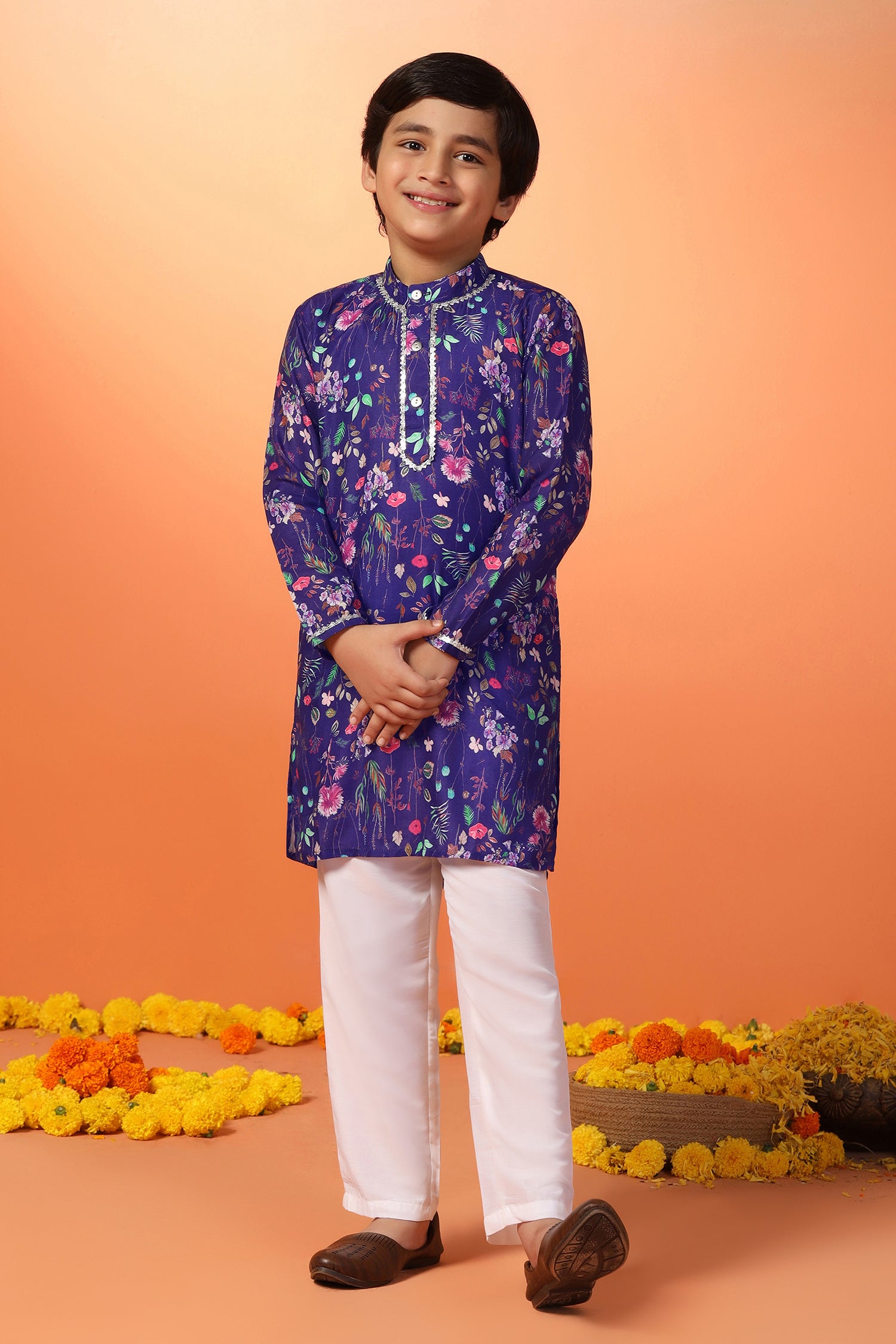 This festive get styled up with this trendy kurta and pant set. Show-off your charming personality by wearing this purple colored kurta set. Add a stylish edge to your ethnic wear collection by opting for this floral printed kurta set. This regular fit kurta set made from lightweight and breathable cotton blend fabric so that you'll stay cool and comfortable all day long. This regular kurta features a mandarin collar neck with front button closure, long sleeves, side slits, straight hem and two side pockets for keep tiny treasure. It comes with a solid white pant that features slip on closure and fully elasticated waist band. Style it with a pair of ethnic jutti to complete the look. "Note: The accessories and props used in these photoshoots are for aesthetic purposes only and may not be included in the final product or service."
