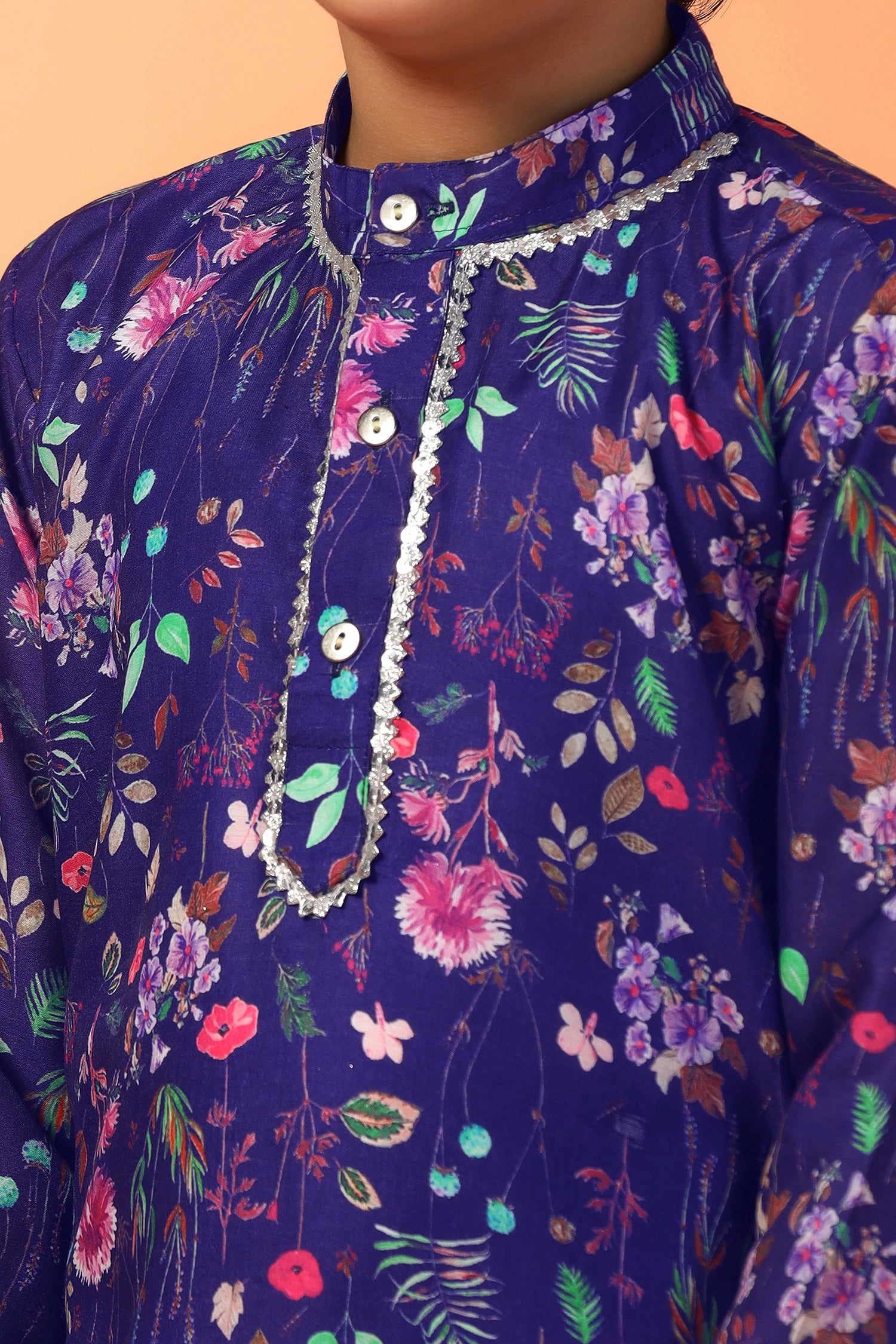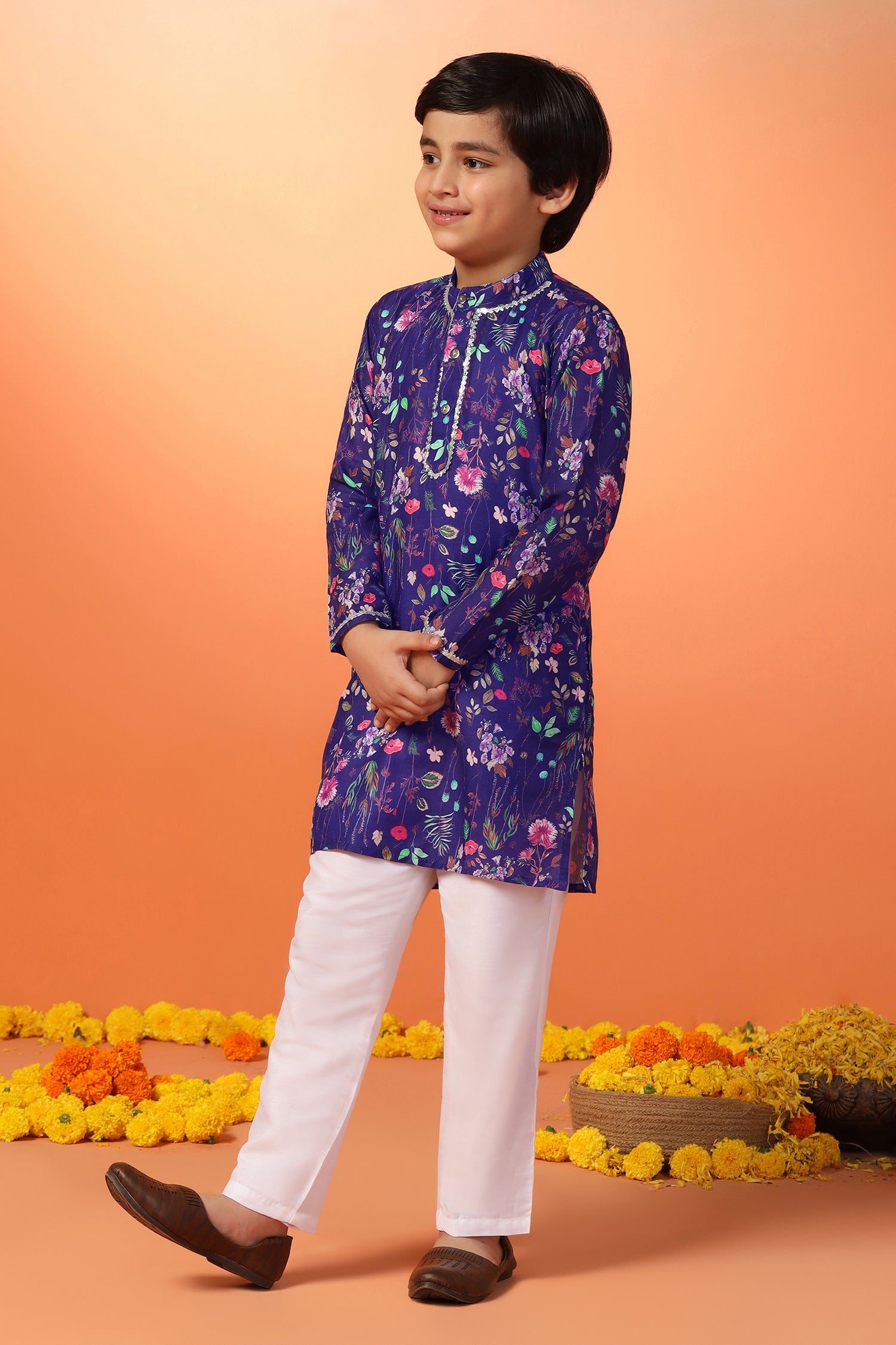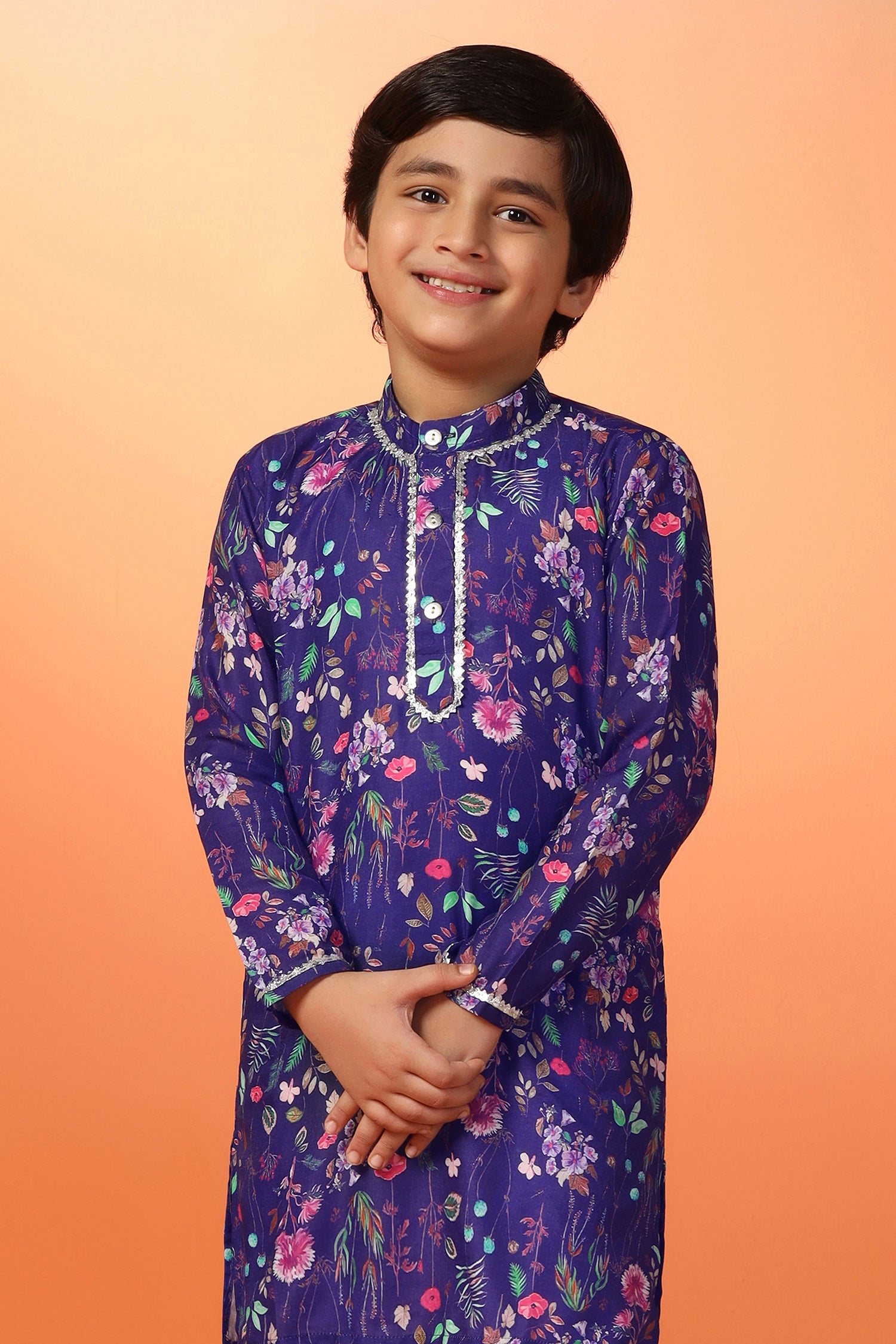 This festive get styled up with this trendy kurta and pant set. Show-off your charming personality by wearing this purple colored kurta set. Add a stylish edge to your ethnic wear collection by opting for this floral printed kurta set. This regular fit kurta set made from lightweight and breathable cotton blend fabric so that you'll stay cool and comfortable all day long. This regular kurta features a mandarin collar neck with front button closure, long sleeves, side slits, straight hem and two side pockets for keep tiny treasure. It comes with a solid white pant that features slip on closure and fully elasticated waist band. Style it with a pair of ethnic jutti to complete the look. "Note: The accessories and props used in these photoshoots are for aesthetic purposes only and may not be included in the final product or service."