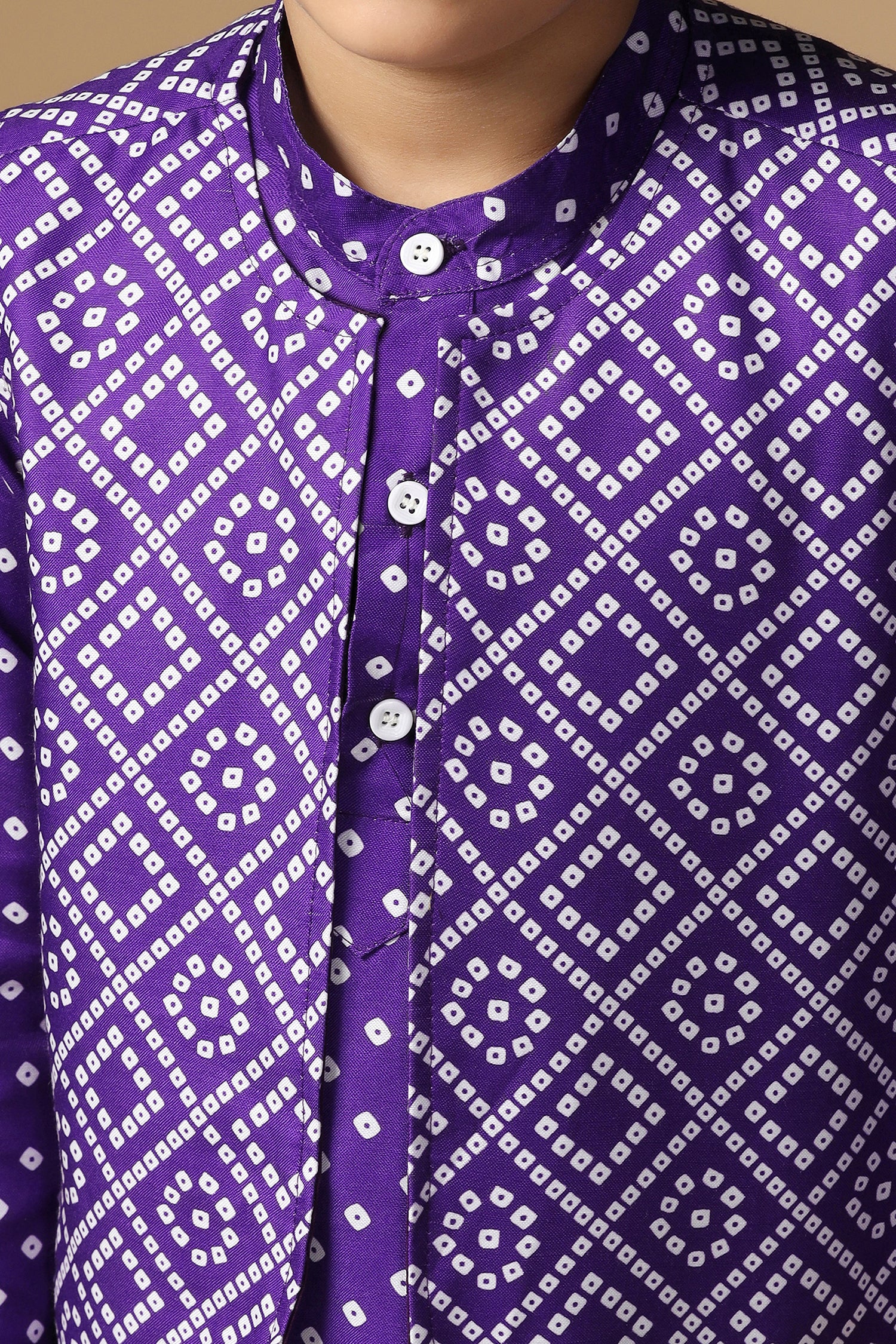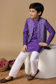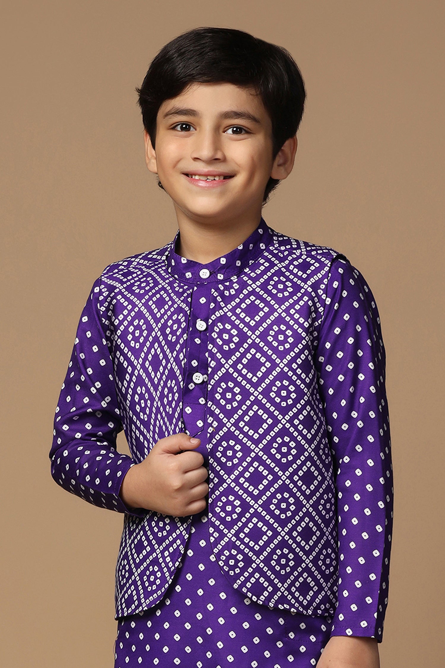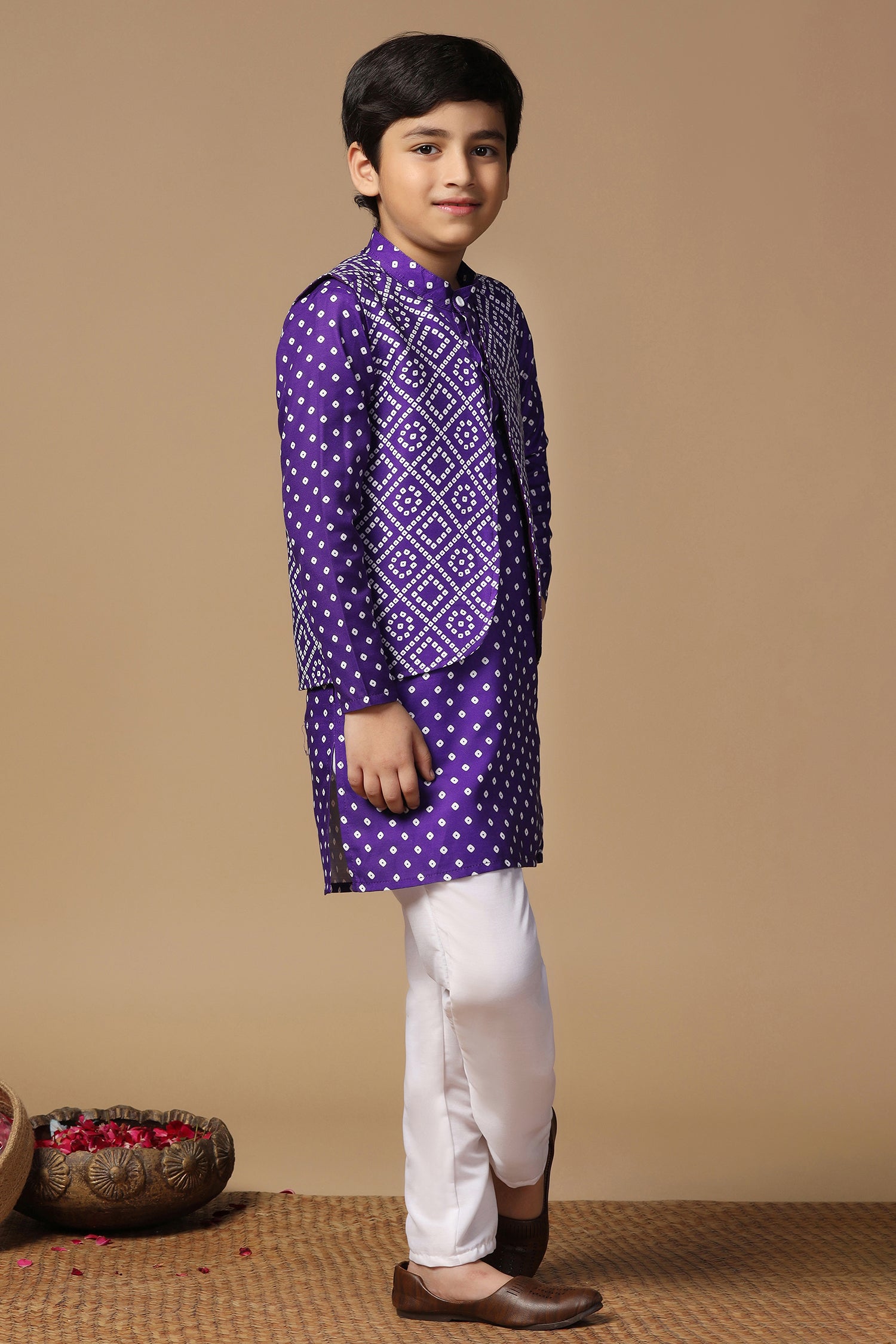 This festive get styled up with this trendy kurta and pant set. Show-off your charming personality by wearing this lovely violet color kurta set. Add a stylish edge to your ethnic wear collection by opting for this printed pink color kurta set. This regular fit kurta set made from lightweight and breathable cotton blend fabric so that you'll stay cool and comfortable all day long. The kurta features a mandarin collar with fornt button clouser, all-over printed, side slits and straight hemline. It comes with all over printed nehru jacket that features a mandarin collar, sleeveless and with a solid white pant that features slip on closure and fully elasticated waist band. Style it with a pair of jutti to achieve the desired look."Note: The accessories and props used in these photoshoots are for aesthetic purposes only and may not be included in the final product or service."