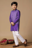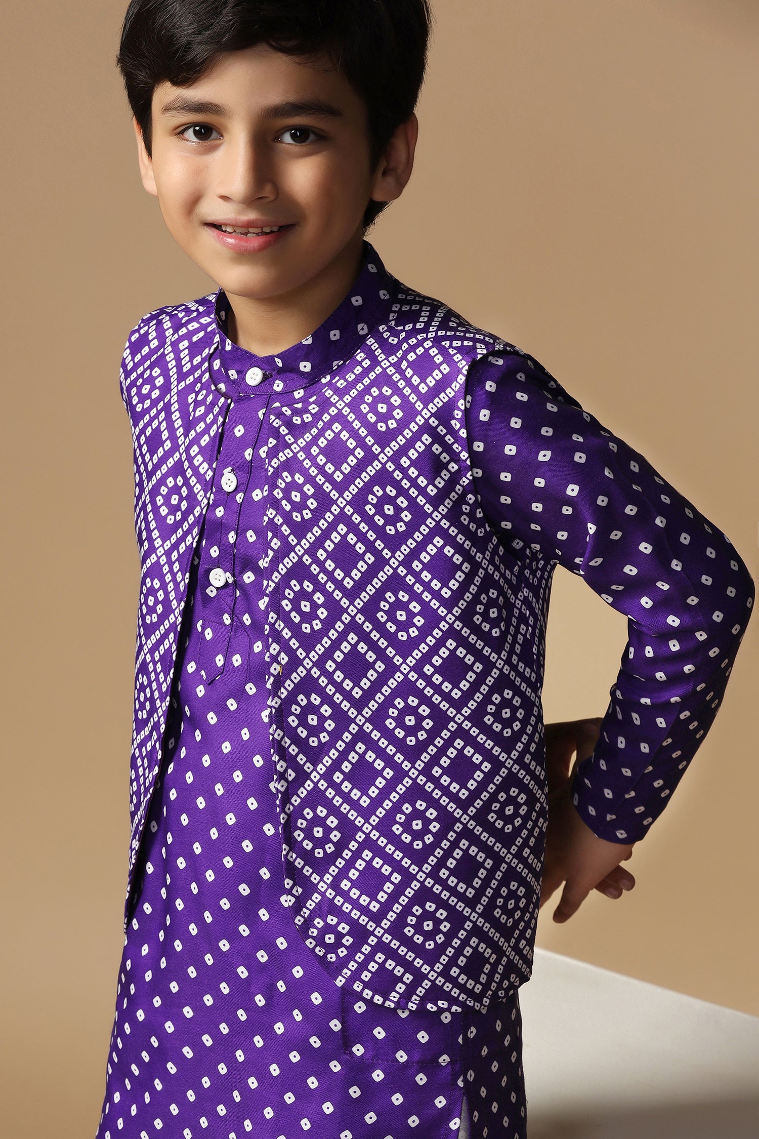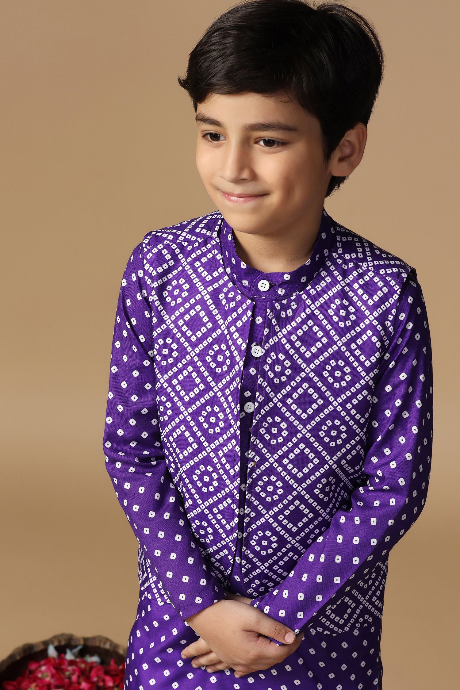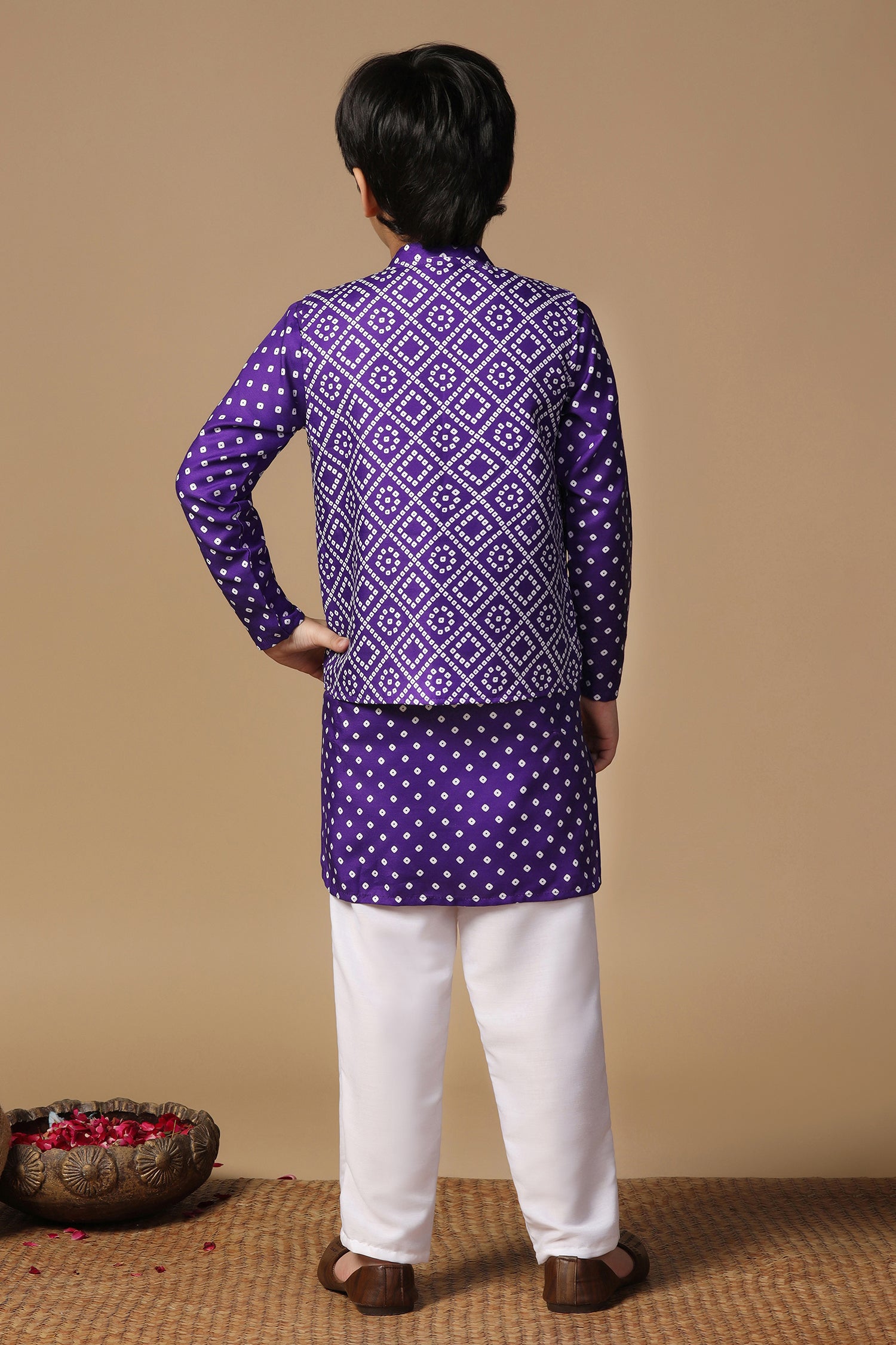 This festive get styled up with this trendy kurta and pant set. Show-off your charming personality by wearing this lovely violet color kurta set. Add a stylish edge to your ethnic wear collection by opting for this printed pink color kurta set. This regular fit kurta set made from lightweight and breathable cotton blend fabric so that you'll stay cool and comfortable all day long. The kurta features a mandarin collar with fornt button clouser, all-over printed, side slits and straight hemline. It comes with all over printed nehru jacket that features a mandarin collar, sleeveless and with a solid white pant that features slip on closure and fully elasticated waist band. Style it with a pair of jutti to achieve the desired look."Note: The accessories and props used in these photoshoots are for aesthetic purposes only and may not be included in the final product or service."