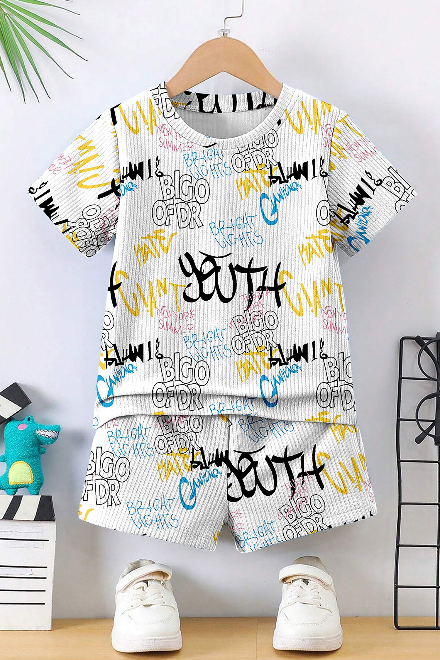 Your little one will be delighted with this simple yet elegant apparel combo set. The two-piece set can be mixed and matched with other items in your boy's wardrobe for added versatility. This cool and comfortable boys white co-ords set is perfect for winter adventures. The two-piece ensemble is both stylish and versatile, making it a great addition to your child's wardrobe. Exquisitely designed with Lycra fabric, this set is ideal for keeping your little one cool during the warmer months. It features a round neck, half sleeves,Letter Printed and comfortable printed shorts. The versatile design allows you to wear it with sneakers for play time or sandals for a casual look. "Note: The accessories and props used in these photoshoots are for aesthetic purposes only and may not be included in the final product or service."