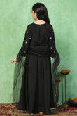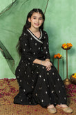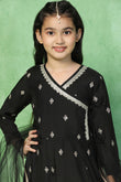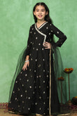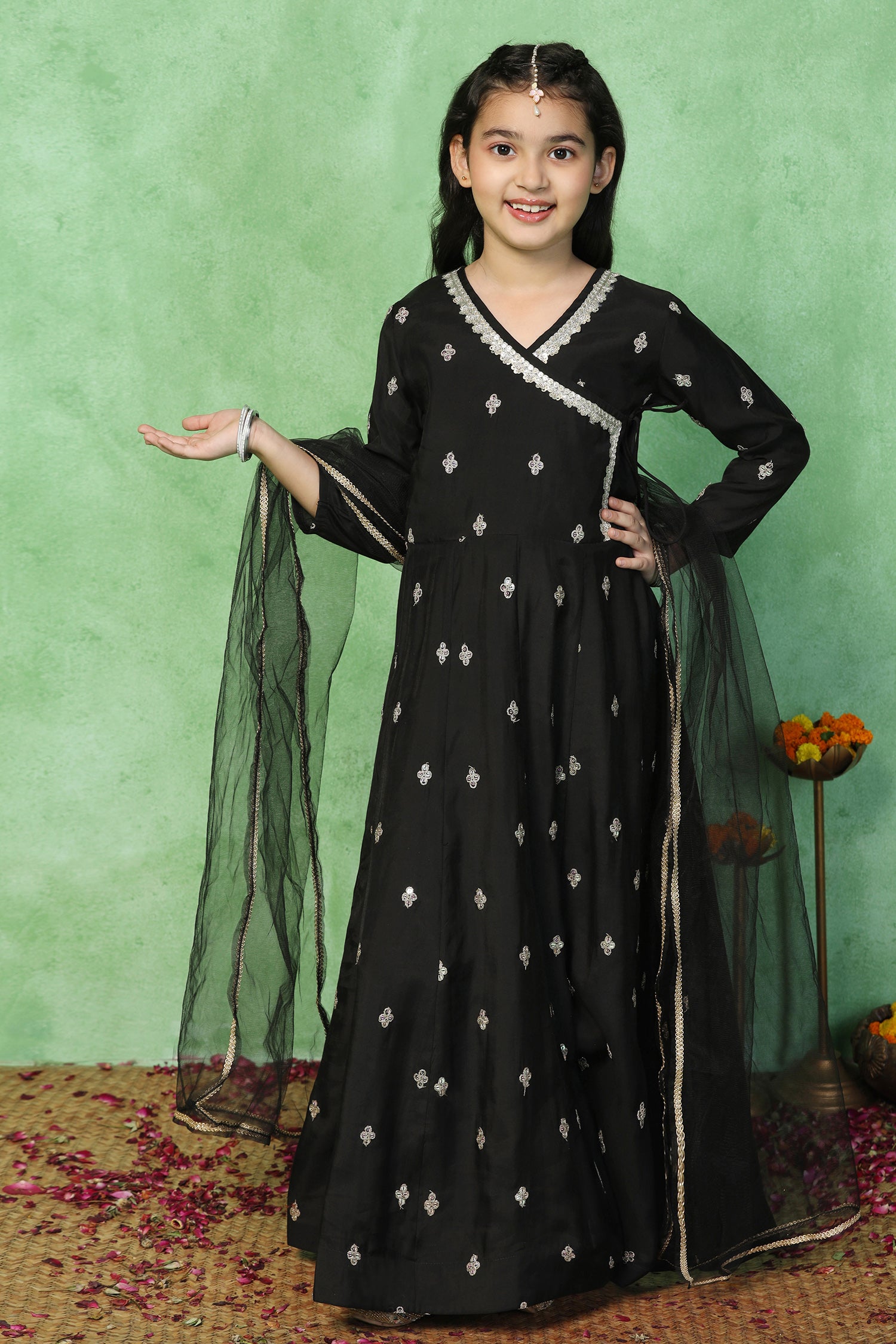 Dress your little girls with this black colored maxi length Dress With Dupatta from Fashion Dream. Pair it with a cute hair accessory and jutti to shine at the best friend's birthday party. Give your kids a unique look with this stylish embroidered dress. This dress is crafted from silk blend fabric. It features angrakha neck with back zip closure and attached fabricated belt, 3/4th sleeves, an intricated lace detailing over neckline and embroidered work which creates a stunning look that will make your girl look even more stylish. This dress comes with matching net dupatta which adds to its beauty will surely enhance your girls look. This girls dress is ideal for all everyday functions, parties and outdoor activities. Pair with subtle jewellery for a beautiful look that's perfect for festivals or family gatherings.