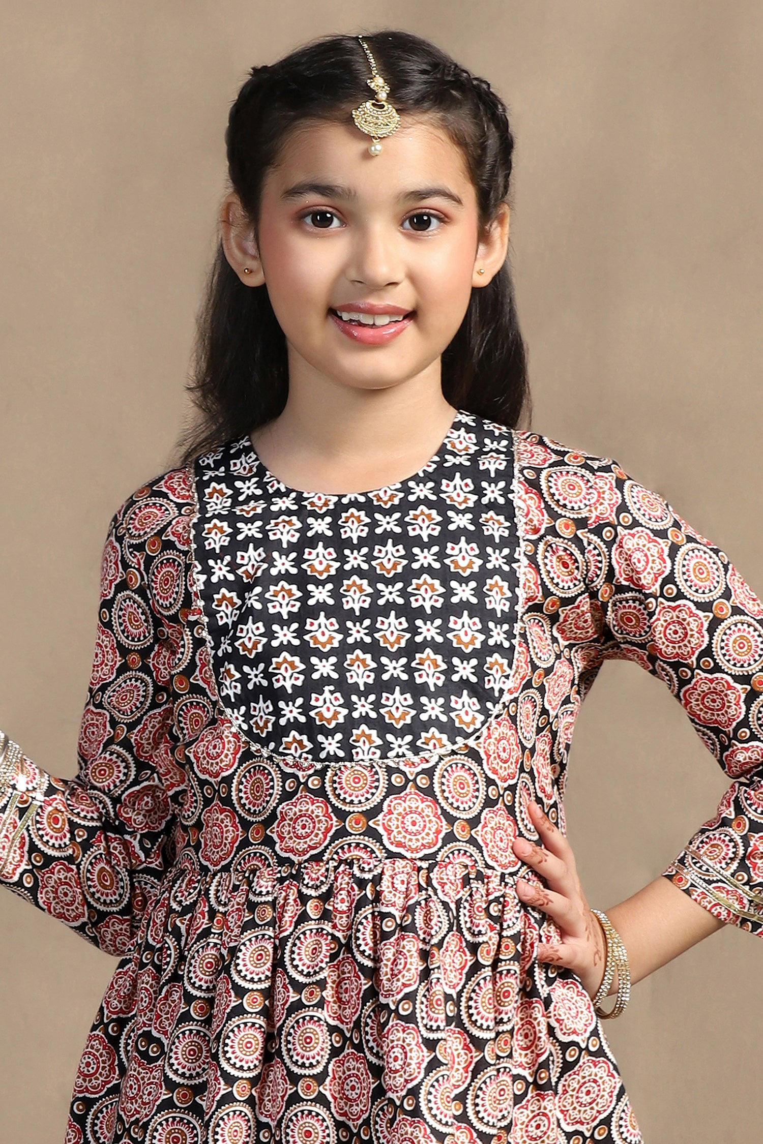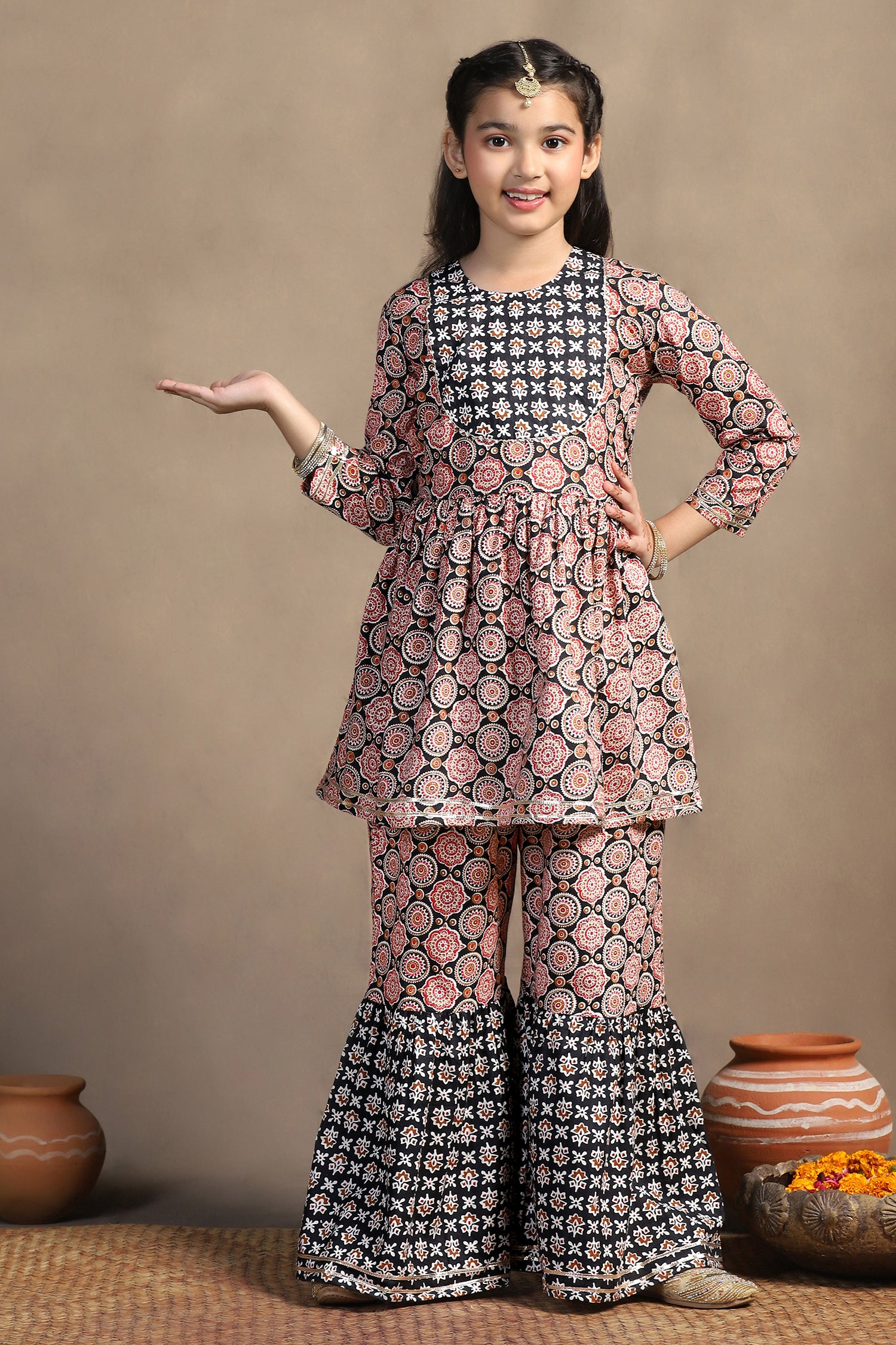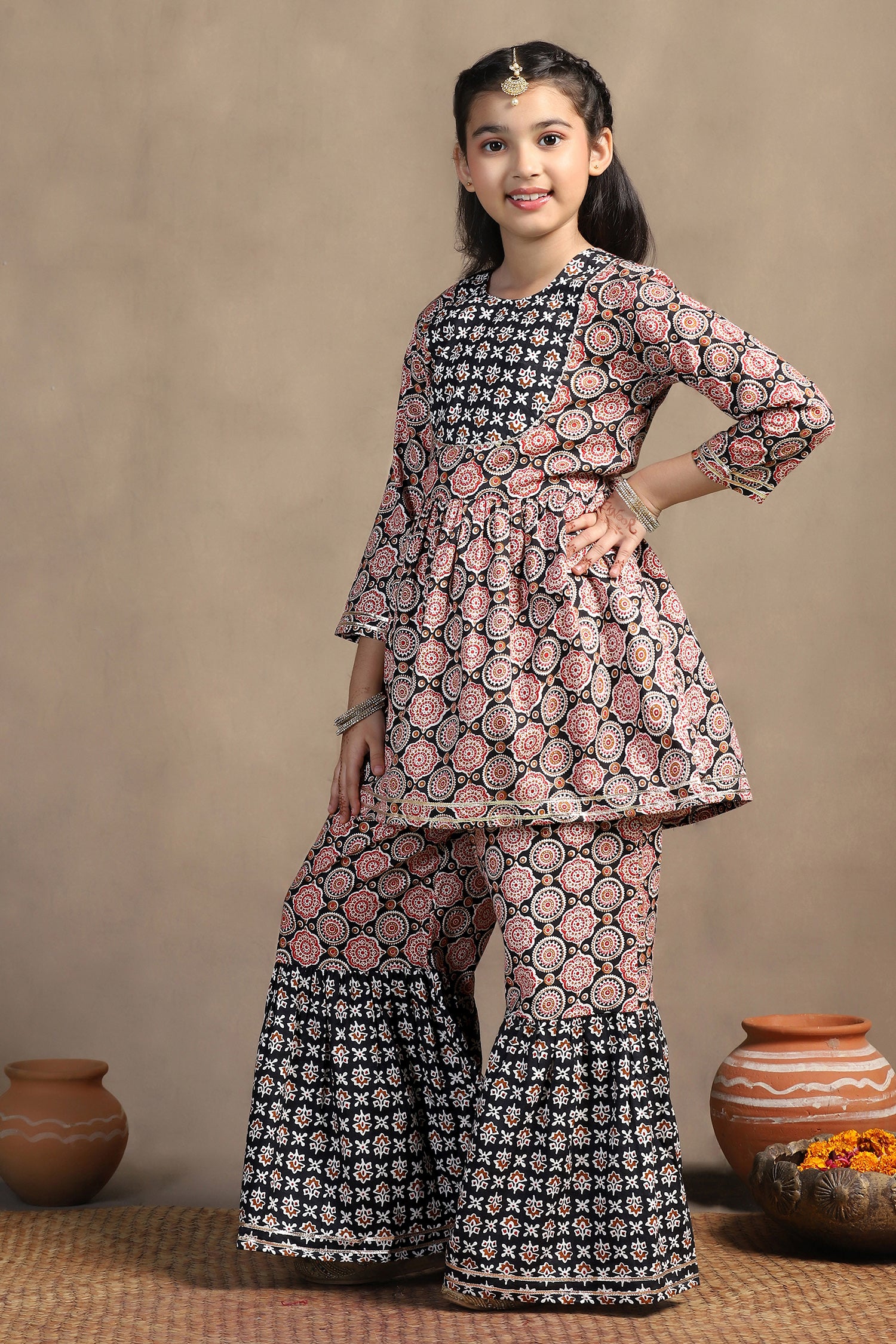 This anarkali kurta and Sharara Set completes your look for your special occasions. This stylish kurta and sharara set is made from comfortable cotton in a classic black color. The anarkali kurta features a vibrant floral print with a unique round neck, 3/4 Sleeves and elegant lace detailing. This kurta is complemented by the Sharara, which boasts a striking combination of Floral , along with an elastic closure for ease and comfort. Perfect for festive occasions or casual gatherings, this set combines traditional charm with contemporary style. Get ready your little girl for upcoming festive event by pairing this ethnic set with sandals, earrings and cute hair clips. "Note: The accessories and props used in these photoshoots are for aesthetic purposes only and may not be included in the final product or service."