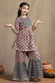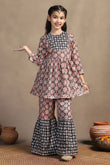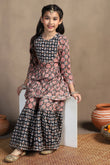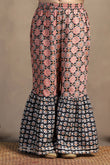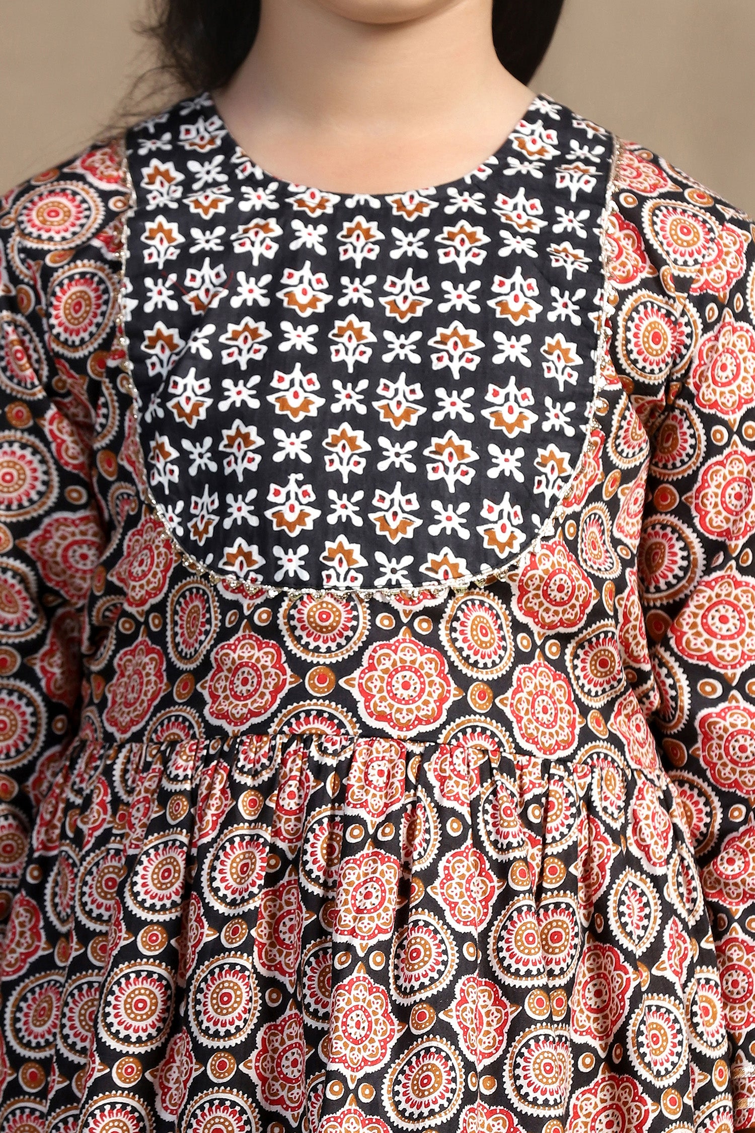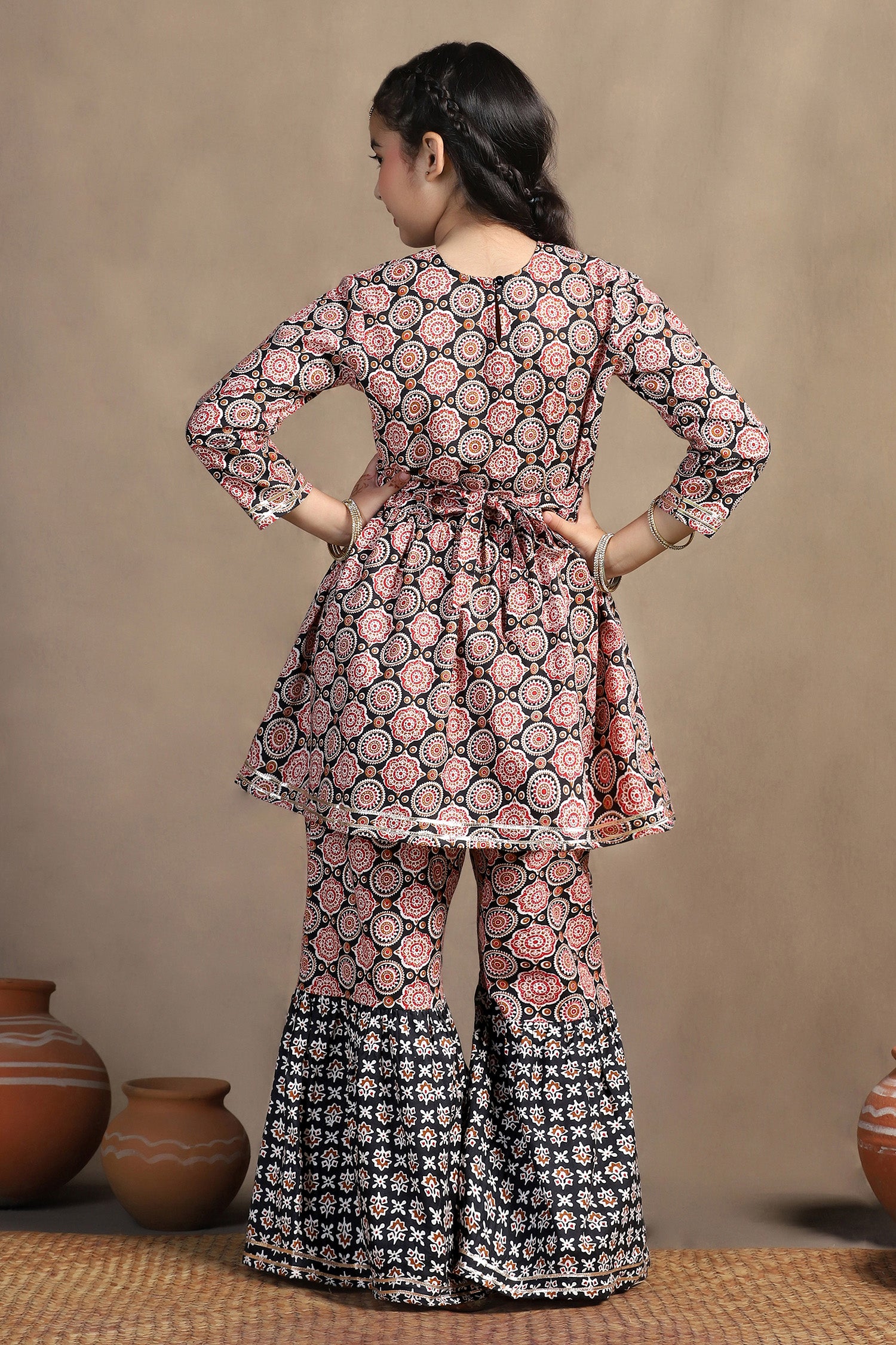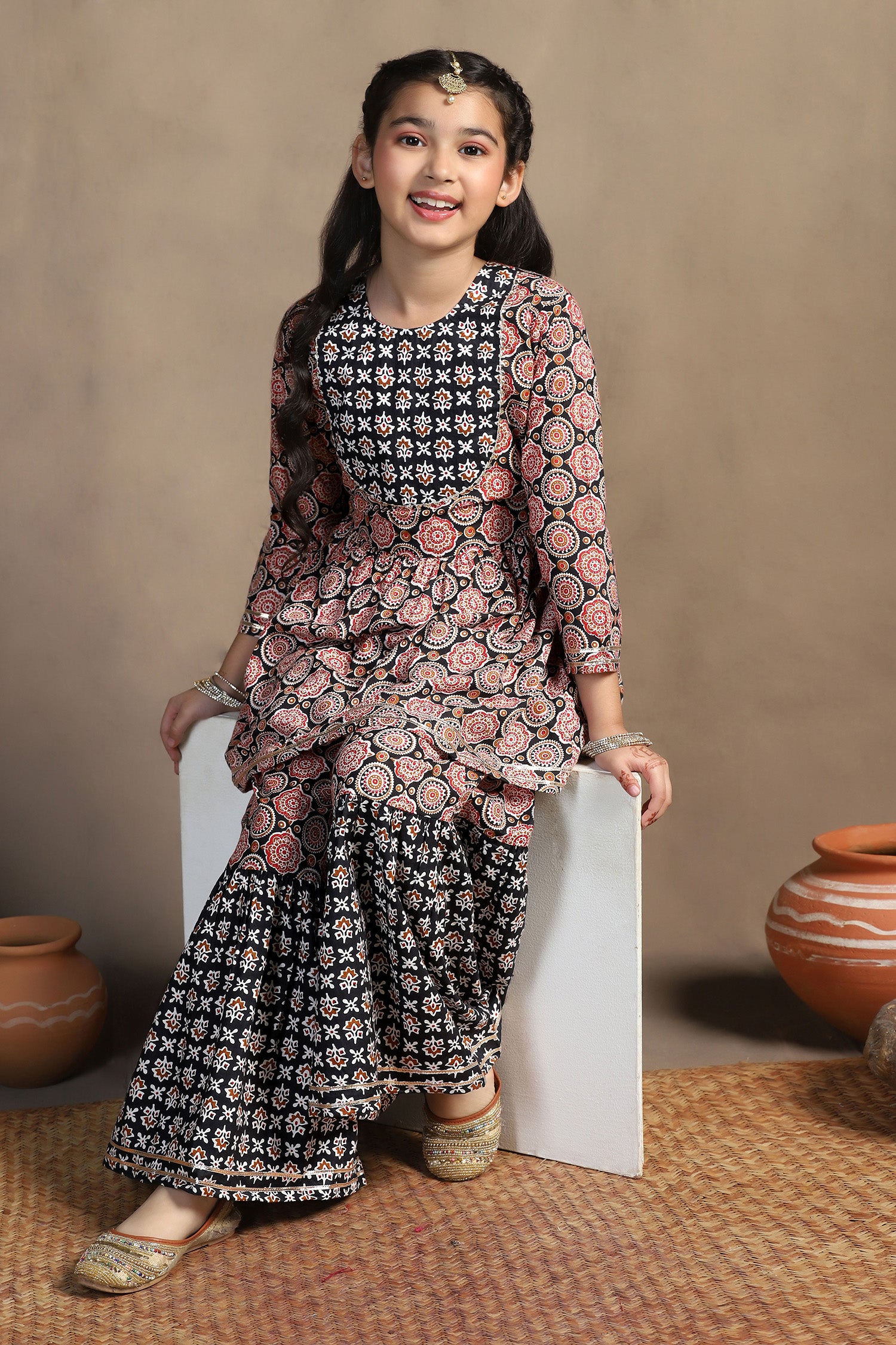 This anarkali kurta and Sharara Set completes your look for your special occasions. This stylish kurta and sharara set is made from comfortable cotton in a classic black color. The anarkali kurta features a vibrant floral print with a unique round neck, 3/4 Sleeves and elegant lace detailing. This kurta is complemented by the Sharara, which boasts a striking combination of Floral , along with an elastic closure for ease and comfort. Perfect for festive occasions or casual gatherings, this set combines traditional charm with contemporary style. Get ready your little girl for upcoming festive event by pairing this ethnic set with sandals, earrings and cute hair clips. "Note: The accessories and props used in these photoshoots are for aesthetic purposes only and may not be included in the final product or service."