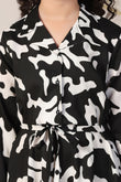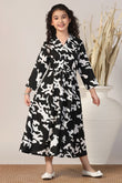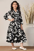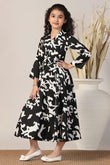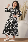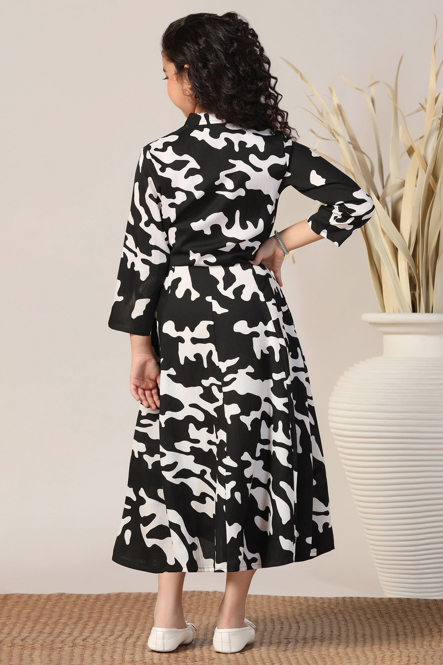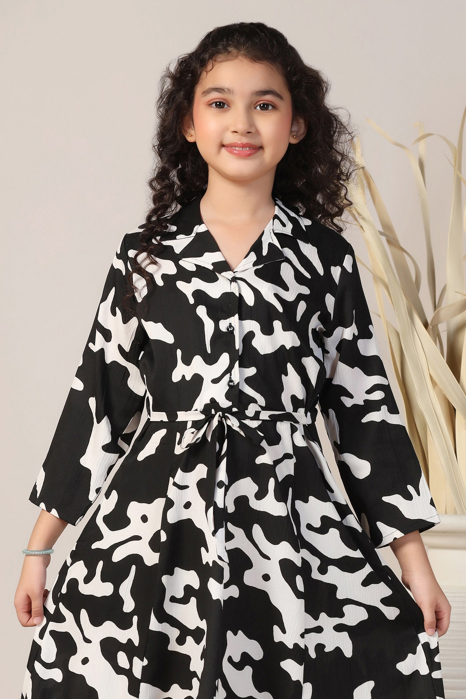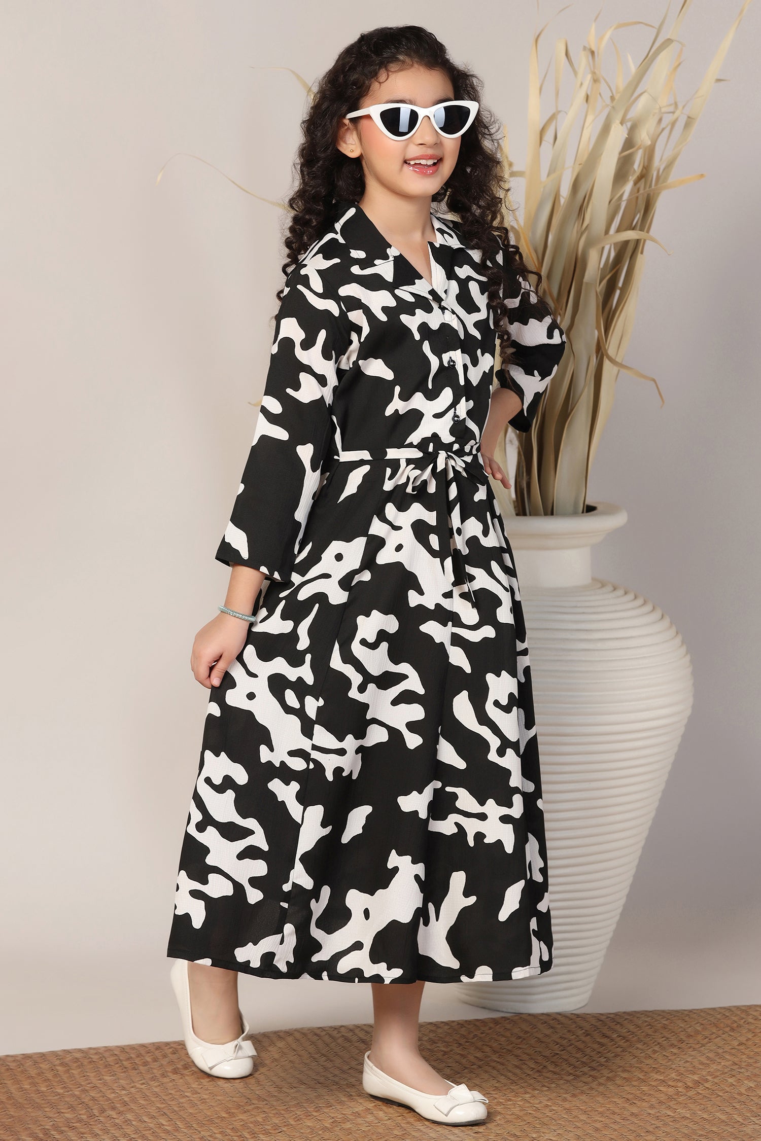 Dress up your little girl in this black printed dress from Fashion Dream. Style your girl's with some strappy sandals, statement earrings and a bright clutch for a classic look that will turn heads. Party perfection dress made for comfort and partying adds charm to your girl's fashion. Give a different look to your kids with this stylish abstract printed,calf-length,fit & flare dress. This frock is crafted from lightweight cotton blend fabric. The dress features Lapel collar neck, 3/4 sleeves with self attached belt which will make your girl more stylish enhancing its beauty.That will definitely add charm to your girls look. This girls frock is ideal for all everyday work, parties and outdoor activities. Pair this western outfit with high heels and a cute hairband for a complete look