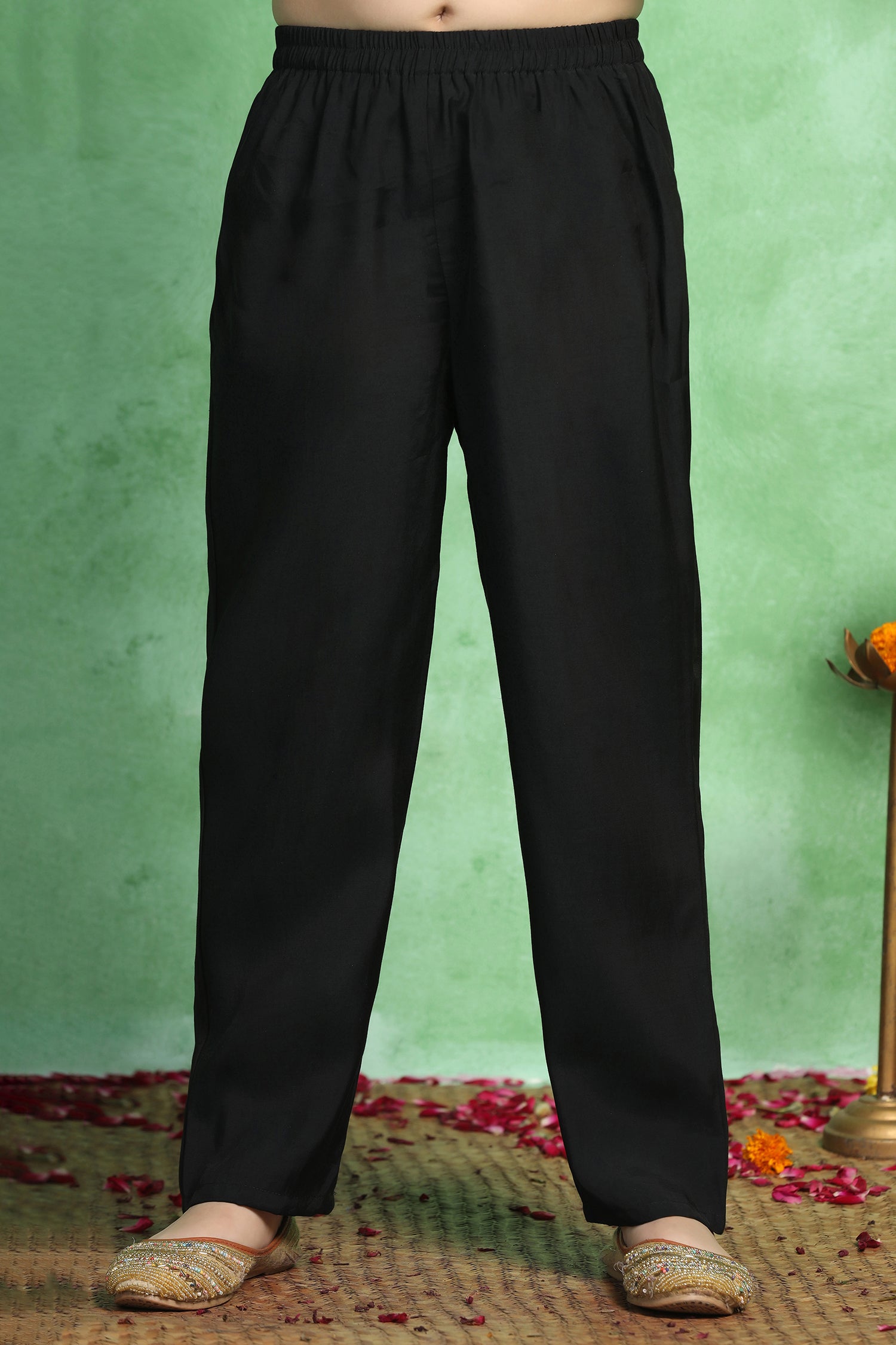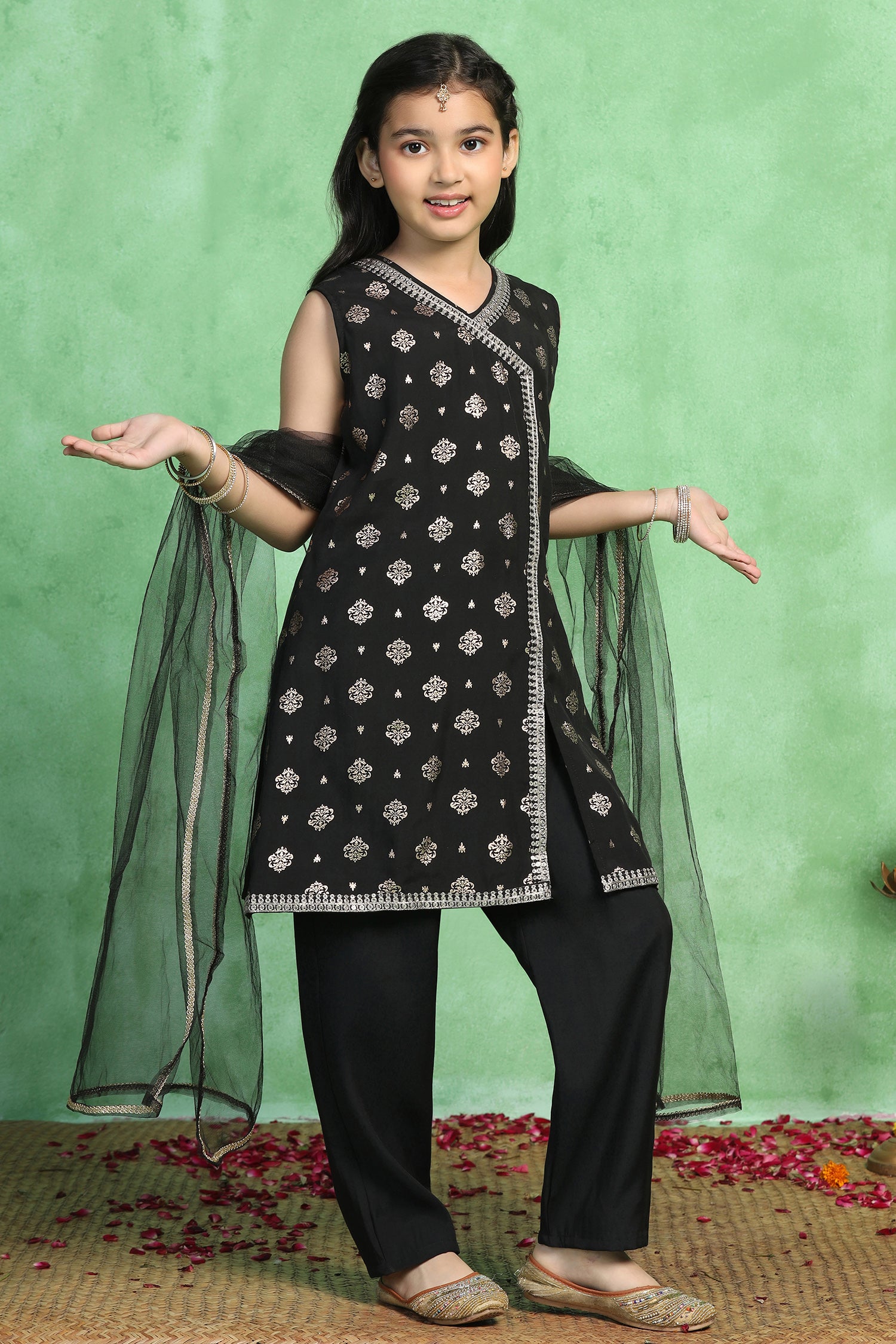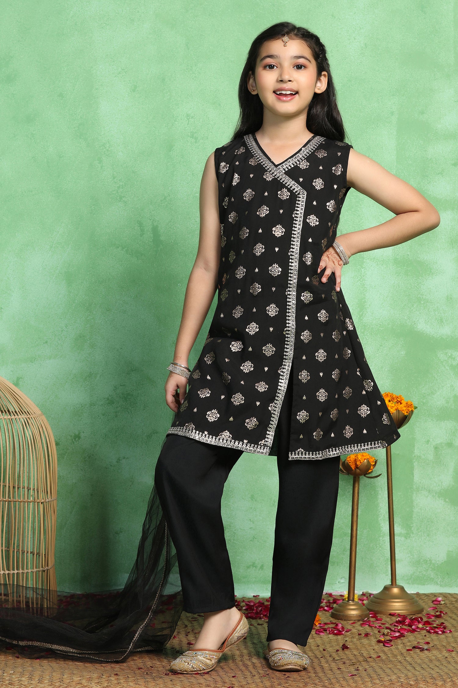 Refresh your wardrobe with this black colour salwar suit set with dupatta for girls. This knee length kurta and pant set for girls offers an elegant look for cultural gatherings and family occasions. The kid’s girl’s kurta set crafted from soft Roman silk with a smooth crepe lining, features a classic V-neck, sleeveless, intricate lace detailing on the yoke and hemline, Back button closure for adjustable fit. Round style for ease of movement. The pant is ankle-length with a fully elasticated waistband for comfort, designed in a flared silhouette that adds volume and charm ethnic wear. Completing the look is a lightweight dupatta adorned with lace trim for a polished finish ethnic wear for kids’ girls. Pair it with matching earrings and sandals to complete the casual yet fashionable look. “Note: Accessories and props shown in images are for styling purposes only and not included with the outfit.”