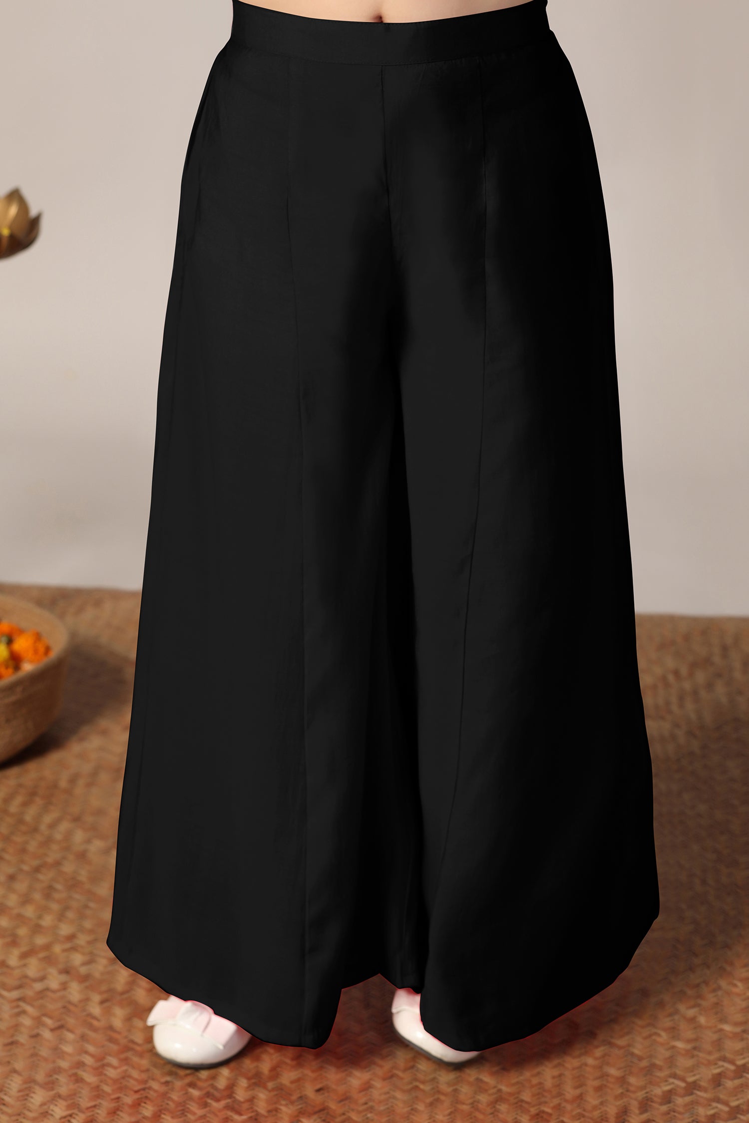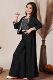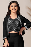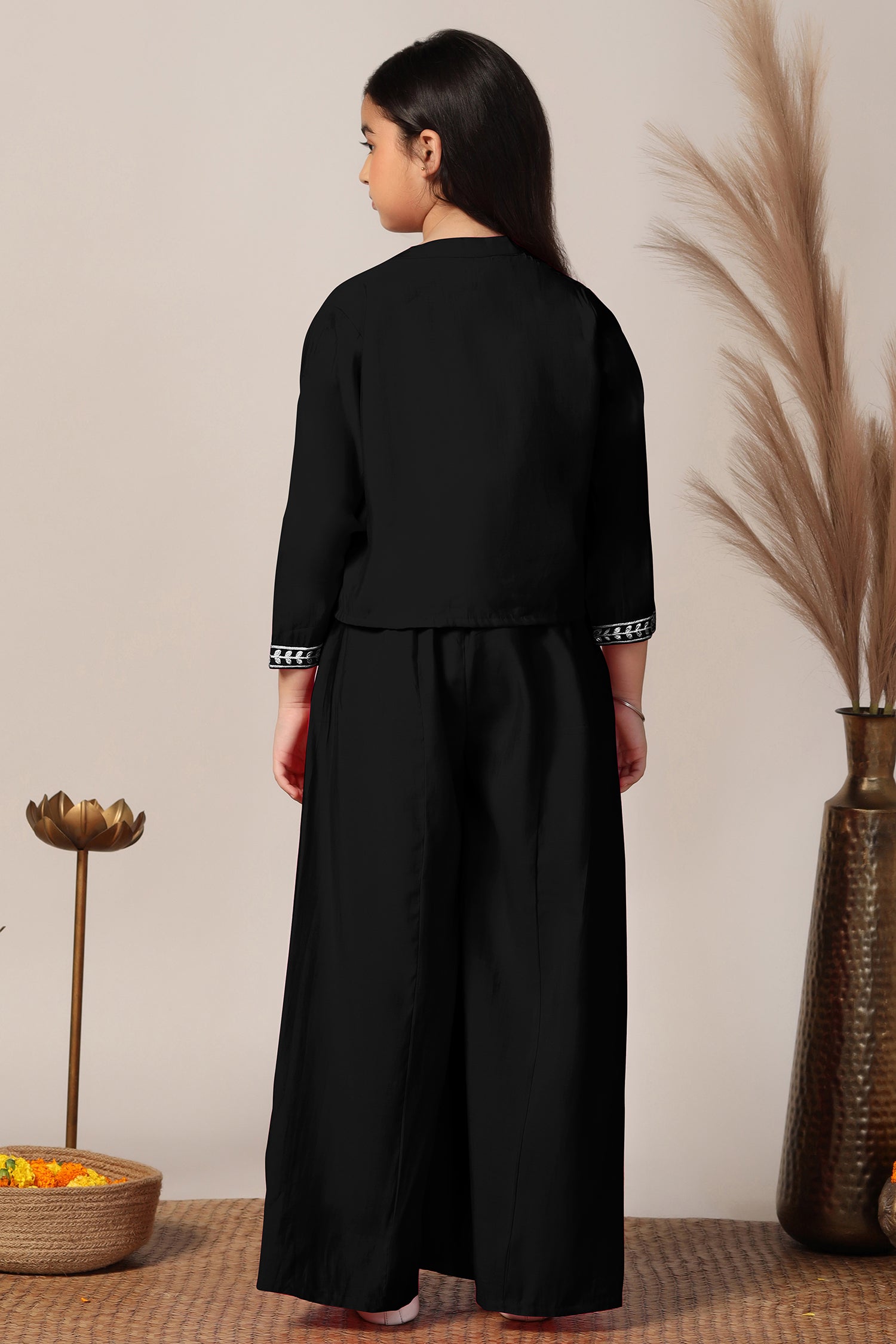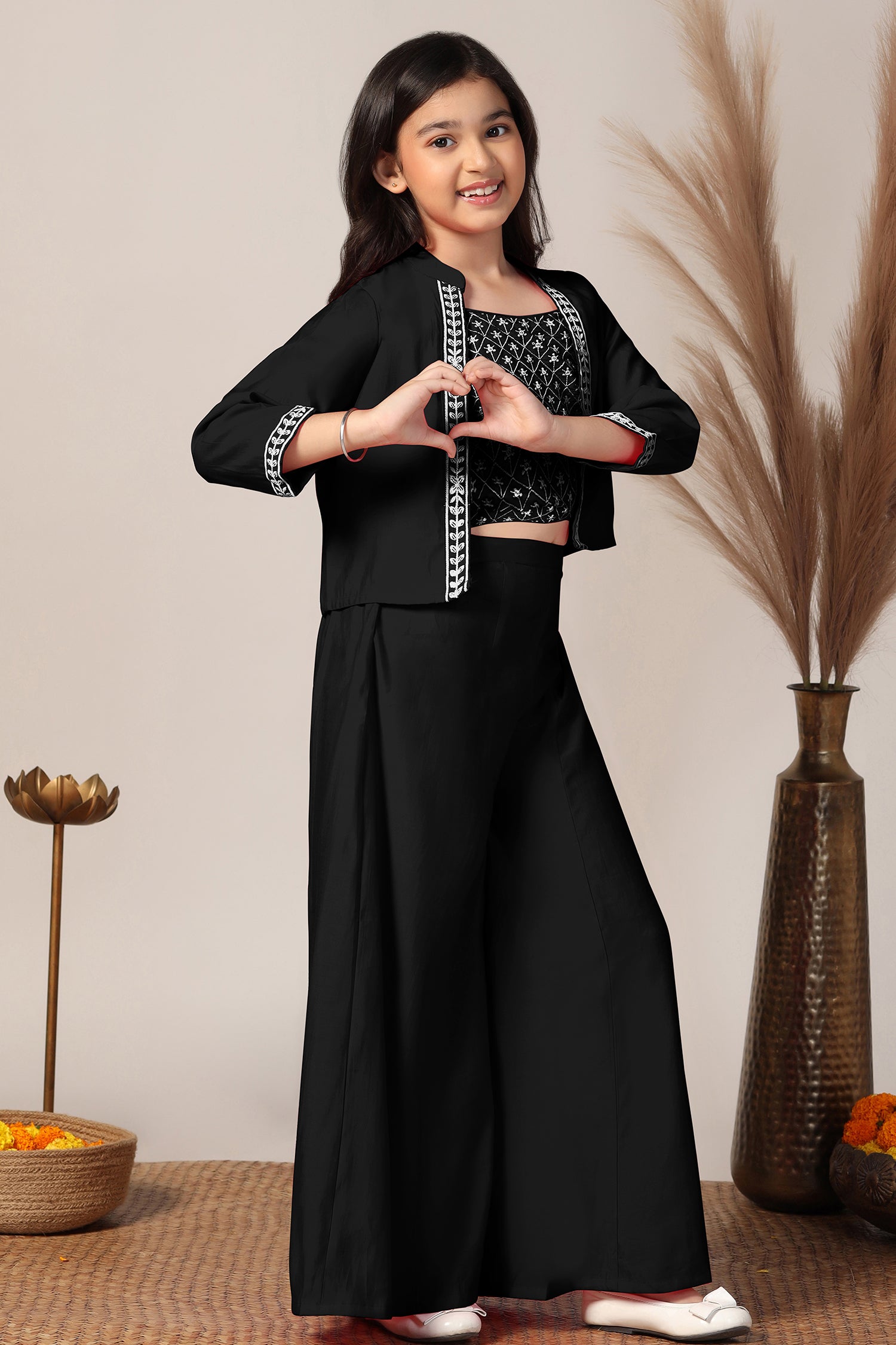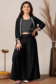 Girls Black Silk Blend Embroidered Crop Top And Jacket With Palazzo Set