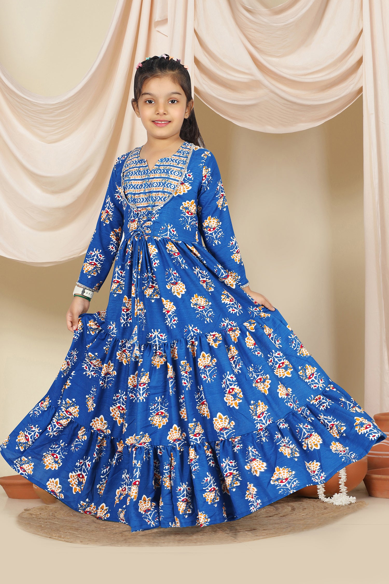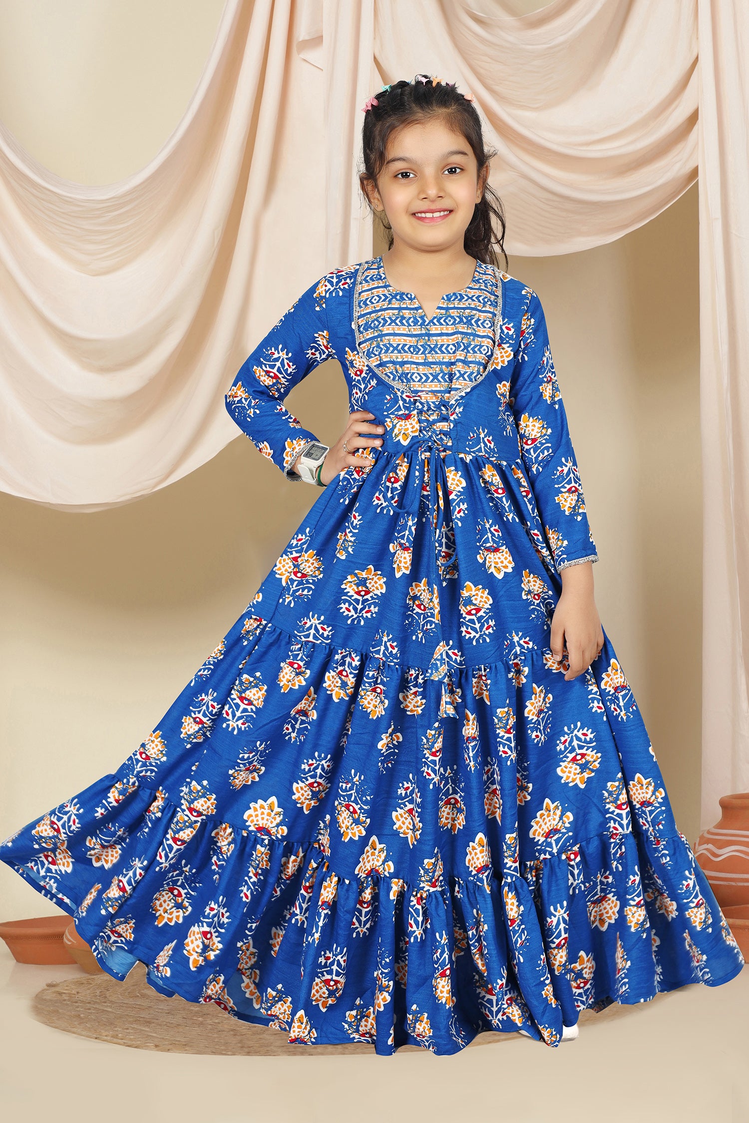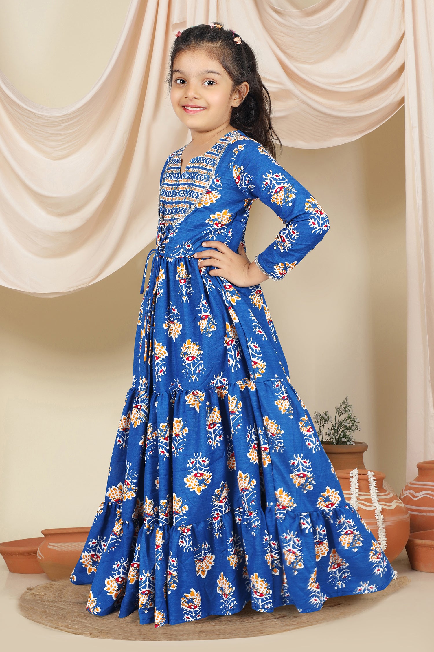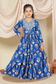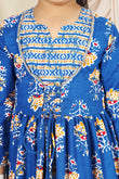 Dress your little girls with this blue colored maxi length kids dress from Fashion Dream Pair it up with a cute hair accessory and closed shoes for her to shine at the best friend’s birthday party. Add a touch of elegance and charm to your girl's wardrobe with this stunning floral printed maxi dress. Crafted in cotton blend fabric this dress features notch neck, 3/4th sleevees, along lace detailing over neckline and hemline. This fit and flare style dress comes with front drawstring for perfect and comfortable fit, button closure at back side and flared silhoutte makes it ideal for both party wear and festive wear. Style this dress with her favourite flats or heels and use light jewellery to make her look more beautiful.