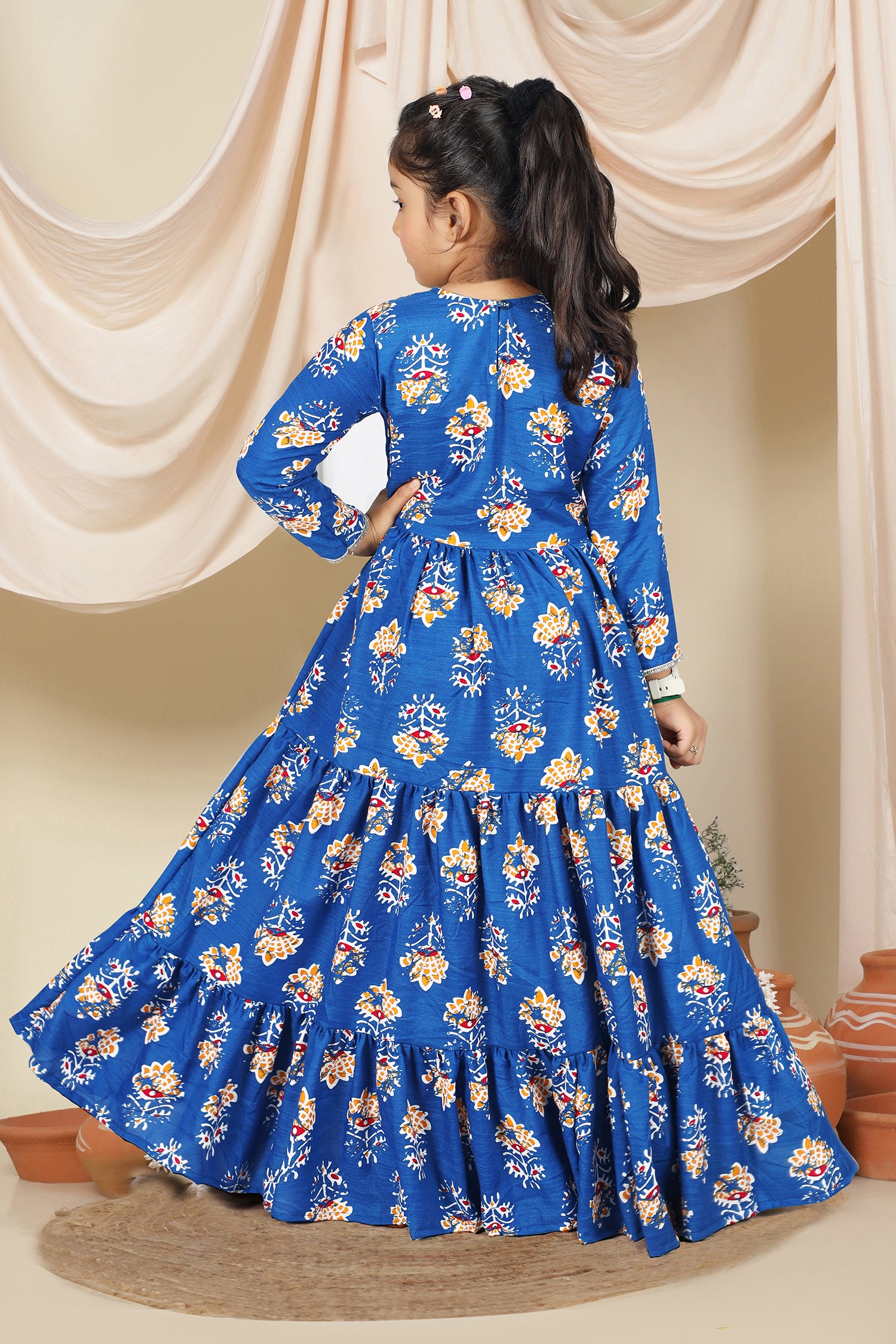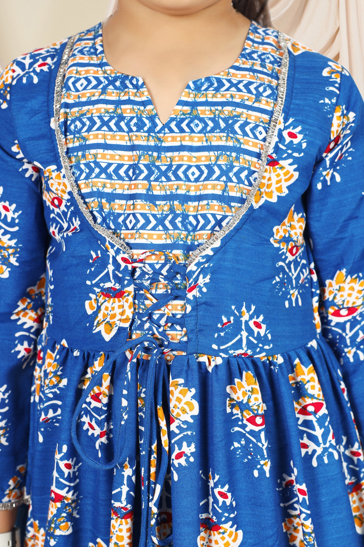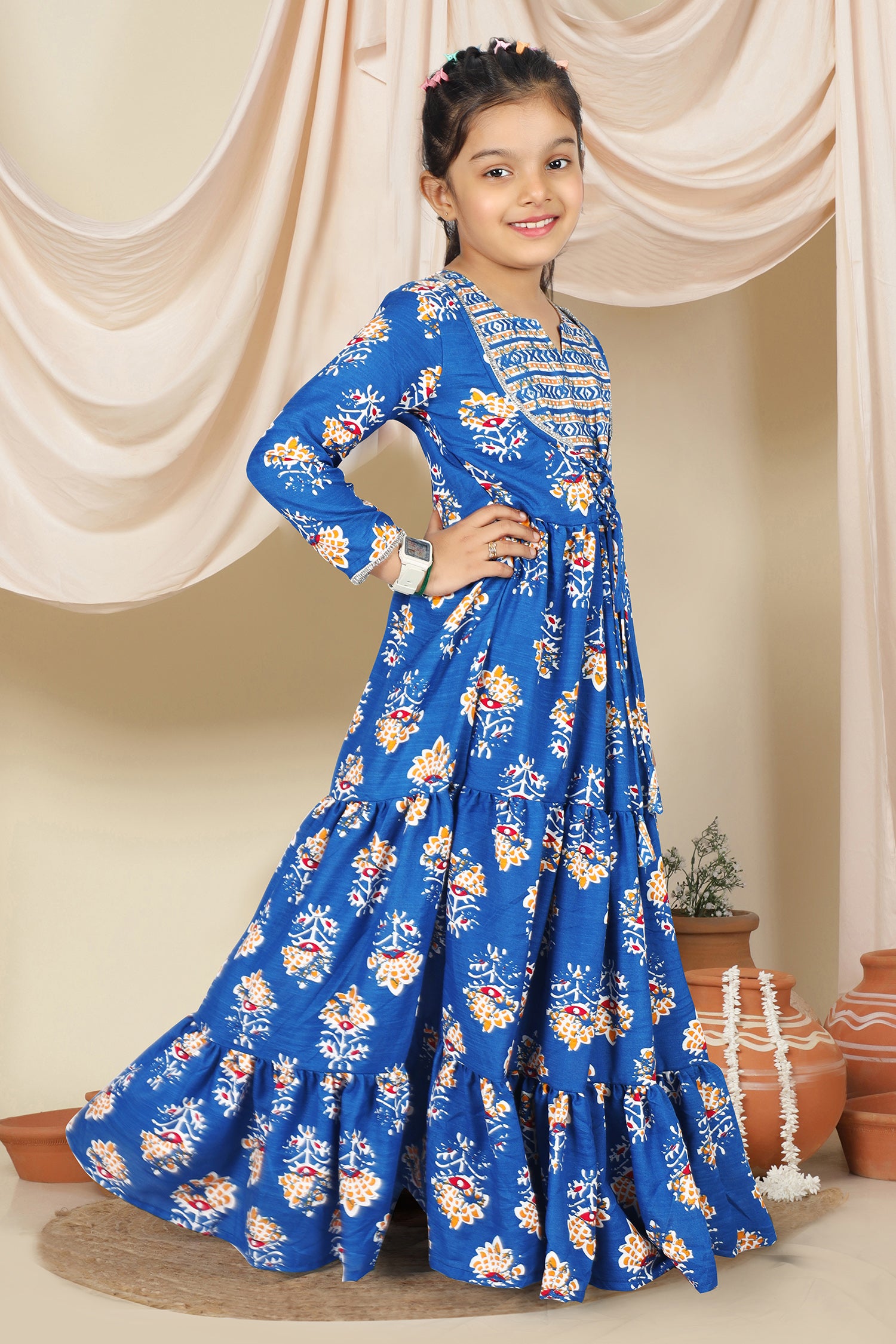 Dress your little girls with this blue colored maxi length kids dress from Fashion Dream Pair it up with a cute hair accessory and closed shoes for her to shine at the best friend’s birthday party. Add a touch of elegance and charm to your girl's wardrobe with this stunning floral printed maxi dress. Crafted in cotton blend fabric this dress features notch neck, 3/4th sleevees, along lace detailing over neckline and hemline. This fit and flare style dress comes with front drawstring for perfect and comfortable fit, button closure at back side and flared silhoutte makes it ideal for both party wear and festive wear. Style this dress with her favourite flats or heels and use light jewellery to make her look more beautiful.