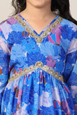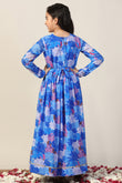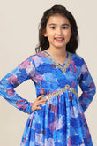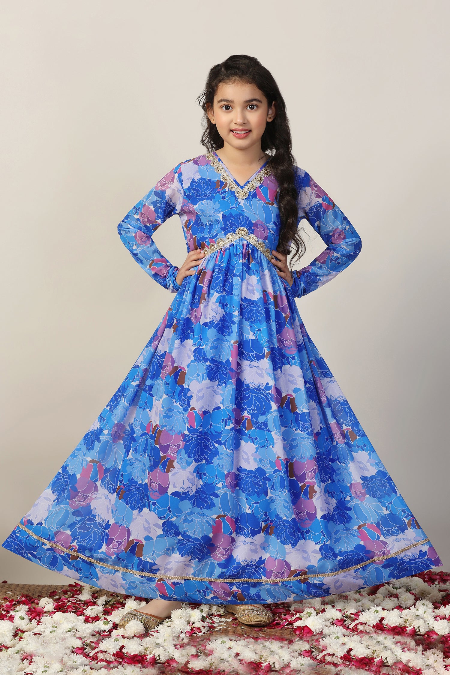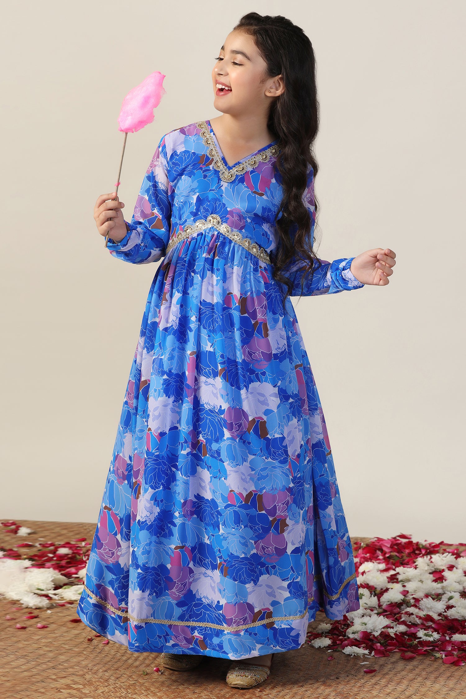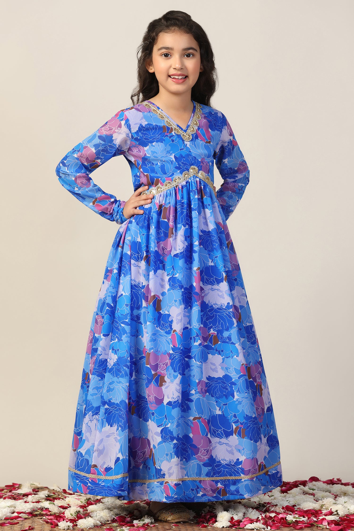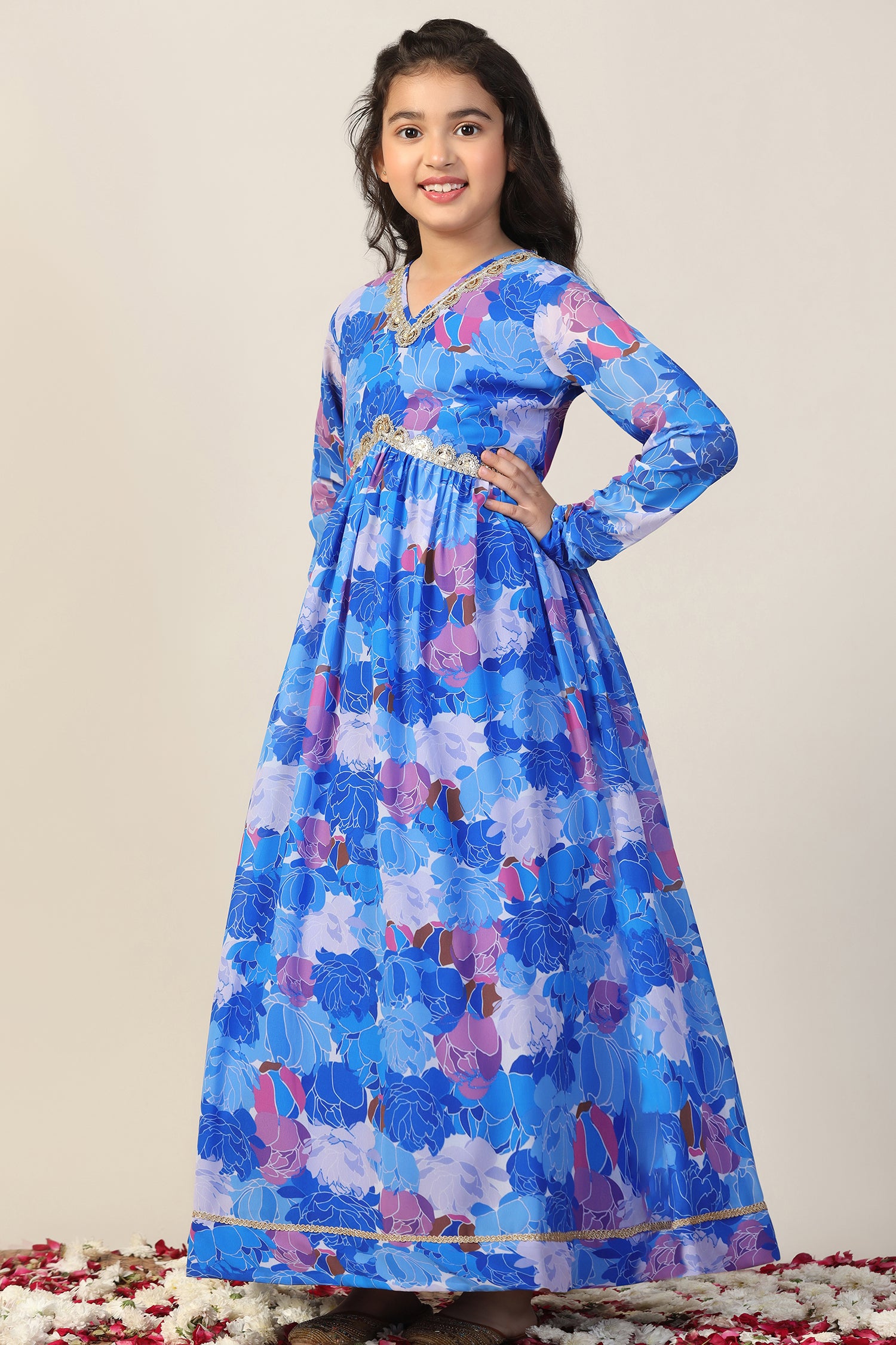 Dress your little girls with this blue Full Maxi length dress from Fashion Dream. Pair it up with a cute hair accessory and closed shoes for her to shine at the best friend’s birthday party. Add a touch of elegance and charm to your girl's wardrobe with this stunning Maxi Full length dress. Crafted in cotton blend with floral print all over. This stylish dress features a V-neck and long ruched sleeve, it has back closure zip and Pleated Fit & flared silhouette and an intricated Lace Detailing on the yock which creates a stunning look. This fit and flare Maxi dress with self fabricated belt makes it ideal for both casual and festive wear. Style this dress with her favourite flats or heels and use light jewellery to make her look more beautiful. Note: The accessories and props used in these photoshoots are for aesthetic purposes only and may not be included in the final product or service."