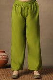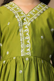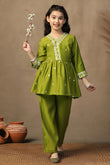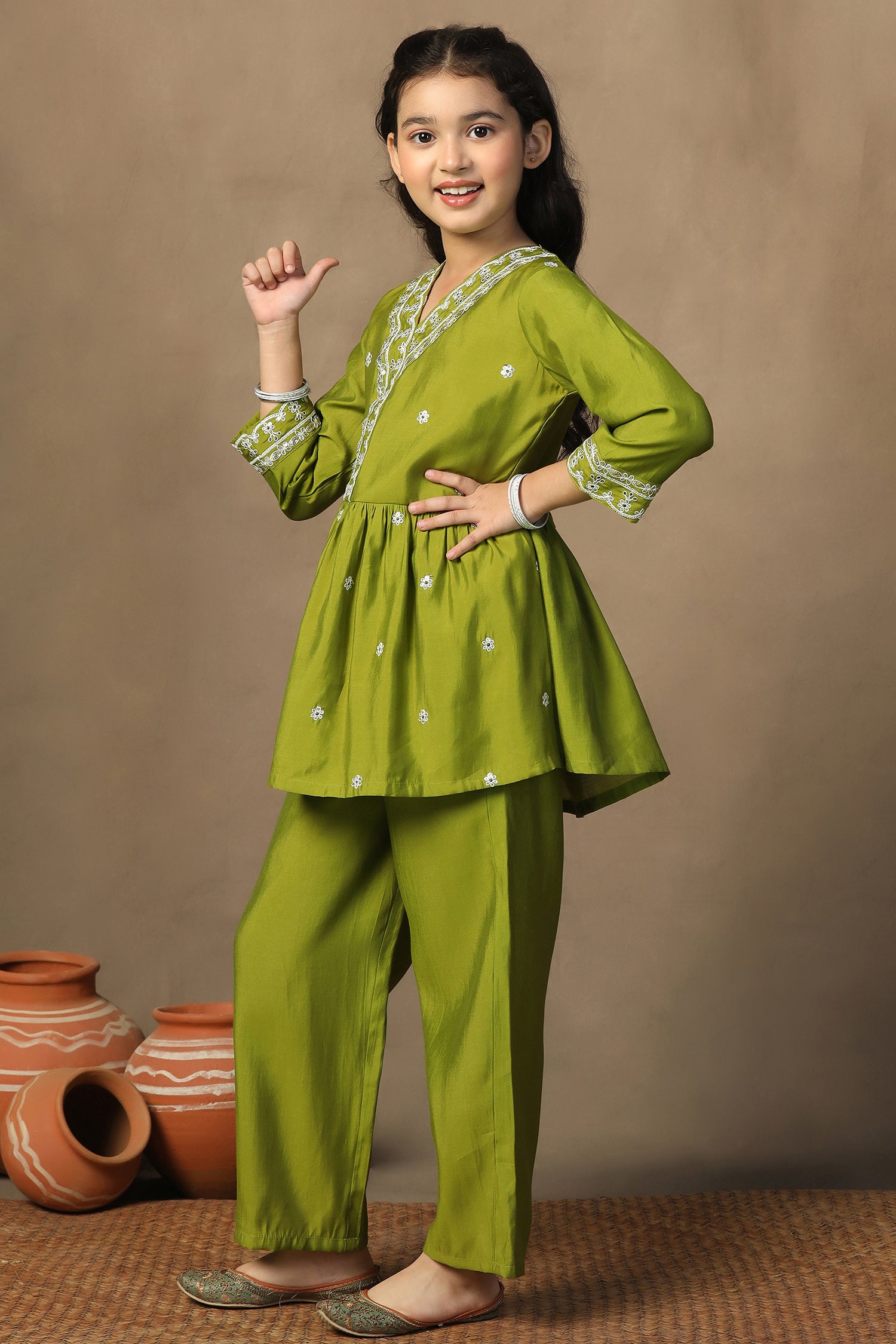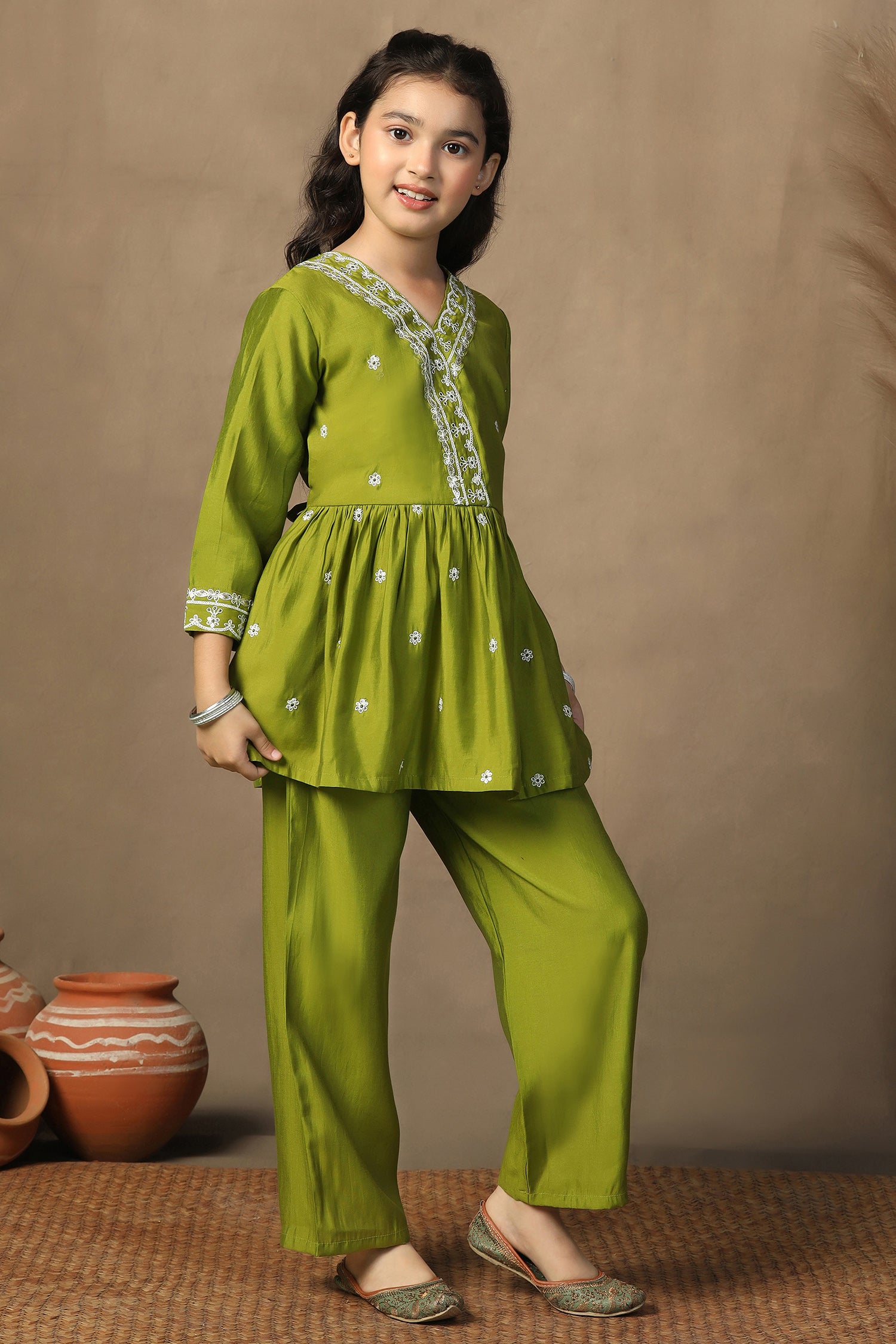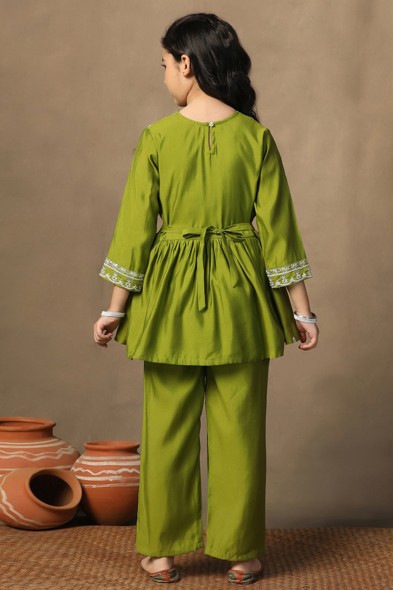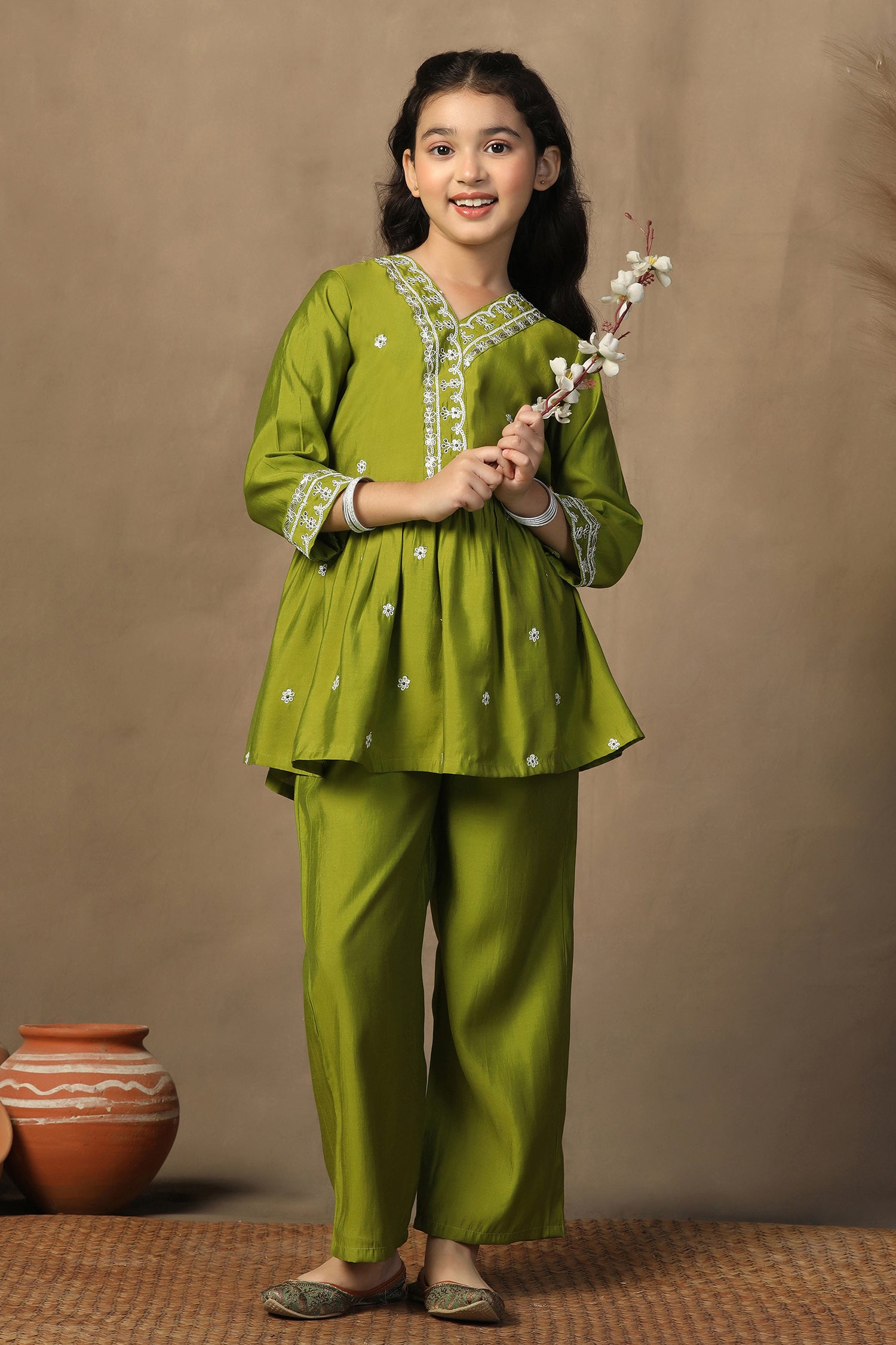 Bring timeless grace to your child’s festive wardrobe with this mehndi salwar suit set for girls, crafted from lightweight and breathable Chanderi silk that lends a soft shine and elegant drape. This ethnic wear for girls features a flared peplum-style kurta with floral embroidery along the yoke and sleeve hem, complemented by 3/4th sleeves, a V-neckline, and a back button closure with a self-fabricated belt for adjustable comfort. The ankle-length straight pant is designed with a fully elasticated waistband for easy movement, making it perfect for celebrations and day-long functions. Whether you’re looking for a suit set for girls for a wedding, a modest yet stylish punjabi suit for girls, or a contemporary ethnic set for girls that blends tradition with comfort, this outfit checks every box. A versatile choice for cultural events or gifting, it also fits right into wardrobes browsing for suit for kids girls with a balance of modern fit and festive detail. Note: Accessories and props shown in the images are for styling purposes only and are not included with the product.