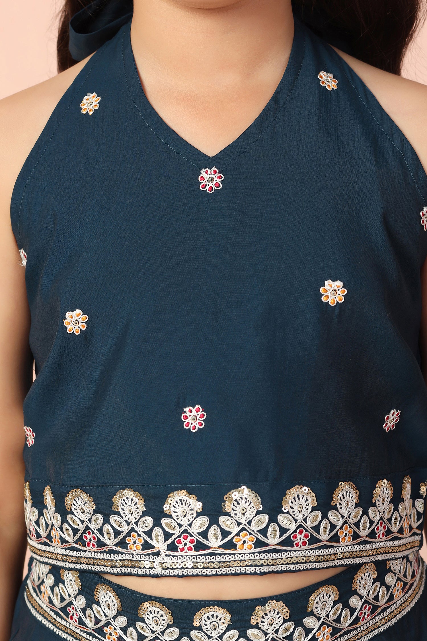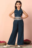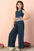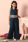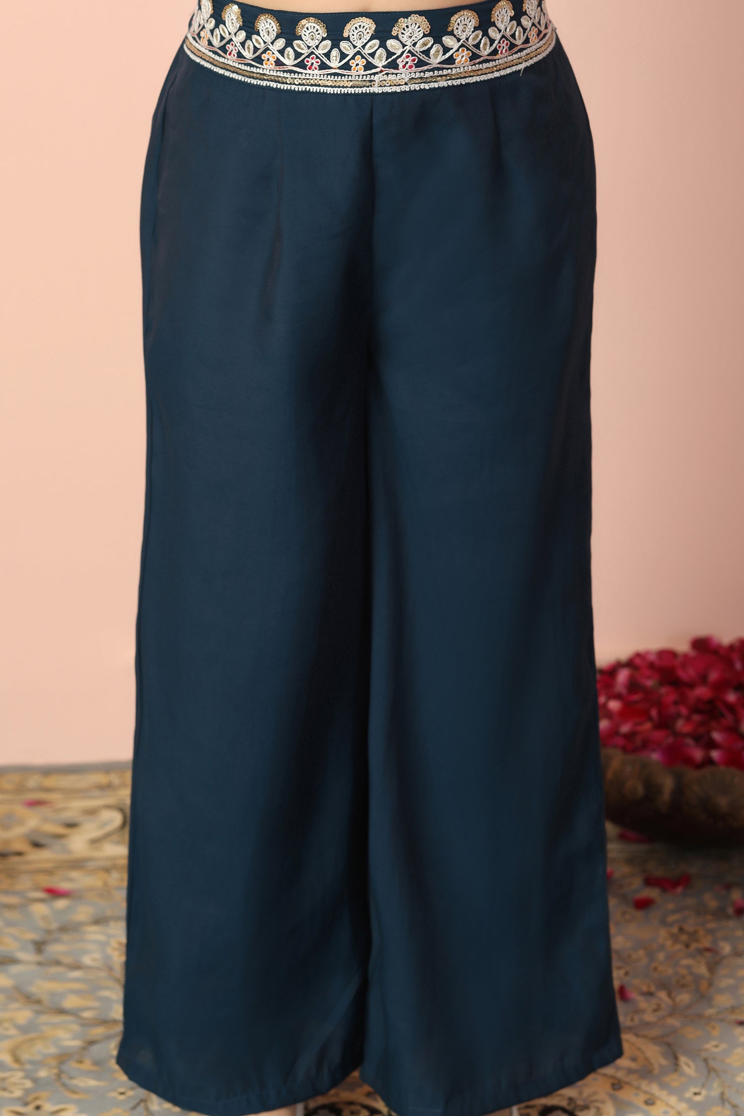 Refresh your wardrobe with this dark blue color set from Fashion Dream. This casual wear ethnic set completes your look for outings. Get the perfect blend of elegance and comfort with our embroidered set. This set is made from chanderi fabric that is light and comfortable to wear. This set features mandarin collar neck, full puff sleeves, front button closure, intricated floral embroidery on shirt. It has lace detailing on hemline, it come along with matching solid palazzo bottom fully elasticated this casual wear is designed with keeping style, fashion and comfort in mind. Pair it with matching earrings and sandals to complete the casual yet fashionable look. "Note: The accessories and props used in these photoshoots are for aesthetic purposes only and may not be included in the final product or service."