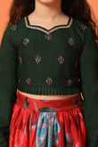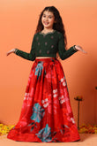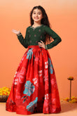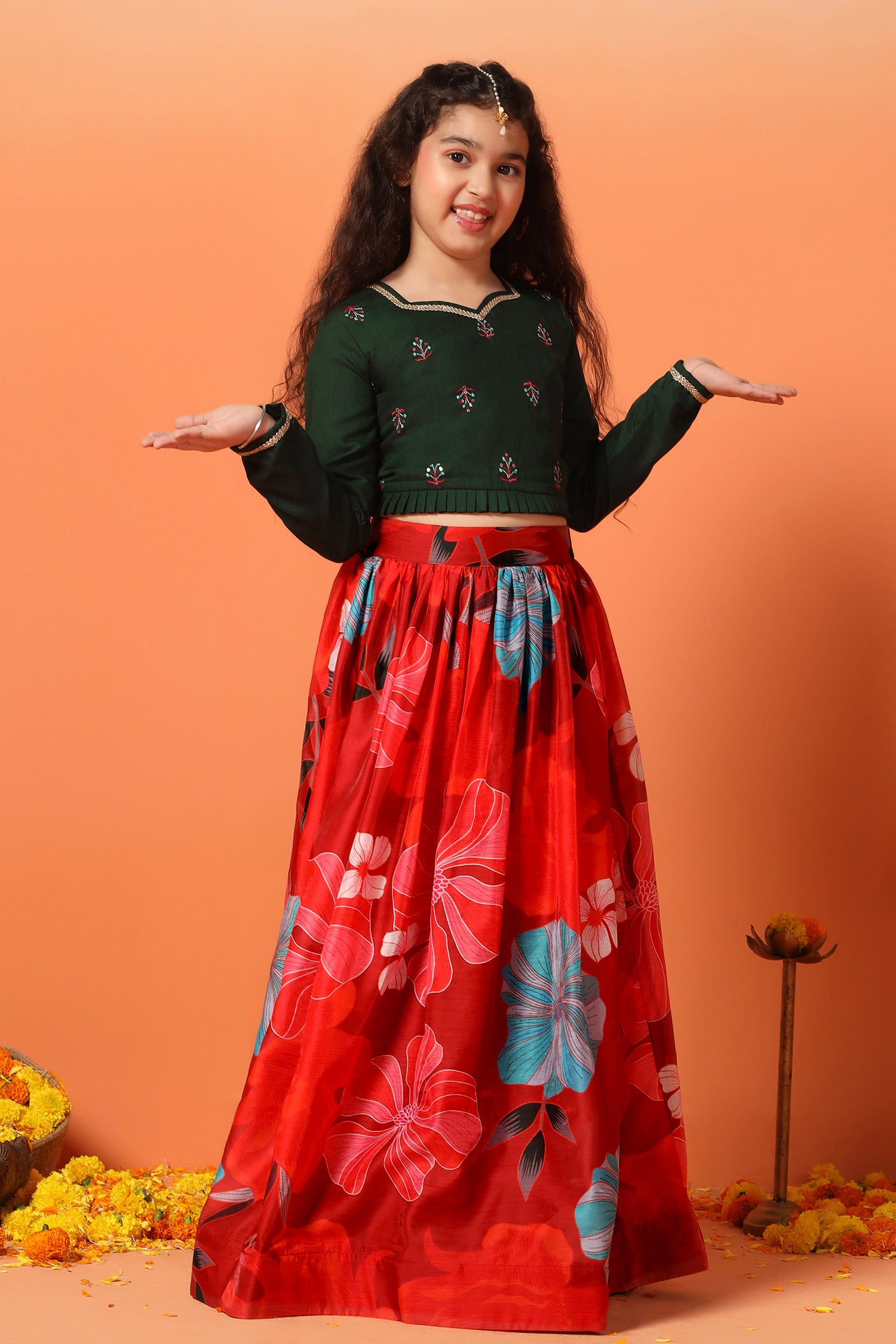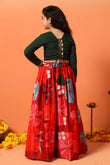 Shop from a wide range of beautifully crafted Lehenga Choli Sets from Fashion Dream. Pair this piece with heels or flats and matching jewellery for a stunning look. This elegant Lehenga Choli Set is designed in soft green Chanderi silk with a touch of festive charm. The choli comes with long sleeves, a sweetheart neckline highlighted with golden lace detailing, and delicate embroidery on the yoke and hem. The pleated hemline adds a structured finish, while the lace-up drawstring closure at the back ensures a secure and stylish fit. The flared lehenga is crafted in a vibrant floral base with bold floral prints in contrasting, designed with a partially elasticated waistband for maximum comfort. A matching dupatta with golden lace border completes the set, making it the perfect choice for weddings, family gatherings, and festive events.
