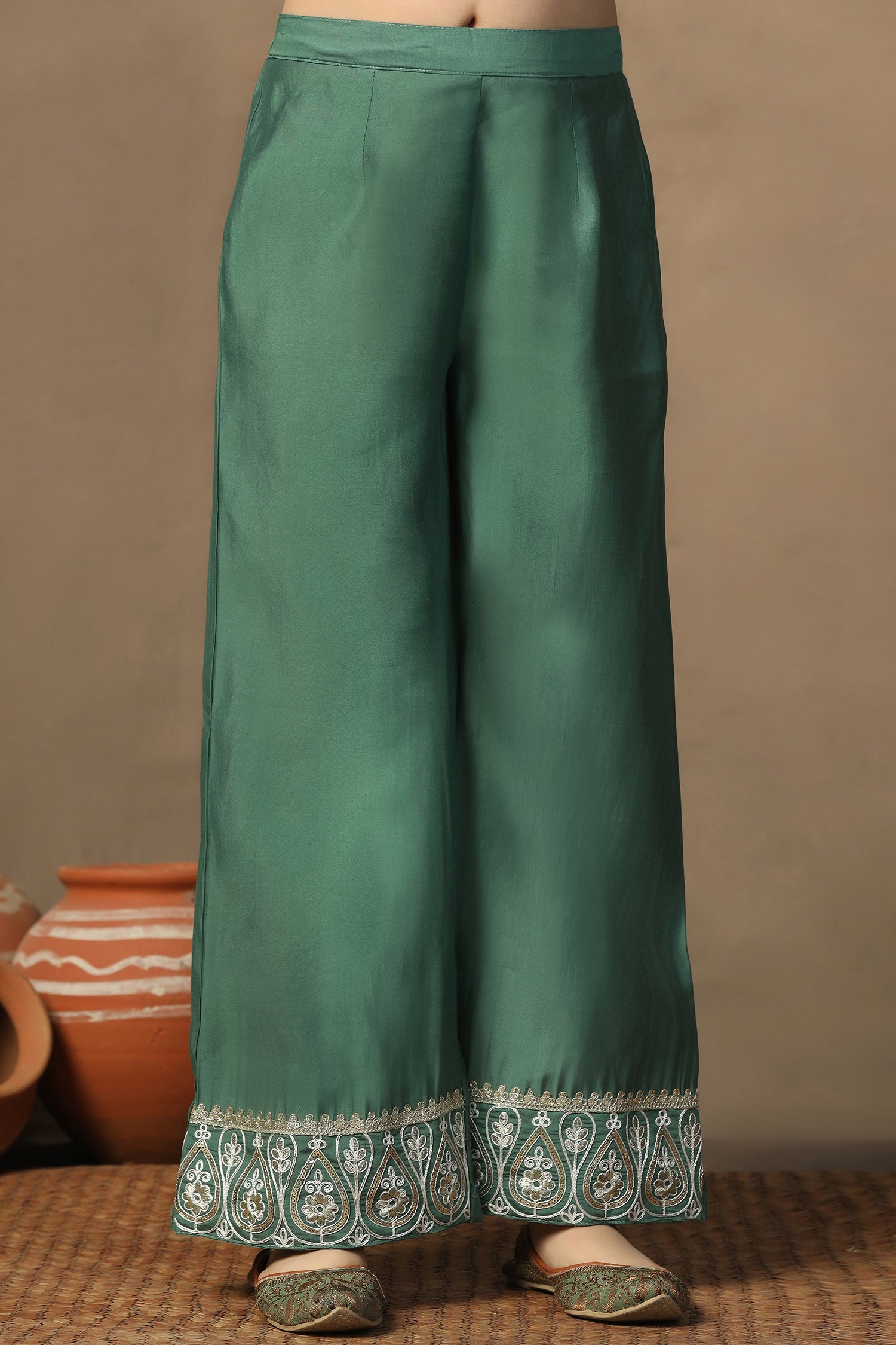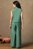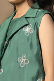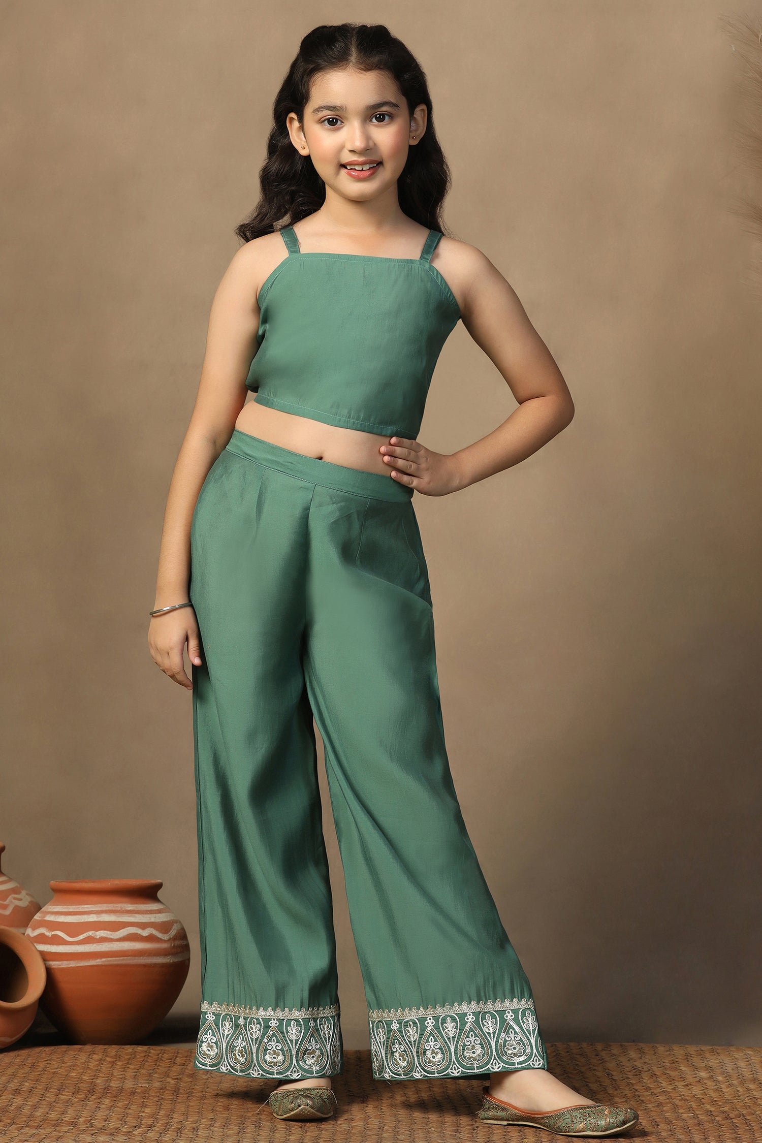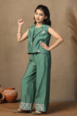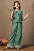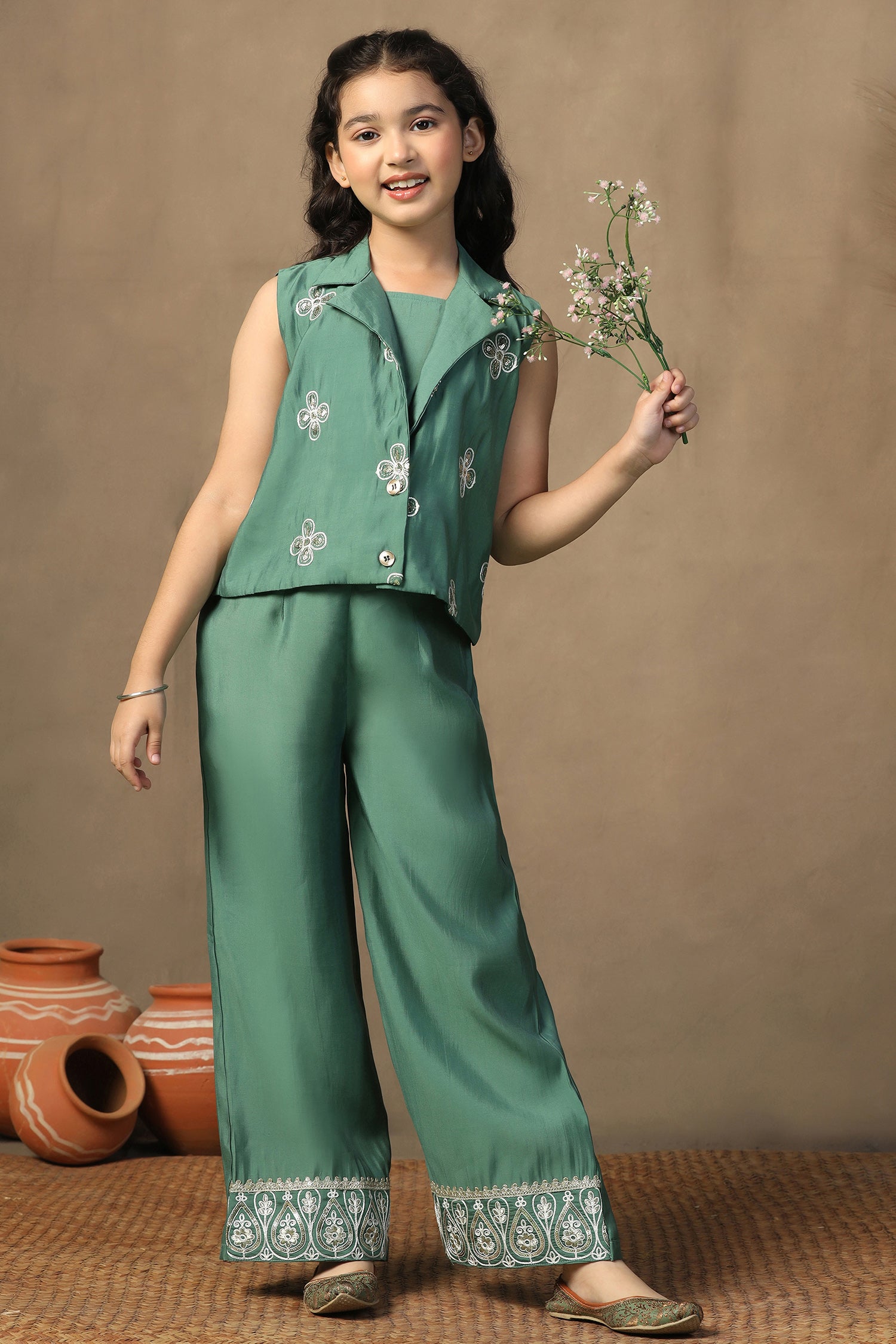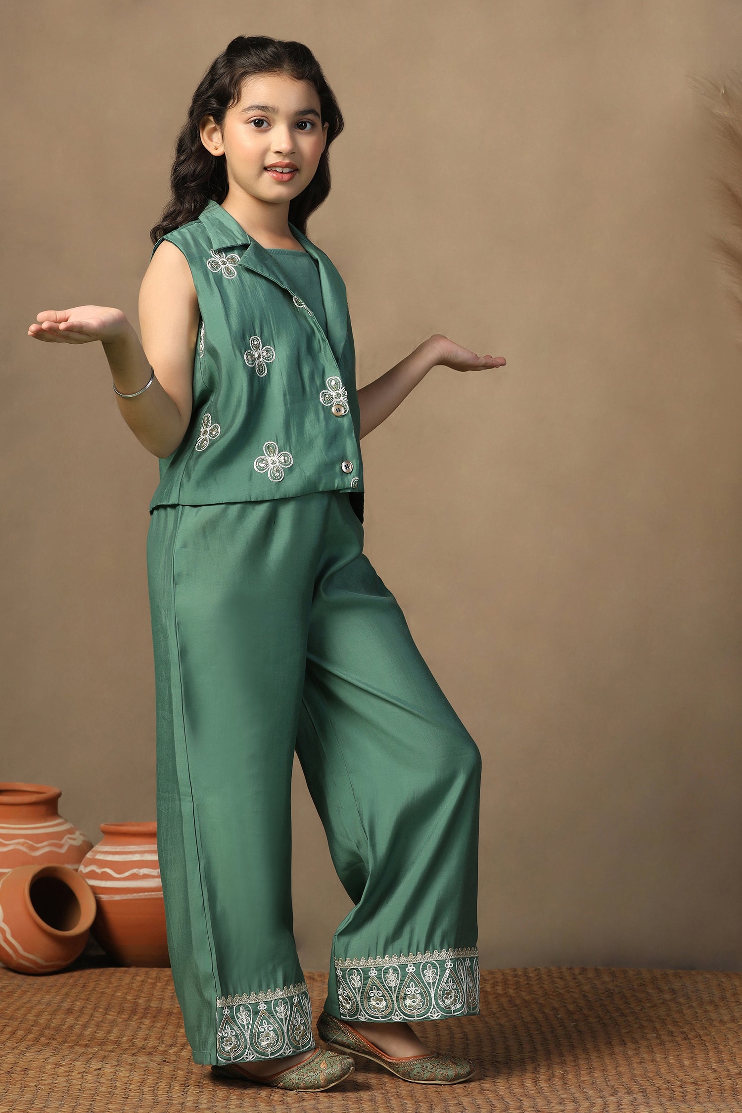 Shop a wide range of Girls Ethnic Sets from Fashion Dream. Perfect for festive occasions and family gatherings. This elegant girls ethnic set in a soft green Chanderi silk fabric is designed to combine traditional charm with modern appeal. The sleeveless crop top comes with a simple square neck, keeping the look chic and comfortable. Layered over it, the embroidered jacket features a lapel collar, button closure, and delicate thread floral that add grace and detail to the outfit. The highlight of this set is the matching palazzo, tailored for ease of movement and adorned with exquisite embroidery at the hemline for a festive touch. The partially elasticated waistband ensures comfort and flexibility, making this outfit perfect for long celebrations. Whether worn for weddings, festive gatherings, or cultural programs, this ethnic set offers both style and comfort. Pair it with ethnic juttis, bangles, and a small clutch to complete a charming festive look. A versatile pick for weddings, festive events, or as a girls dress 12-13 years new fashion. ethnic wear for kids girls, girls dress 12-13 years new fashion, suit for girls, salwar suit for kids girls, biba girls, traditional dress for kids girls, kids ethnic wear girls, dress for girls 12-13 years, kurti set for girls, girls ethnic wear, kurta set for girls, indo western dress for girls, kids kurta set girls, kids suit for girls, kurti for girls 13-14 years stylish. Note: Accessories and props shown in the images are for styling purposes only and not included with the outfit. Note: Accessories and props shown in images are for styling purposes only and not included with the outfit.