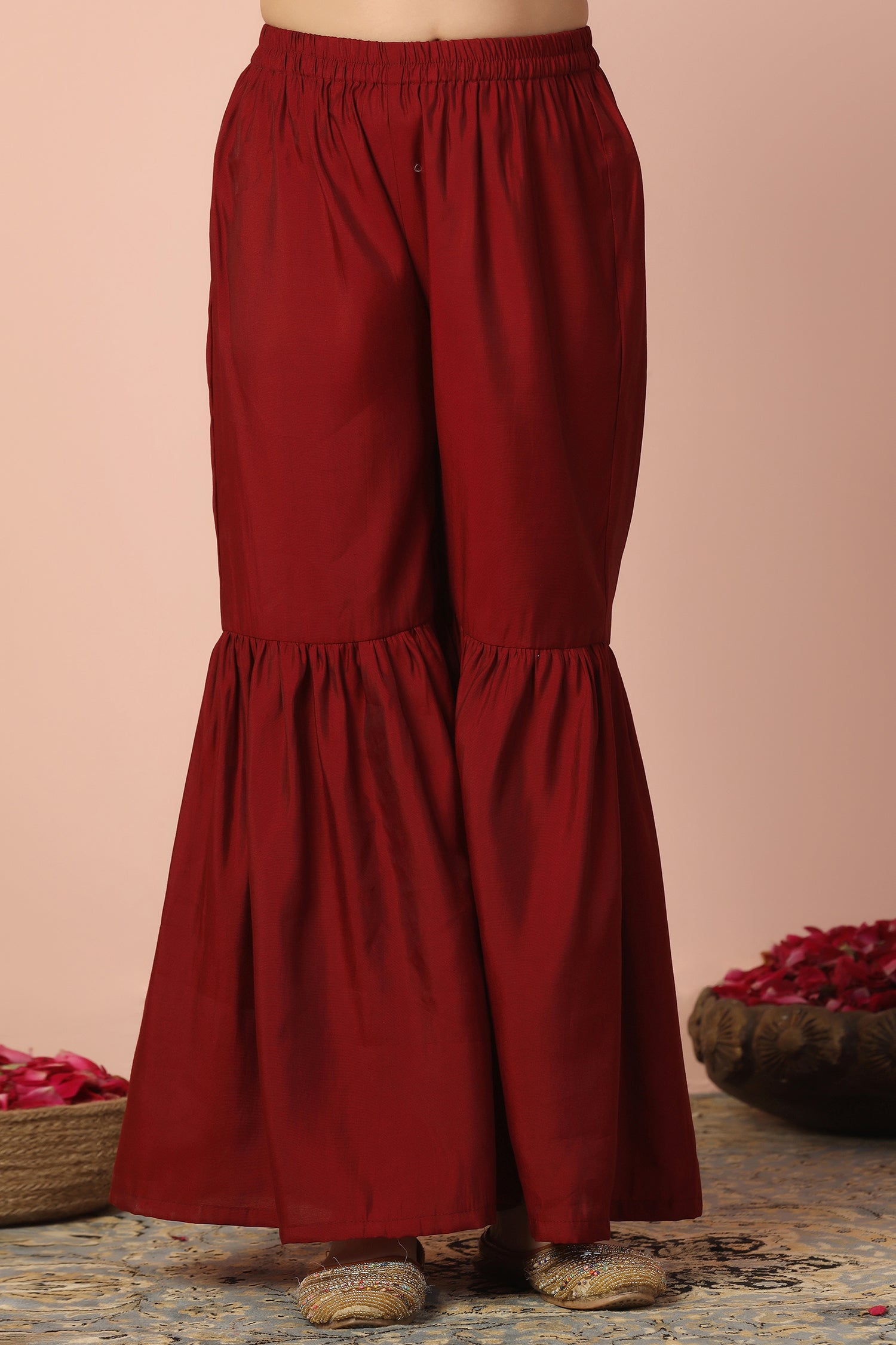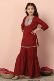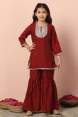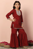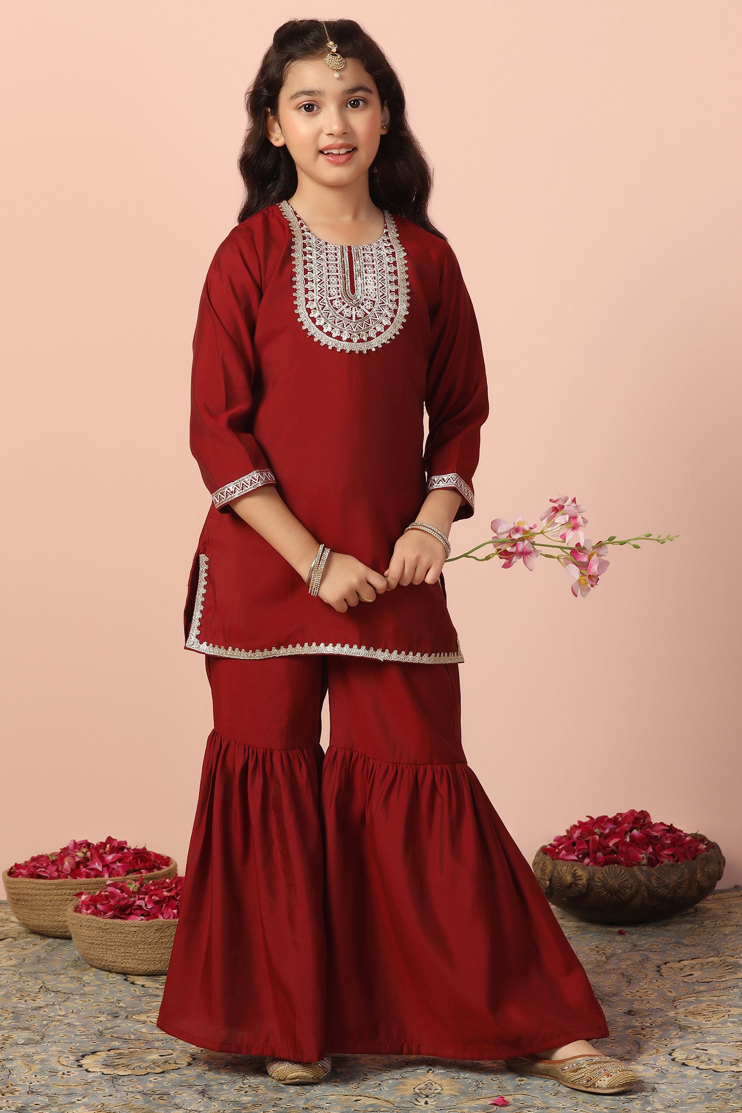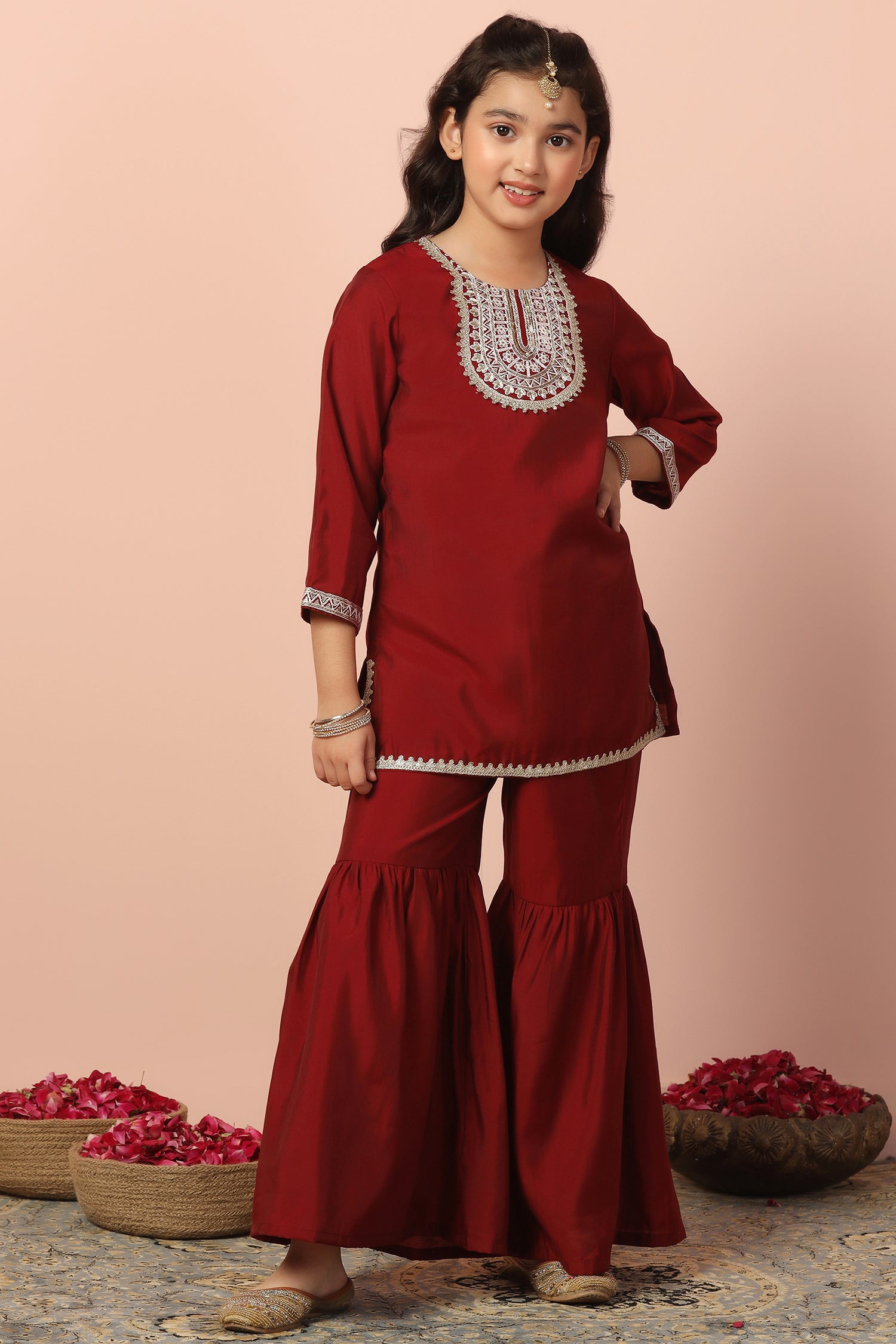 Refresh your wardrobe with this salwar suit set for girls from Fashion Dream. This short style kurta and sharara set for girls is designed to bring elegance and comfort to cultural gatherings and special occasions. The kids girls kurta set crafted from luxurious Chanderi silk with a smooth crepe lining, features a classic round neck, 3/4th sleeves, detailed embroidery on the yoke and hemline, and functional side slits for ease of movement ethnic wear. The button closure ensures a secure fit while enhancing its traditional charm. The sharara is ankle-length with a fully elasticated waistband, offering both comfort and a voluminous, graceful look ethnic wear for kids girls. Pair it with matching earrings and sandals to complete the casual yet fashionable look. This sharara set also works beautifully as sharara set for girls, suit for girls, ethnic wear for kids girls, punjabi suit for kids girls, traditional dress for kids girls, kurta set for girls, girls ethnic wear, patiyala dress for girls kids, kids kurta set girls, kurti for girls 13-14 years stylish, dress for girls 12-13 years, kurta for girls, kids suit for girls, girls suit, kurti set for girls. Note: Accessories and props shown in images are for styling purposes only and not included with the outfit.