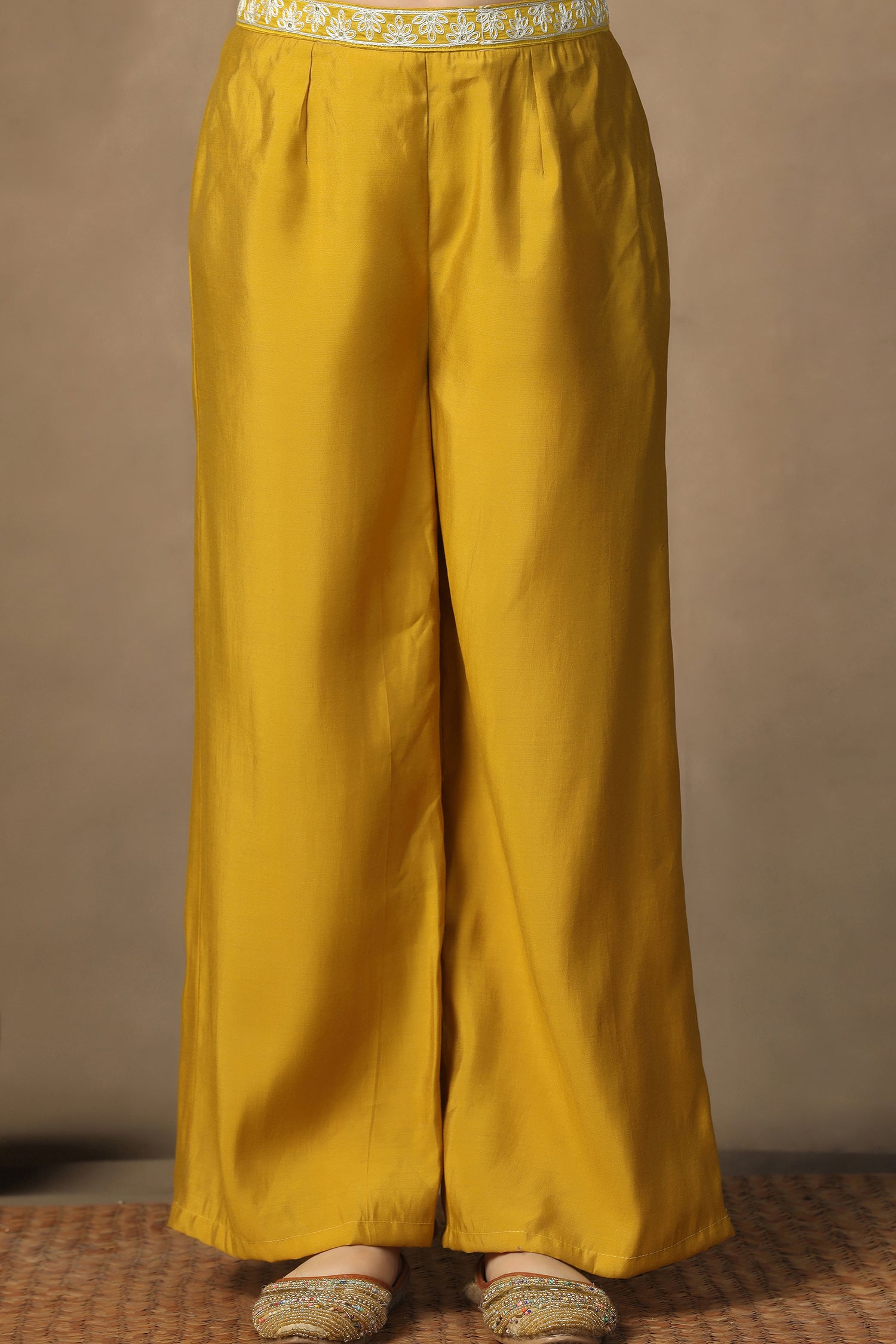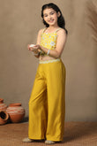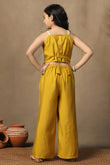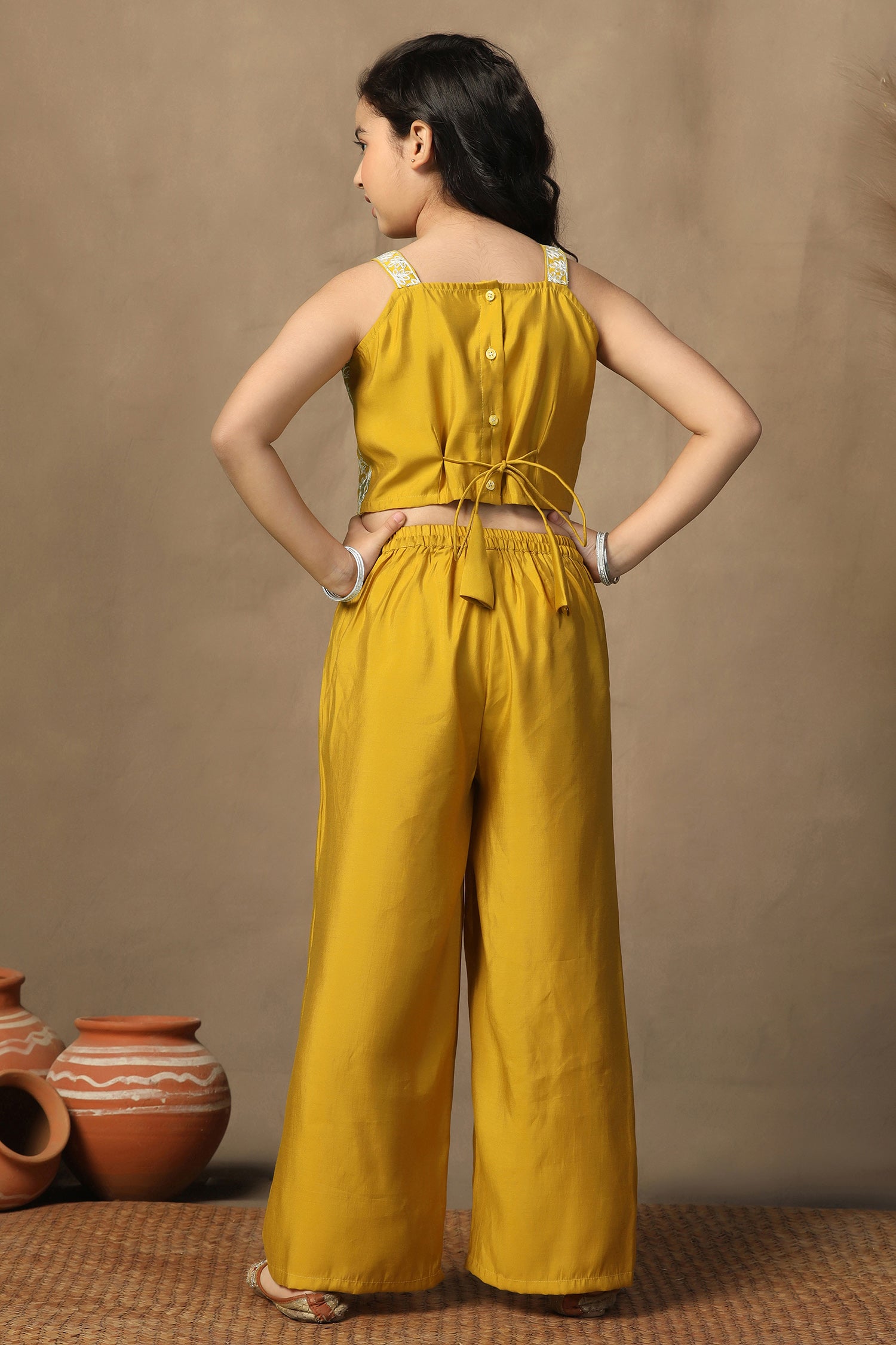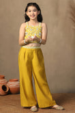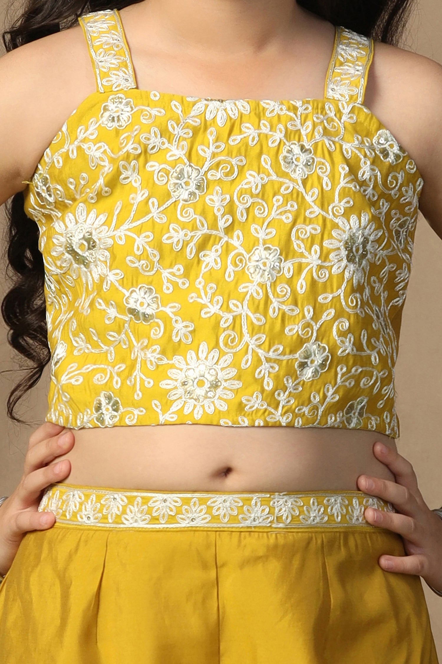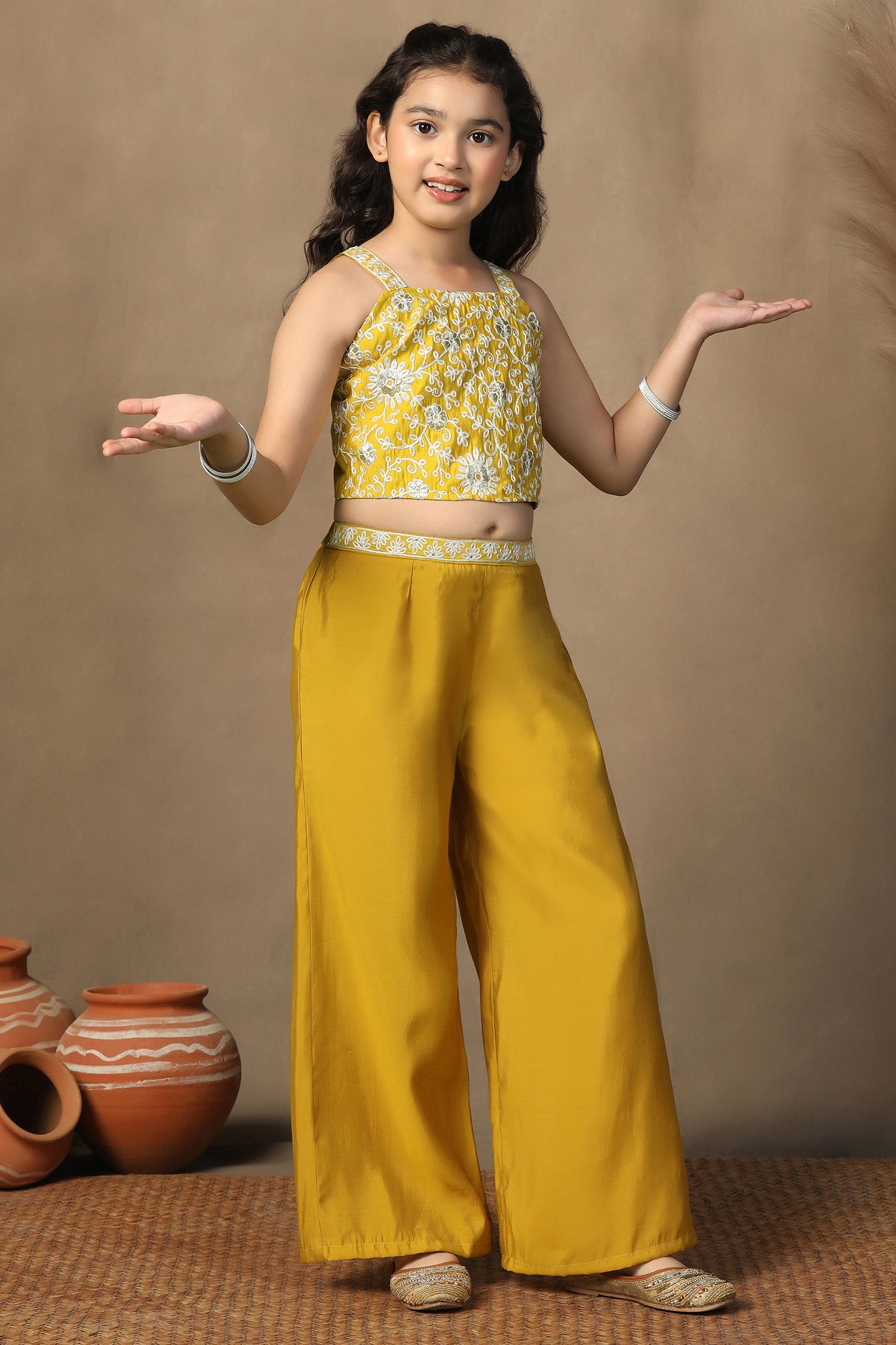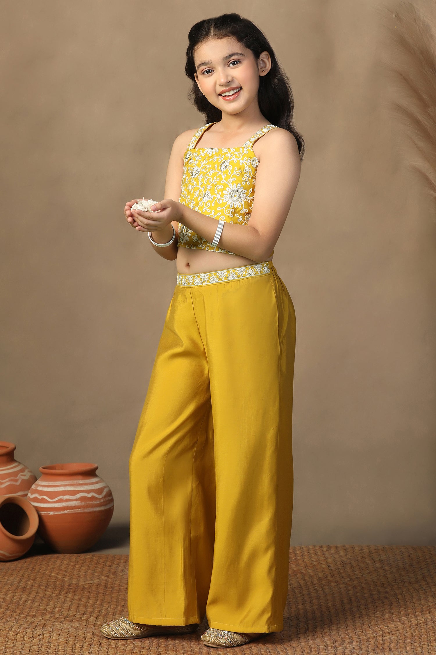 Refresh your wardrobe with this girls ethnic crop top and palazzo set from Fashion Dream. This stylish ethnic set is designed with modern elegance and festive charm, making it a perfect pick for weddings, parties, and family gatherings. Crafted in soft yellow chanderi silk fabric, the sleeveless crop top features a square neckline with delicate embroidery detailing all over and intricate white threadwork on the straps and waistline. The rich floral embroidery on yoke adds a touch of festive sophistication, while the back is finished with a secure button closure and drawstring tie-up for easy wear and adjustable fit. The matching palazzo pants are crafted in the same yellow chanderi silk fabric with a wide-leg silhouette. Designed with a partially elasticated waistband, they provide both comfort and style, ensuring your little girl can move with ease throughout the day. This versatile ethnic co-ord set is perfect as festive wear for kids girls, blending traditional embroidery with a trendy silhouette. Pair it with bangles, juttis, and a hair accessory to complete the elegant look. This outfit is a must-have for every festive wardrobe — ideal as ethnic wear for kids girls, girls dress 12-13 years new fashion, kids girls dress, traditional dress for kids girls, palazzo set for girls, indo western dress for girls, girls ethnic wear, kids ethnic co-ord set, crop top palazzo set for girls, and party wear for kids girls. Note: Accessories and props shown in the images are for styling purposes only and not included with the outfit.