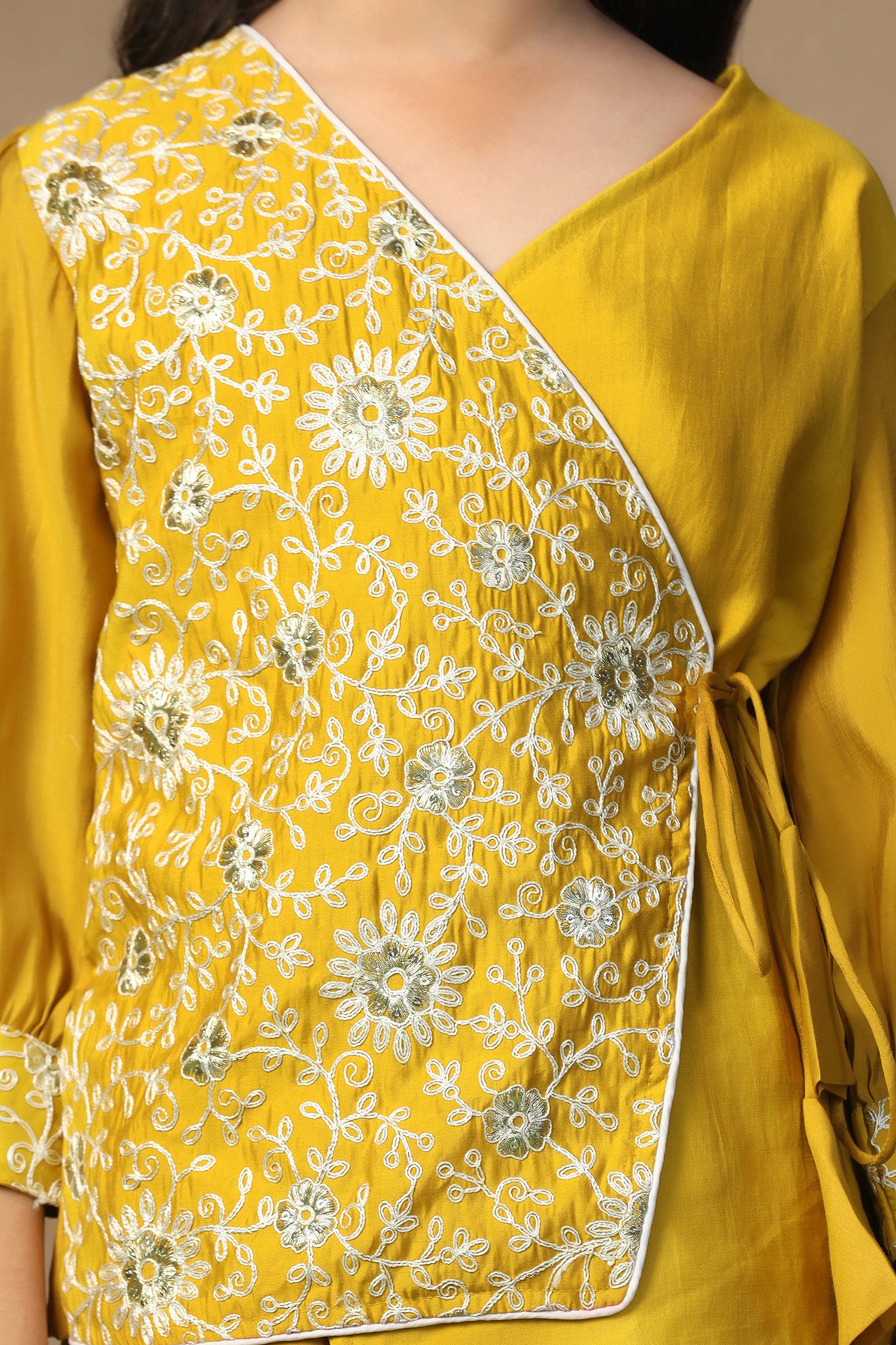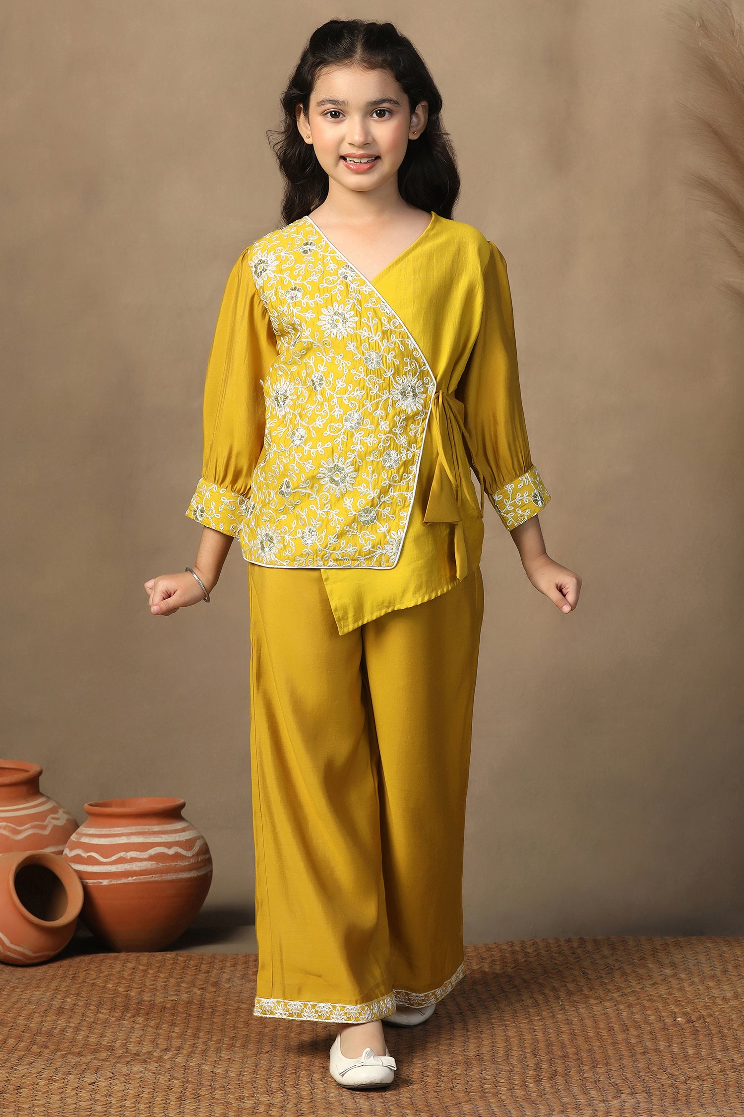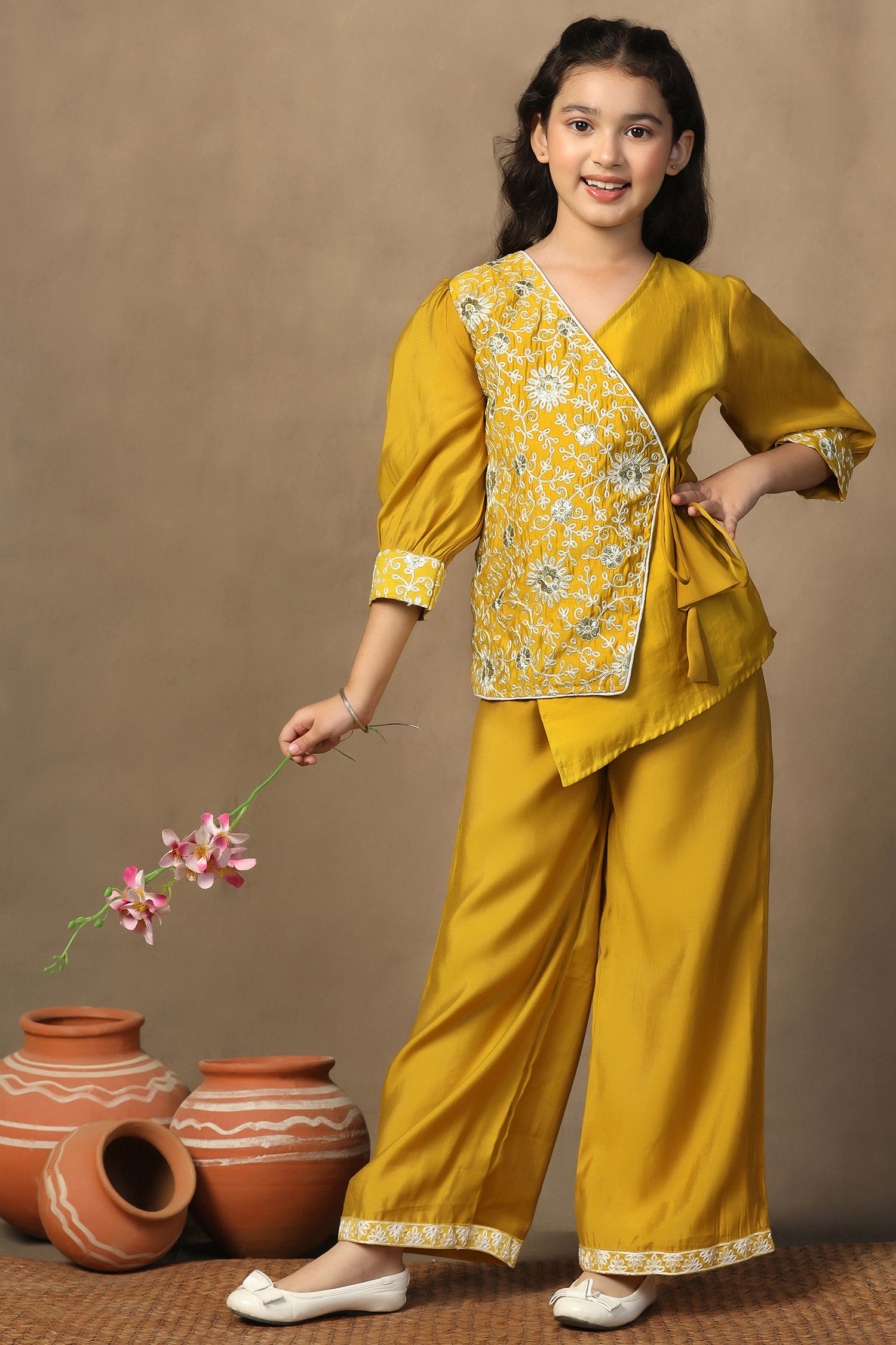 Refresh your child’s festive wardrobe with this girls ethnic set from Fashion Dream. Designed in yellow Chanderi silk with smooth crepe lining, this stylish set is perfect for traditional celebrations, family gatherings, and cultural functions. The wrap-style kurta features a V-neck with delicate floral embroidery on the yoke, side tie-up closure for an adjustable fit, and 3/4th puff sleeves highlighted with embroidered cuffs, making it an elegant choice for ethnic wear for kids girls. Paired with a solid palazzo with lace on hemline crafted in the same rich fabric, the partially elasticated waistband ensures ease of wear while keeping the style trendy. To elevate the charm, accessorize this ethnic wear with matching bangles, embellished juttis, and a delicate maang tikka or floral hairband, making it an enchanting outfit for weddings, cultural events, and special occasions. sharara set for girls, ethnic wear for kids girls, girls dress 12-13 years new fashion, suit for girls, salwar suit for kids girls, traditional dress for kids girls, kids ethnic wear girls, dress for girls 12-13 years, kurti set for girls, girls ethnic wear, kurta set for girls, indo western dress for girls, kids kurta set girls, kids suit for girls, kurti for girls 13-14 years stylish Note: The accessories and props used in these photoshoots are for aesthetic purposes only and may not be included in the final product or service.