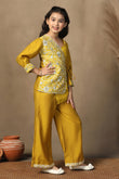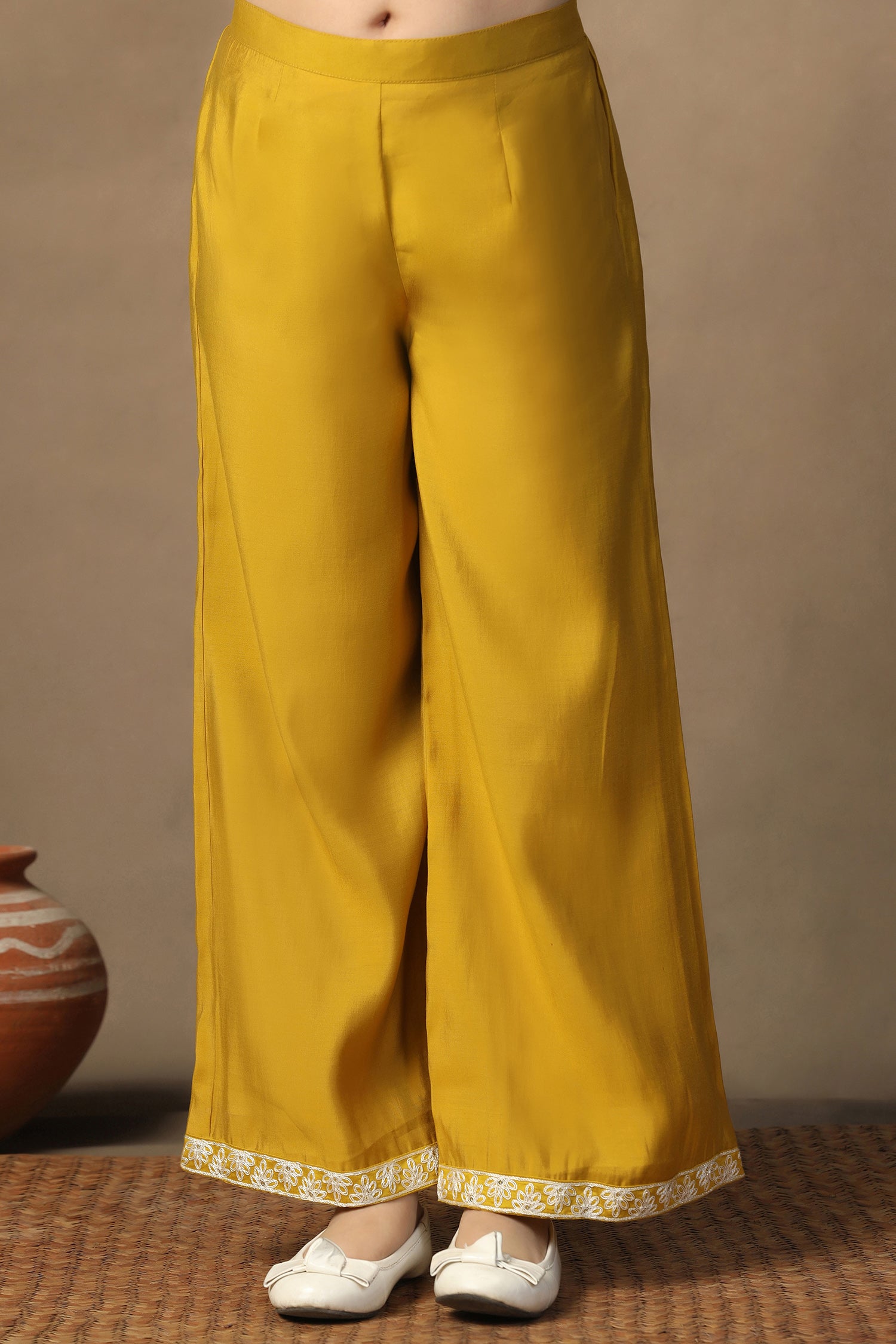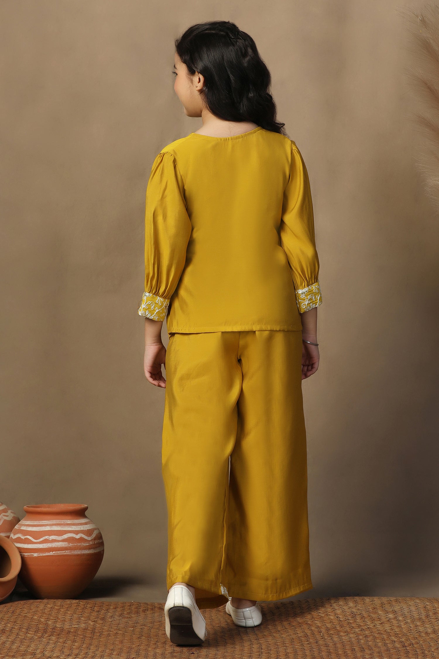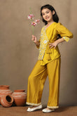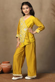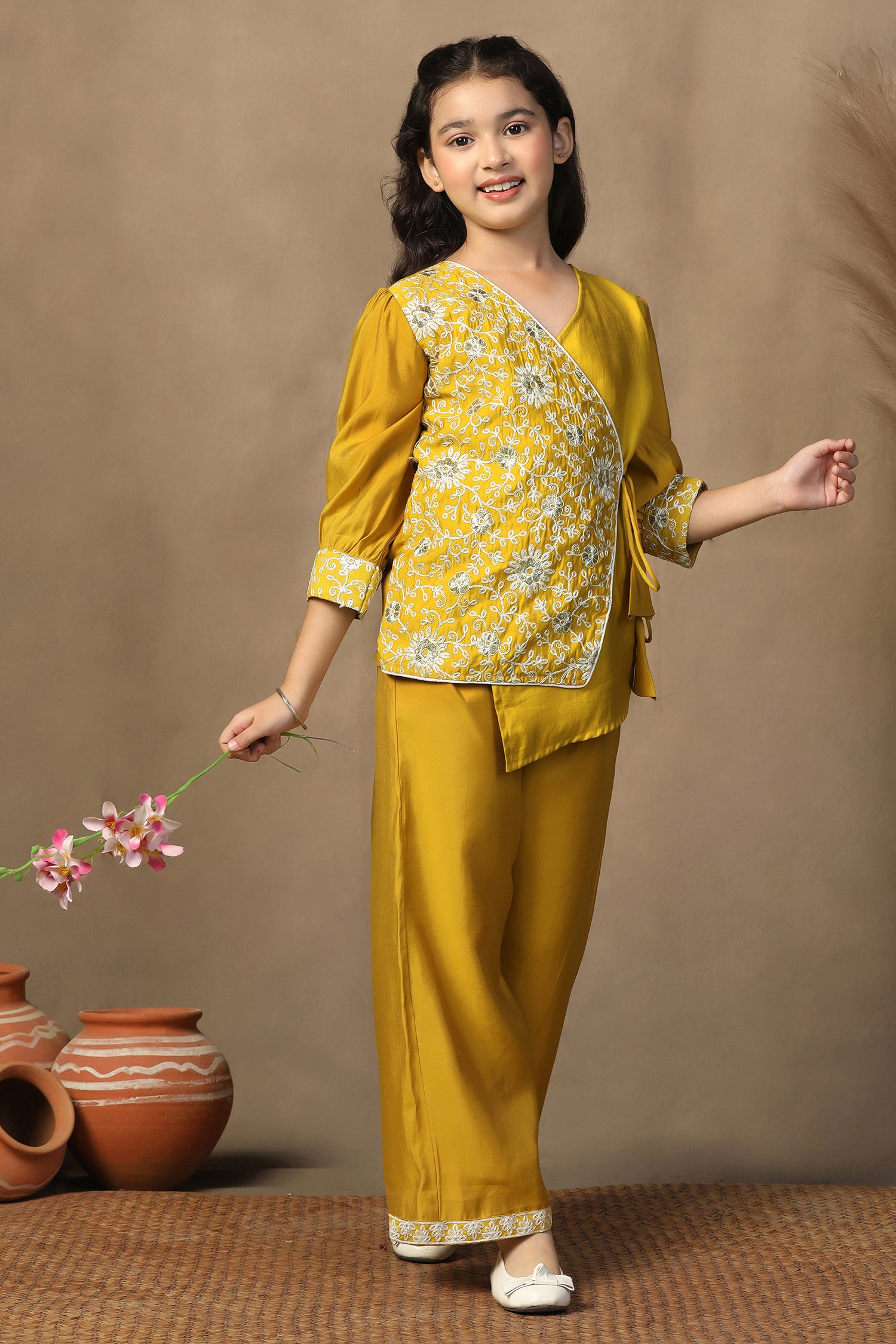 Refresh your child’s festive wardrobe with this girls ethnic set from Fashion Dream. Designed in yellow Chanderi silk with smooth crepe lining, this stylish set is perfect for traditional celebrations, family gatherings, and cultural functions. The wrap-style kurta features a V-neck with delicate floral embroidery on the yoke, side tie-up closure for an adjustable fit, and 3/4th puff sleeves highlighted with embroidered cuffs, making it an elegant choice for ethnic wear for kids girls. Paired with a solid palazzo with lace on hemline crafted in the same rich fabric, the partially elasticated waistband ensures ease of wear while keeping the style trendy. To elevate the charm, accessorize this ethnic wear with matching bangles, embellished juttis, and a delicate maang tikka or floral hairband, making it an enchanting outfit for weddings, cultural events, and special occasions. sharara set for girls, ethnic wear for kids girls, girls dress 12-13 years new fashion, suit for girls, salwar suit for kids girls, traditional dress for kids girls, kids ethnic wear girls, dress for girls 12-13 years, kurti set for girls, girls ethnic wear, kurta set for girls, indo western dress for girls, kids kurta set girls, kids suit for girls, kurti for girls 13-14 years stylish Note: The accessories and props used in these photoshoots are for aesthetic purposes only and may not be included in the final product or service.