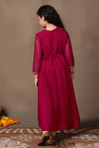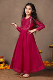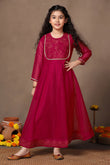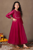 Dress your little girls with this Rani colored maxi length dress from Fashion Dream. Pair it with a cute hair accessory and closed shoes to shine at the best friend's birthday party. Give your kids a unique look with this stylish solid embroidered dress. This dress is crafted from chiffon silk fabric with butter crepe lining. It features round neck, 3/4 sleeves, lace detailing over yock and sleeve hem, having intricate embroidery on yoke and hem, and flared silhoutte that will make your girl look even more stylish. The dress has a self fabric attached belt and button closure to give it a comfortable and perfect fit. This girls dress is ideal for all everyday functions, parties and outdoor activities.Pair with subtle jewellery for a beautiful look that's perfect for festivals or family gatherings. "Note: The accessories and props used in these photoshoots are for aesthetic purposes only and may not be included in the final product or service."