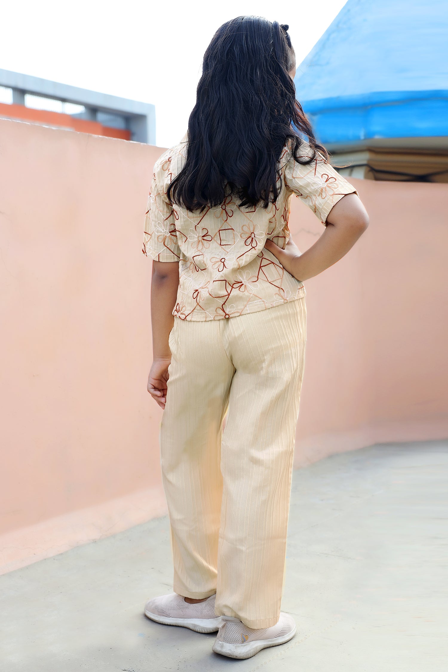Refresh your wardrobe with this chikoo co-ord set from Fashion Dream. This shirt style top and pant set completes your look for your outings. Get the perfect blend of elegance and comfort with our girl's Embroidered 2 piece set. This chikoo combo set for girl is made from cotton blend fabric that is light and comfortable to wear, featuring a beautiful embroidered pattern clothing set. The girl's shirt style top features lapel collar neck with front button closer, half sleeve. girl's embroidered top and solid Pant bottom that has partially elasticated waistband for a comfortable fit Set is designed keeping in mind style, fashion and comfort. Pair it with matching earrings and sandals to complete the casual yet fashionable look. "Note: The accessories and props used in these photoshoots are for aesthetic purposes only and may not be included in the final product or service."