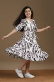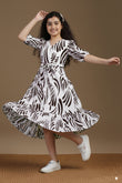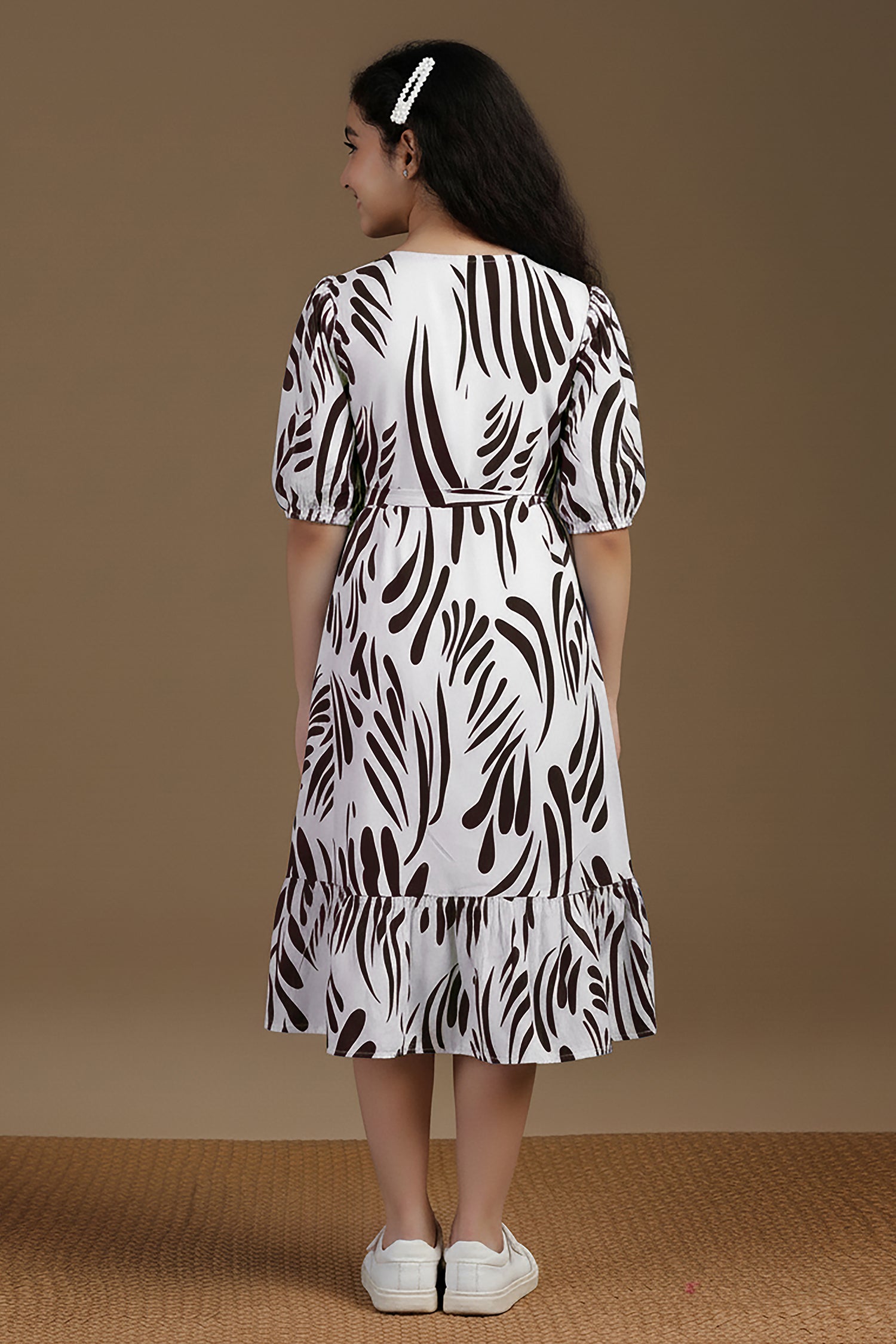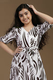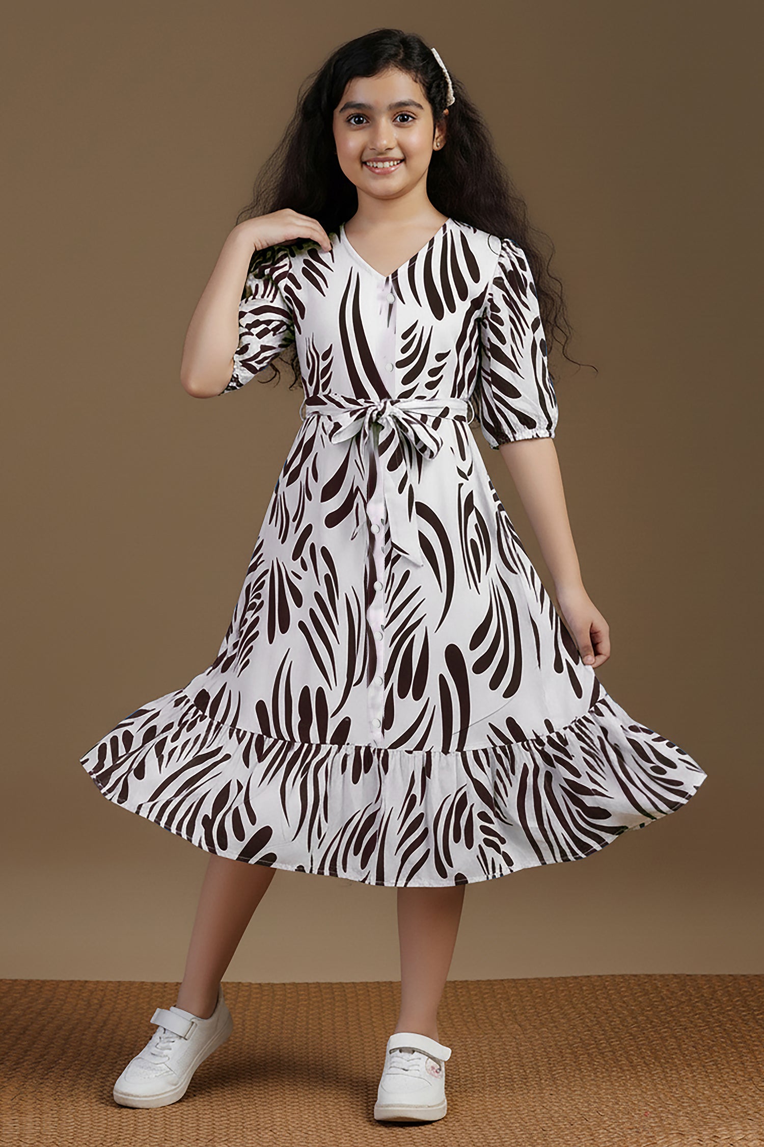Spruce up your wardrobe with this stylish Girls Printed Frock from Fashion Dream. This fit & flare frock features a vibrant Coffee abstract print on a crisp white base, offering a refreshing, nature-inspired look that’s perfect for casual outings, festive occasions, or weekend fun. Crafted from a soft and breathable fabric rayon, it features a flattering V-neckline, stylish puffed half sleeves, and a waist tie-up that adds definition and charm. The button-down front enhances the design with a classic touch, while the ruffled hemline brings playful movement and elegance. Whether you're looking for a trendy frock for everyday wear or a stylish outfit for special occasions, this versatile dress is designed to deliver both comfort and standout style. Discover the latest in girls dress new fashion, western dress for girls, kids dress for girls, birthday dress for girls, baby girl dress, kids clothes for girls, girls dress, children dress girls, long frocks for girls. Note: The accessories and props used in these photoshoots are for aesthetic purposes only and may not be included in the final product or service.