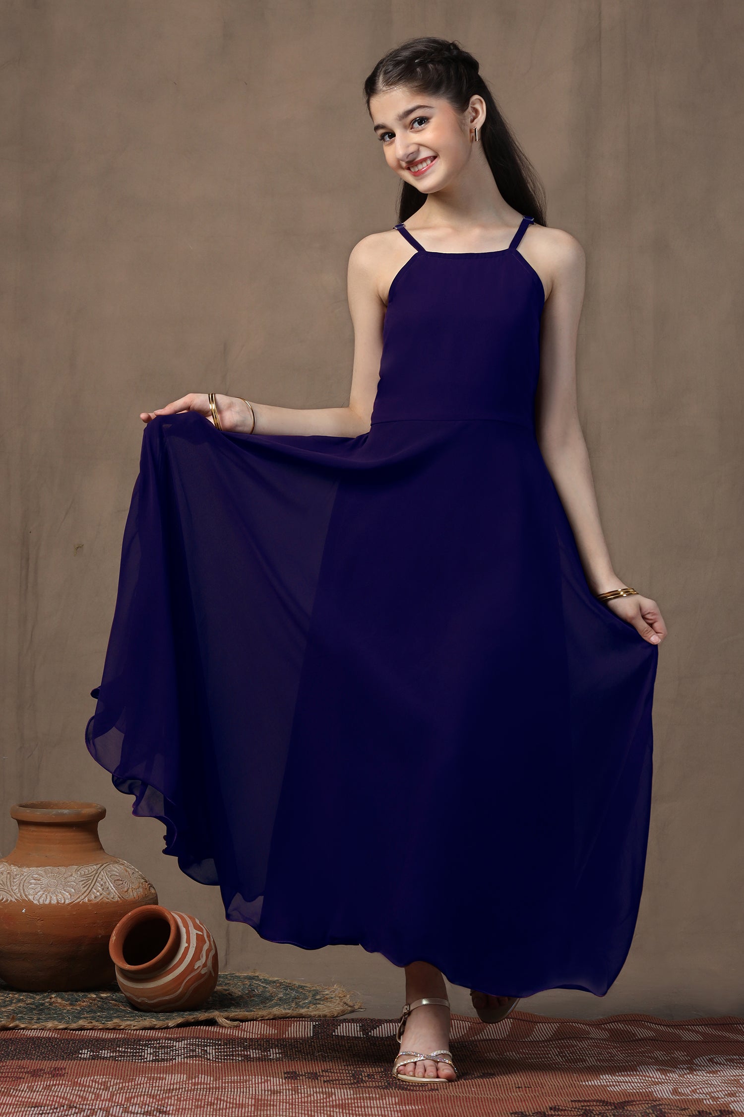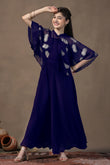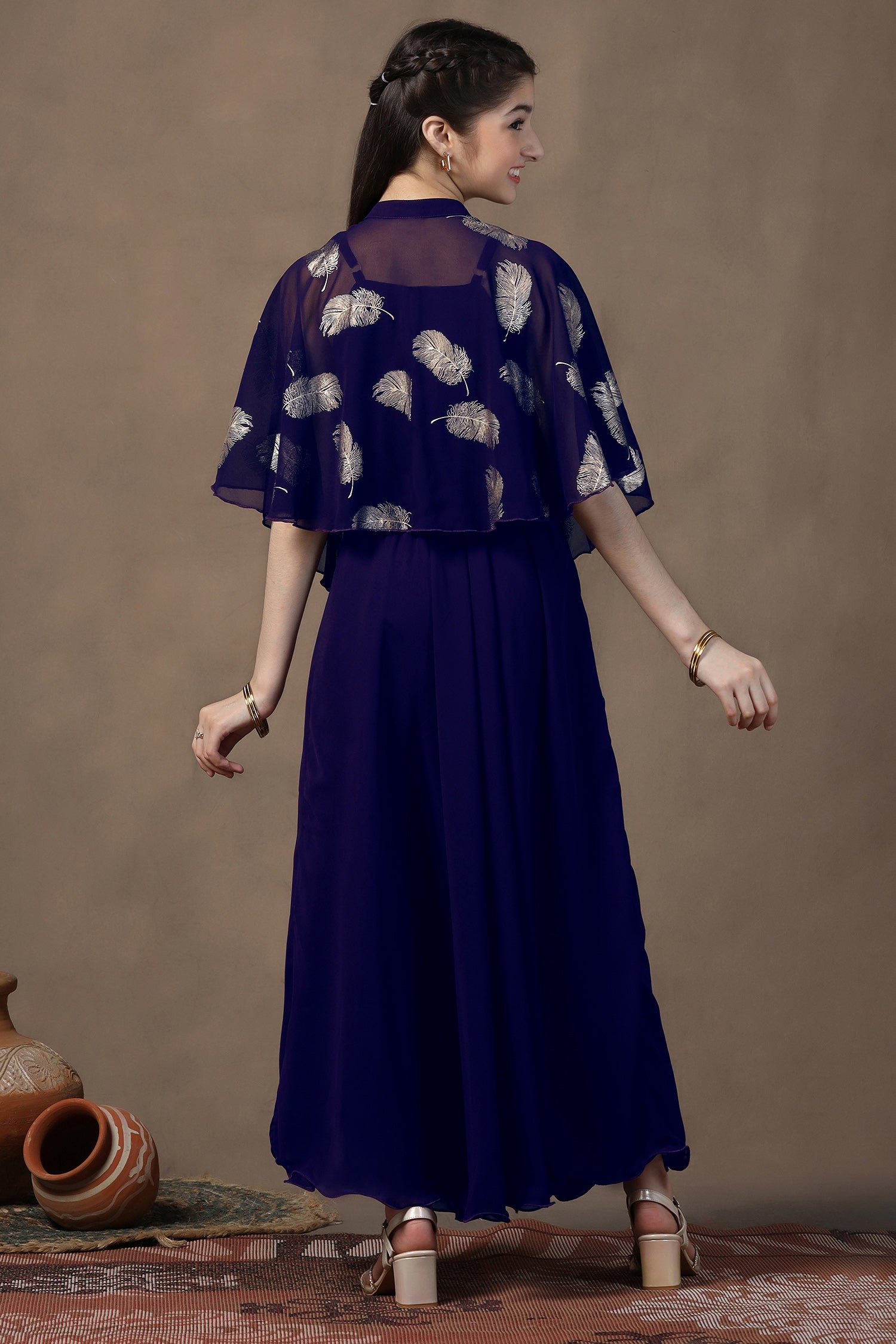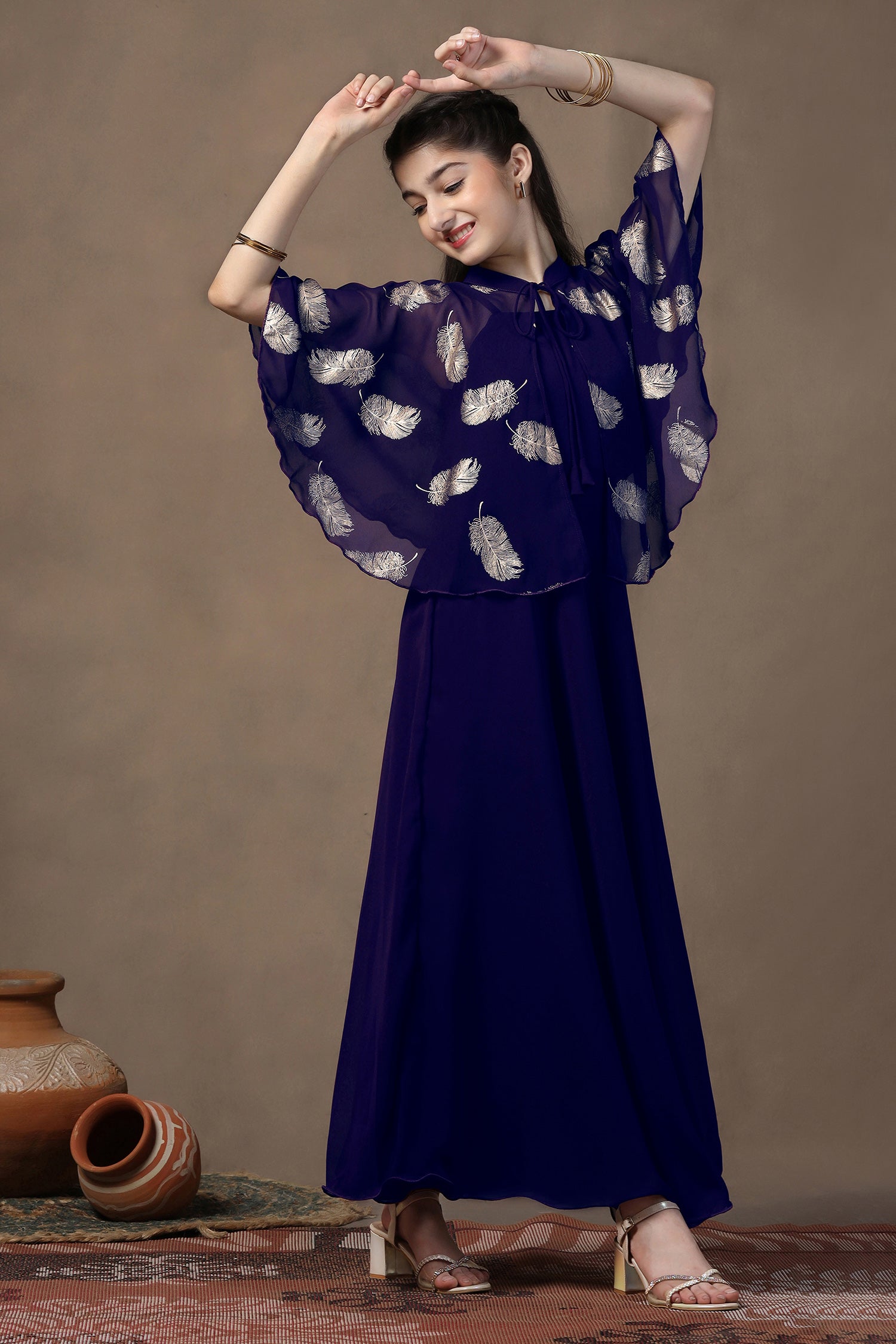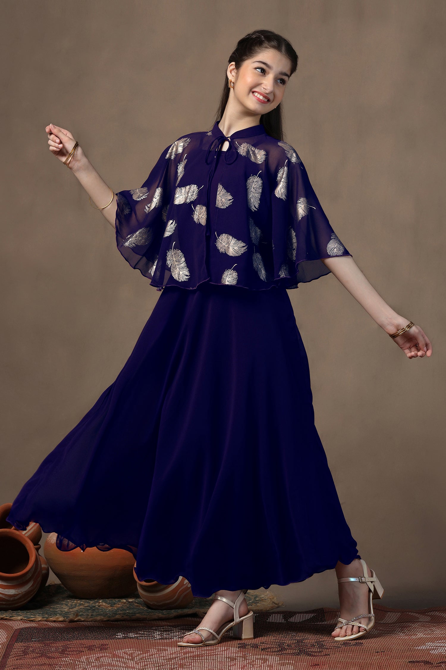 Girl's Dark Blue Maxi Dress With Foil Printed Shrug Set