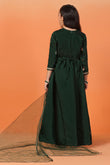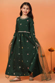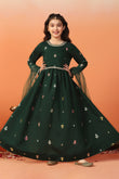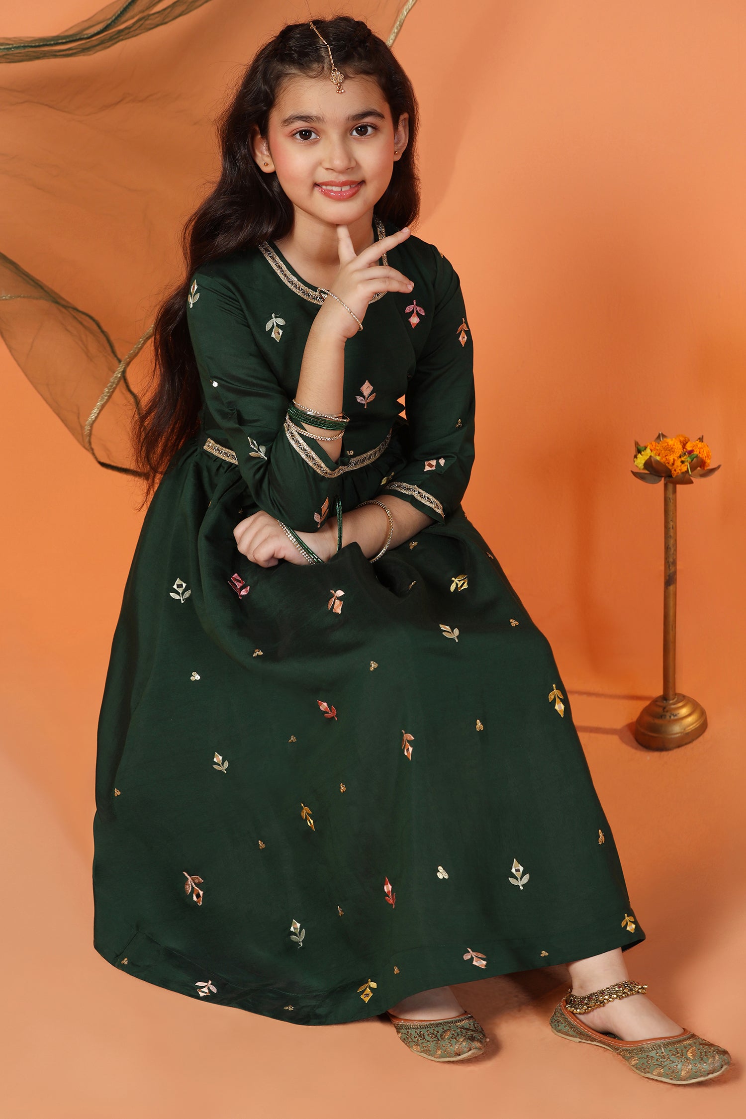 Spruce up your wardrobe with this embroidered maxi-length dress for girls from Fashion Dream. Made with soft and lightweight Chanderi silk fabric, this elegant girls dress is a perfect choice for weddings, festivals, and family functions. The fine embroidery gives it a festive sparkle, making your little one look like a princess at every occasion. This stylish kids dress for girls comes in a rich green shade with detailed embroidery on the front. The gown has a flared maxi style that looks graceful with every twirl. It comes with a matching dupatta, round neck, a self-fabric belt for a neat fit, and a secure back zip closure for easy wearing. The 3/4th sleeves add charm and comfort, giving the outfit a trendy yet traditional touch and this embroidered maxi dress with dupatta is the perfect pick. A must-have in kids clothes for girls, it will make your princess shine at every celebration. Pair this embroidered maxi dress with traditional jewellery, a stylish hair accessory, or keep it with embellished jutties and a dupatta for festive parties and family functions.
