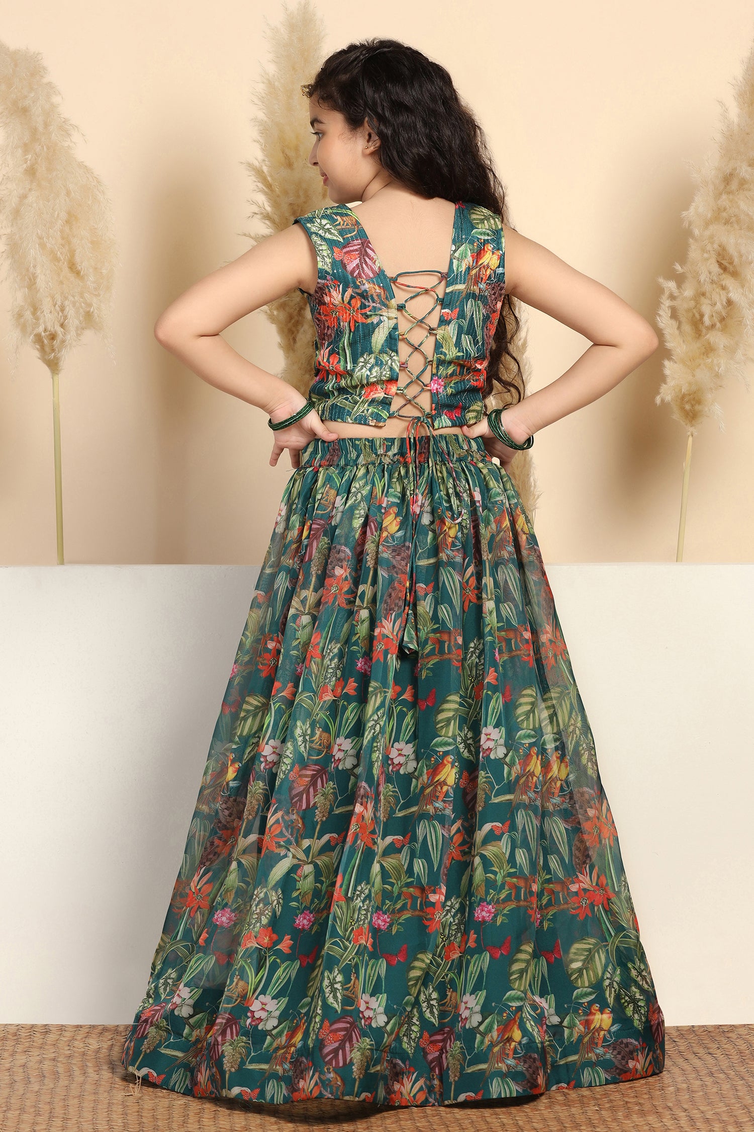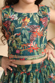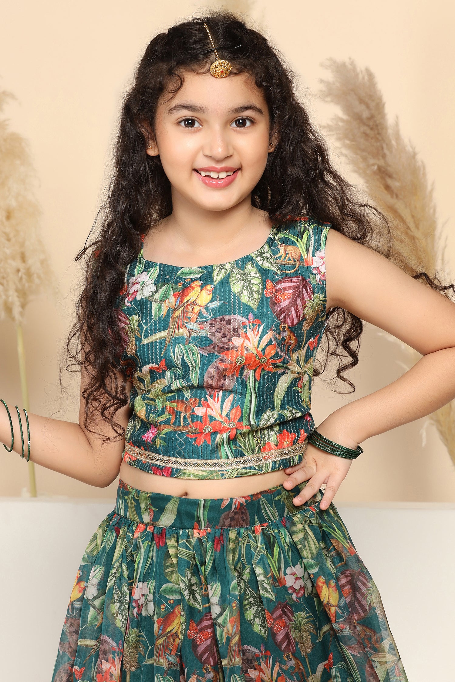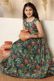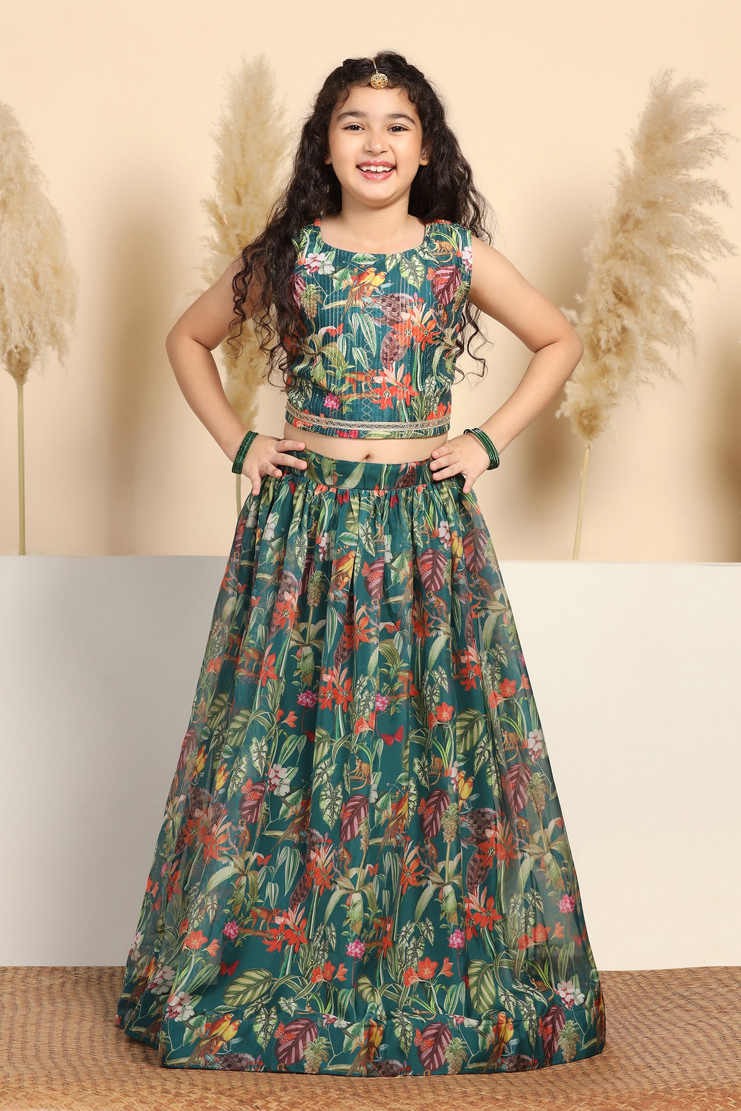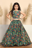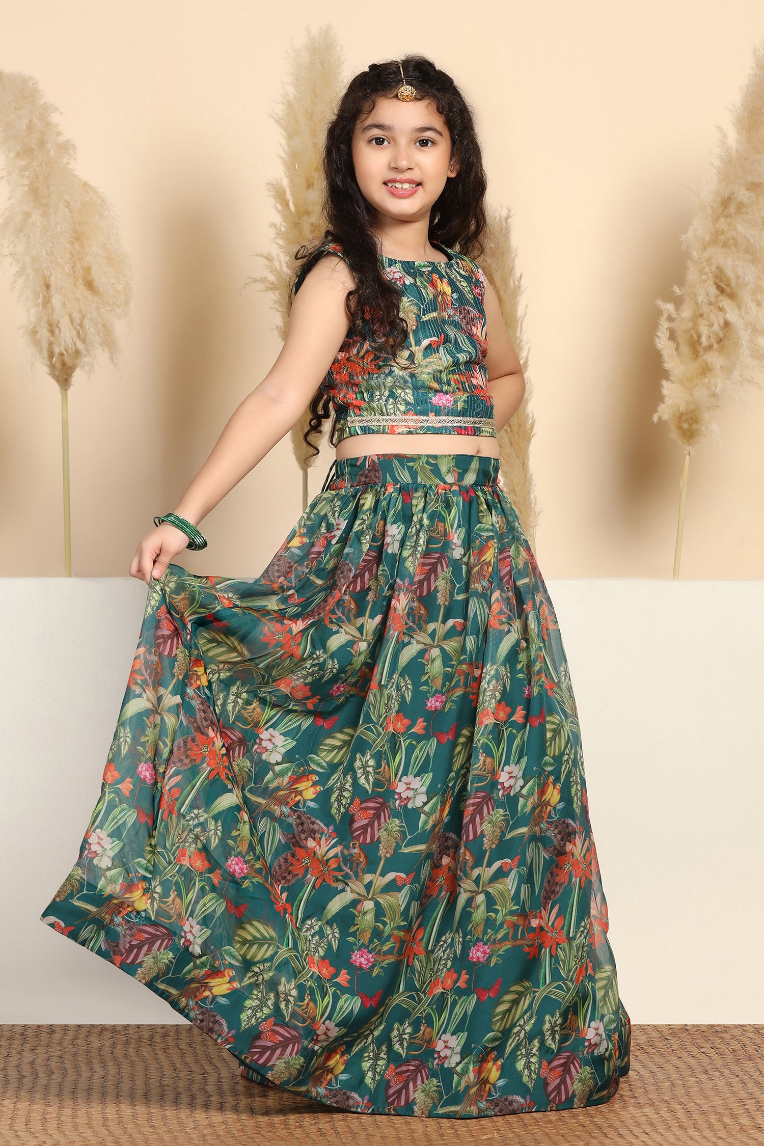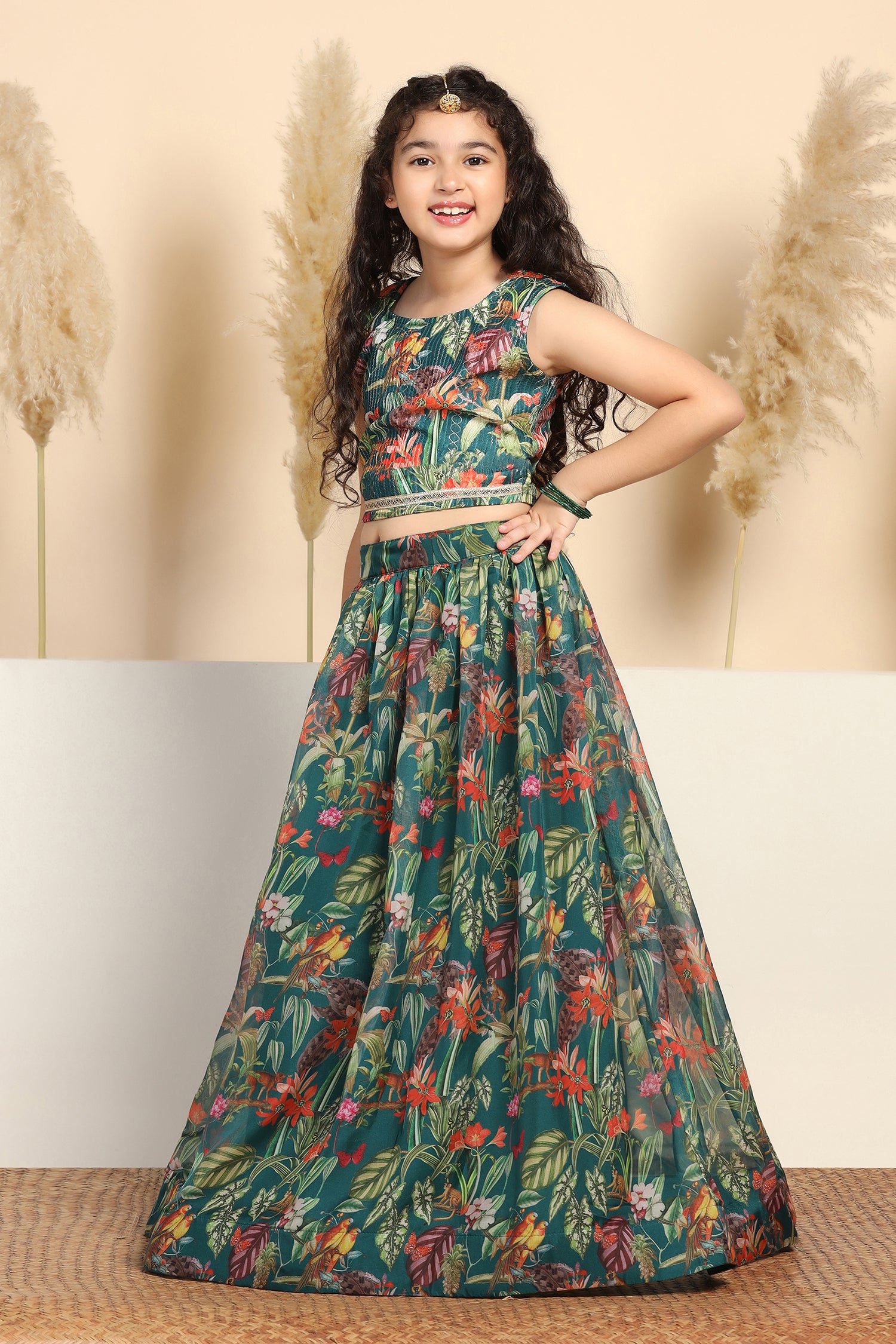 Shop from a wide range of beautifully crafted Lehenga Choli from Fashion Dream. Style the set with earrings and golden heels for a beautiful traditional outfit. Get a charming and elegant option for festive moments with this Green color lehenga choli. This Floral printed lehenga choli is made from crepe silk with butter crepe linning for comfort. The choli for girls has a Round neck, Sleevless bodies, lace detailing at the front of the choli and also has a back drawstring closure for fitting. This Floral printed lehenga is half elasticated weist band. This traditional lehenga choli for kids is ideal for special occasions including weddings, sangeet, garba parties and cocktail parties.