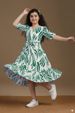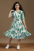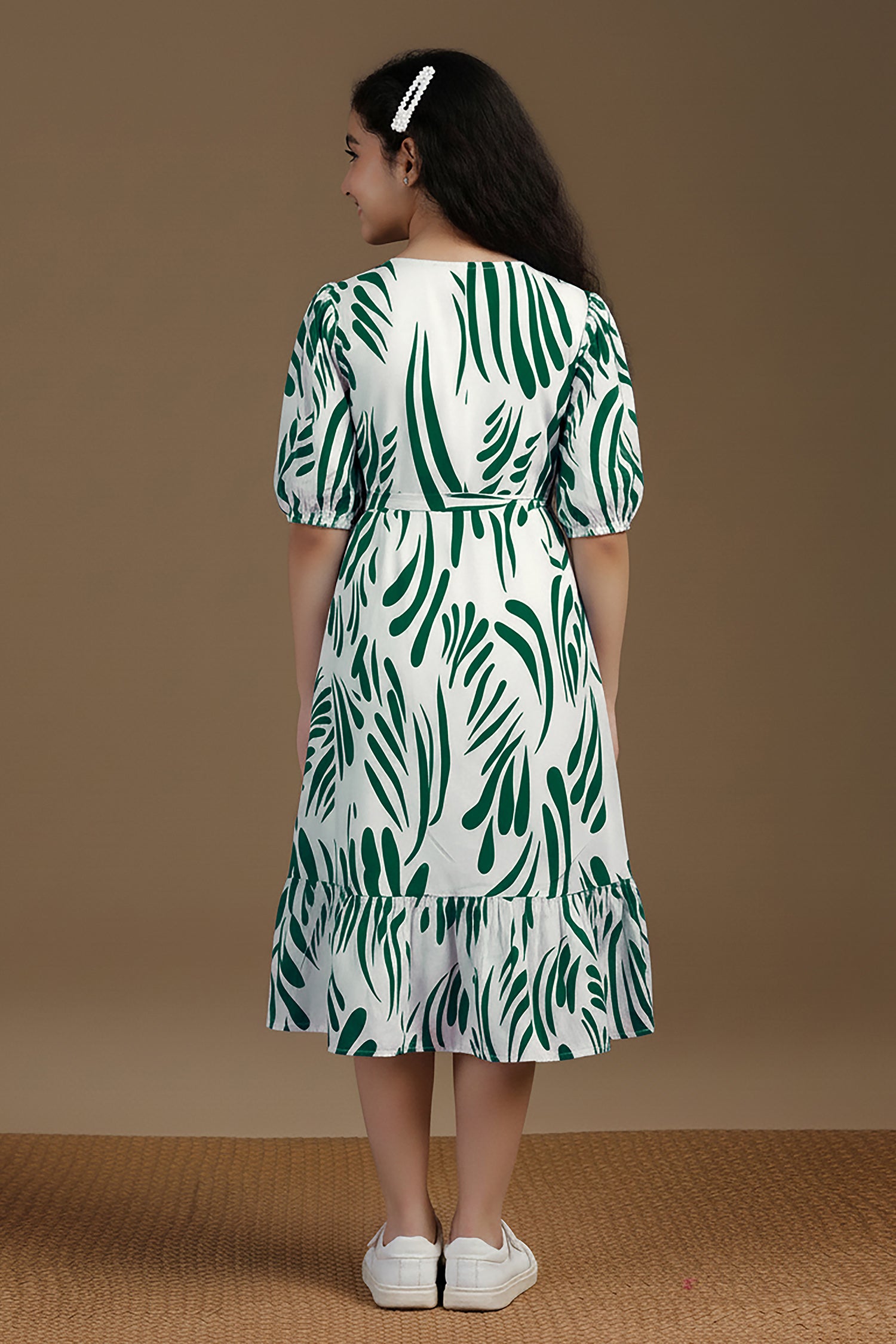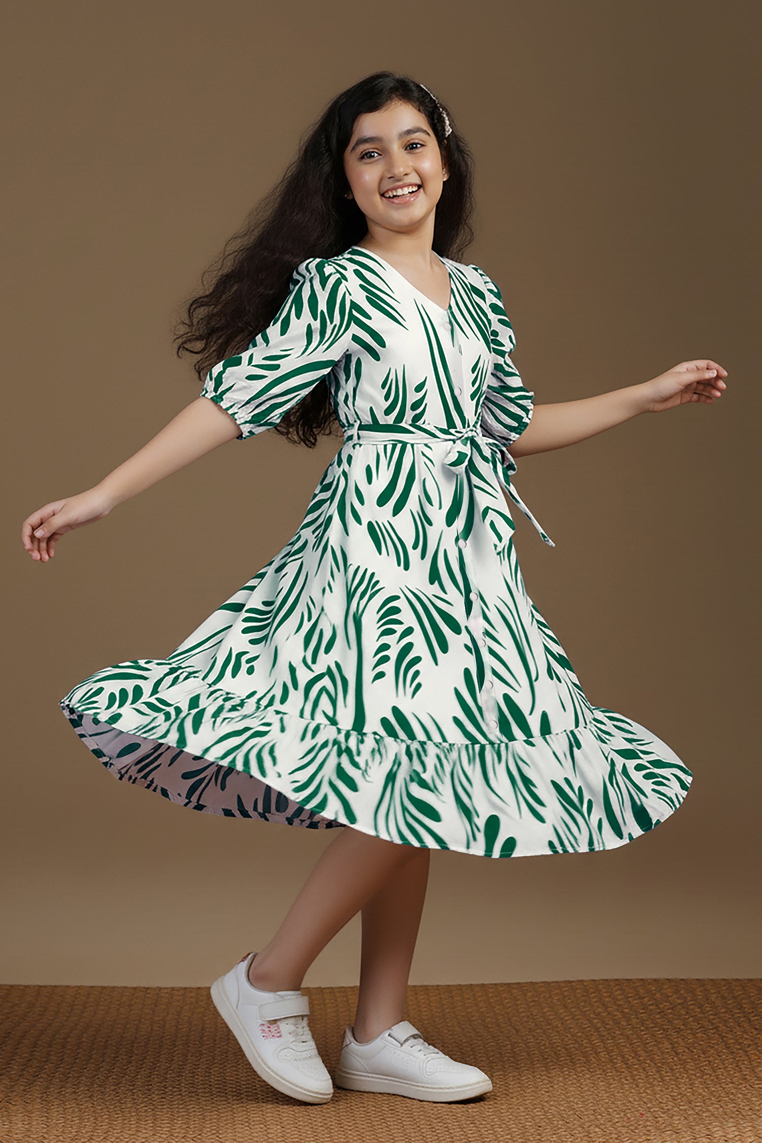 Spruce up your wardrobe with this stylish Girls Printed Frock from Fashion Dream. This fit & flare frock features a vibrant green abstract print on a crisp white base, offering a refreshing, nature-inspired look that’s perfect for casual outings, festive occasions, or weekend fun. Crafted from a soft and breathable fabric rayon, it features a flattering V-neckline, stylish puffed half sleeves, and a waist tie-up that adds definition and charm. The button-down front enhances the design with a classic touch, while the ruffled hemline brings playful movement and elegance. Whether you're looking for a trendy frock for everyday wear or a stylish outfit for special occasions, this versatile dress is designed to deliver both comfort and standout style. Discover the latest in girls dress new fashion, western dress for girls, kids dress for girls, birthday dress for girls, baby girl dress, kids clothes for girls, girls dress, children dress girls, long frocks for girls. Note: The accessories and props used in these photoshoots are for aesthetic purposes only and may not be included in the final product or service.