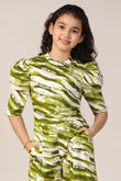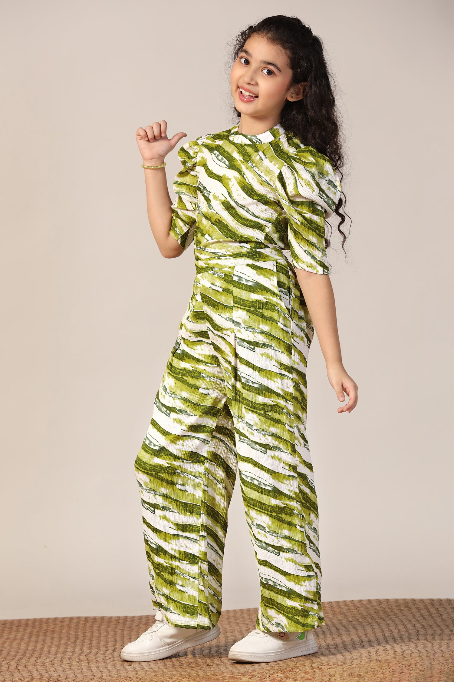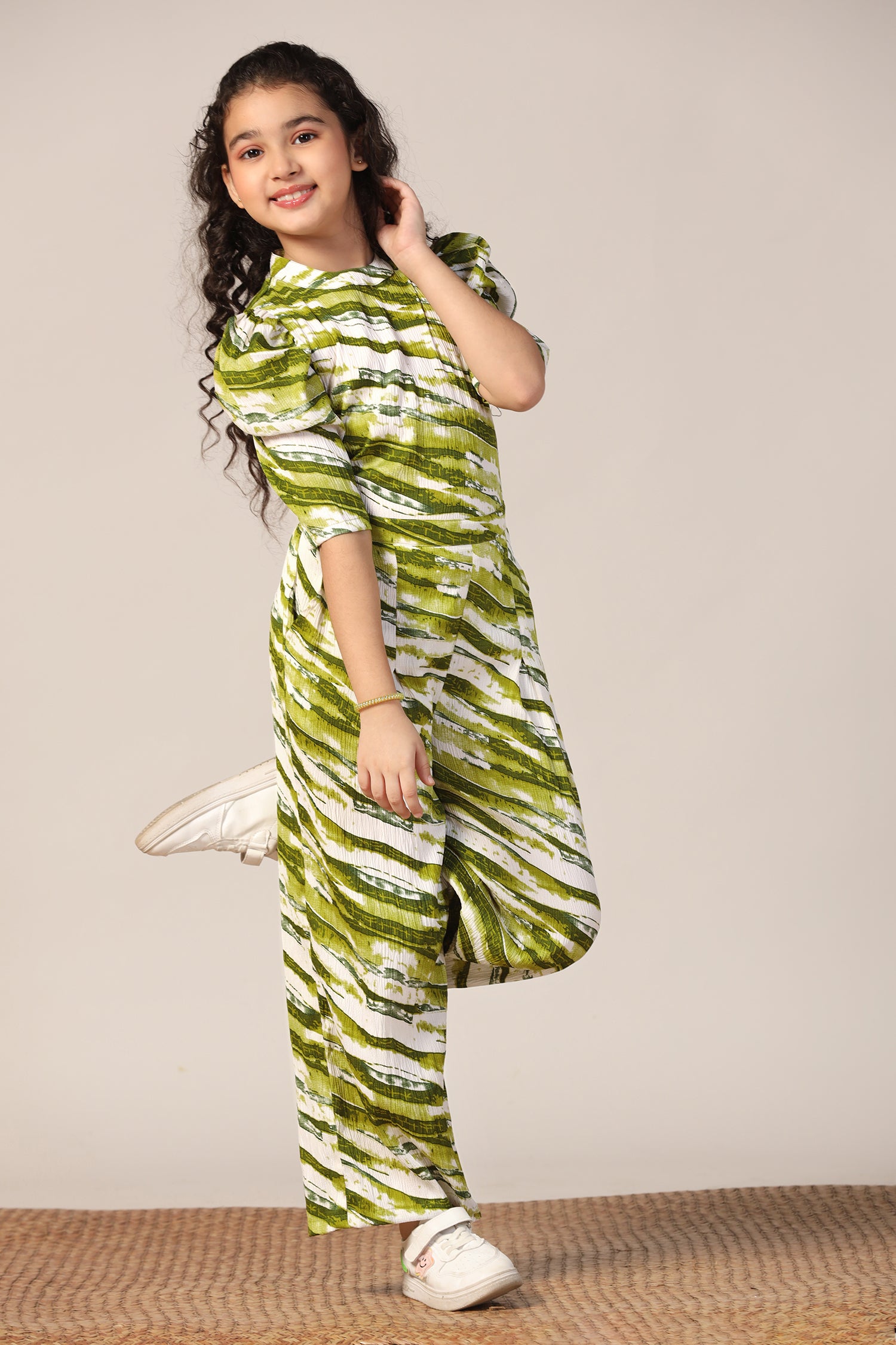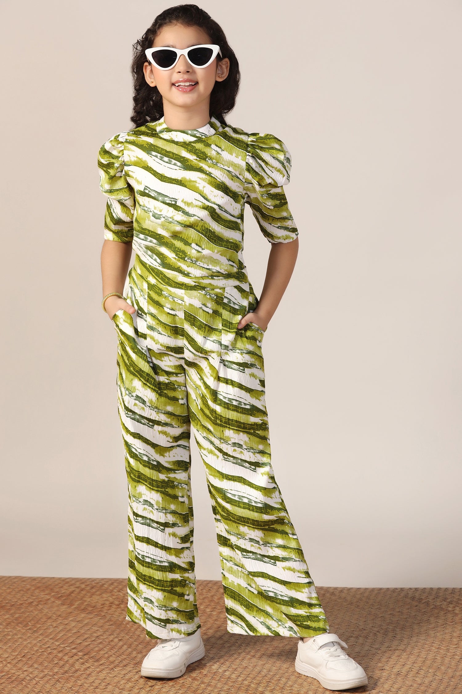 Refresh your wardrobe with this Green colored co-ord set from Fashion Dream available on Amazon. This classy top and pant set completes your look for your outings. Get the perfect blend of elegance and comfort with your Girl's two-piece combo set. This clothing set for girl is made from cotton blend fabric that is light and comfortable to wear. The set features abstract printed top having round neck, half puff sleeves,zip along button closure at back to give it a perfect fit. This western wear is designed with passion keeping style, fashion and comfort in mind. The set comes along with a printed pant bottom having two side pockets and partially elasticated waistband for a comfortable fit. Pair it with matching earrings and sandals to complete the casual yet fashionable look. "Note: The accessories and props used in these photoshoots are for aesthetic purposes only and may not be included in the final product or service."