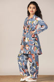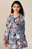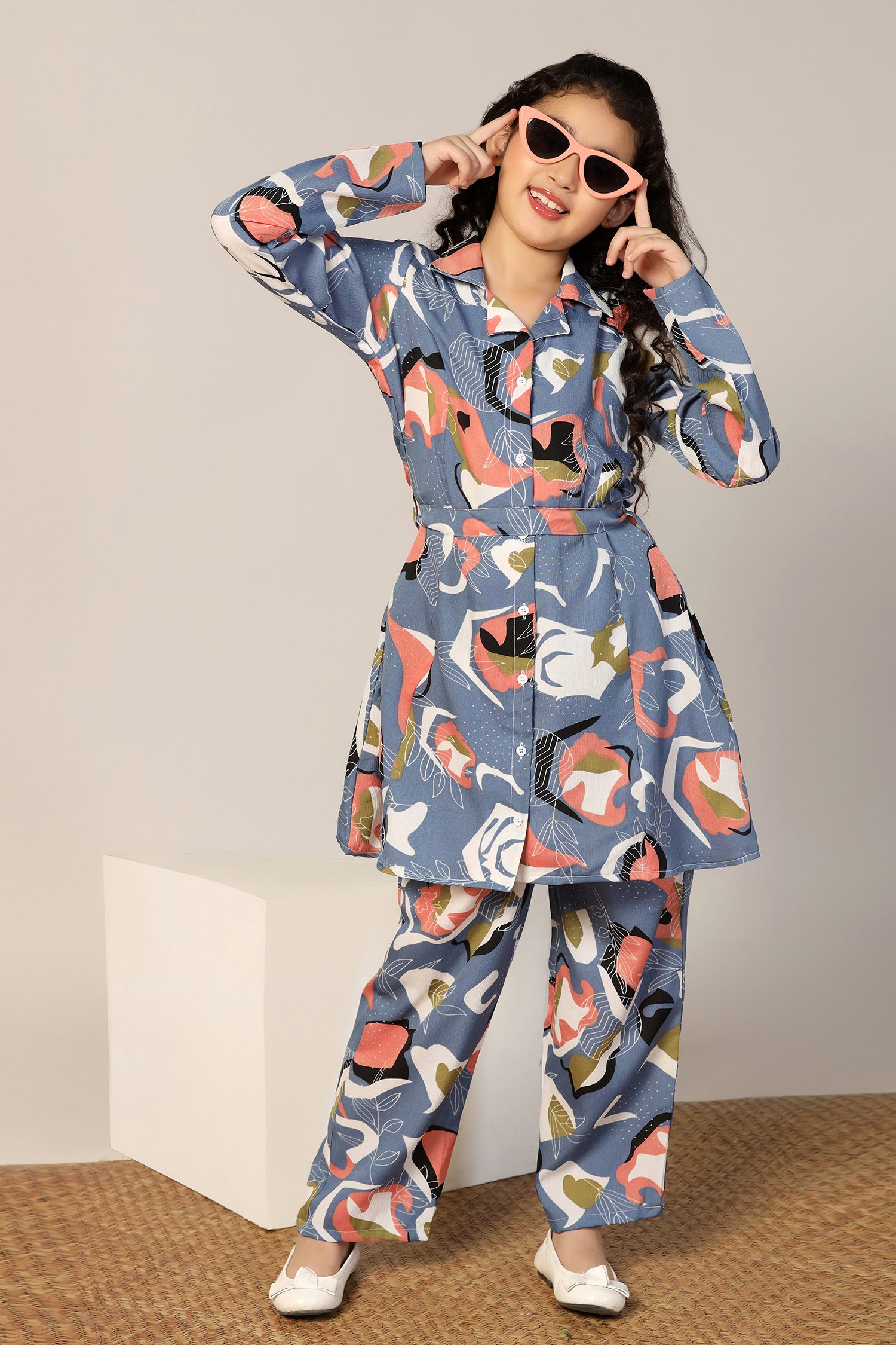 Refresh your wardrobe with this Grey colored co-ord set from Fashion Dream. This girls combo set is designed to bring elegance and comfort, making it a perfect choice for outings, casual gatherings, or weekend wear. Crafted from a soft rayon fabric, the top features a smart lapel collar, full sleeves, front button closure, and comes with a self-fabricated belt that cinches the waist, adding shape and style to the overall look. The abstract print in multicolor accents enhances its modern appeal while keeping it playful and chic. The matching printed pant bottom is tailored in a straight fit with a fully elasticated waistband for ease of movement and day-long comfort. Designed with functionality in mind, it also comes with side pockets, making it both trendy and practical. Pair this top and pant set for girls with ballerinas or sneakers along with minimal accessories for a smart and casual everyday look. This versatile set works beautifully as clothing set for girls, western dress for girls, top and bottom set for girls, co ord set for girls, girls cord set, and kids clothes for girls stylish. Note: The accessories and props used in these photoshoots are for styling purposes only and not included in the final product or service.