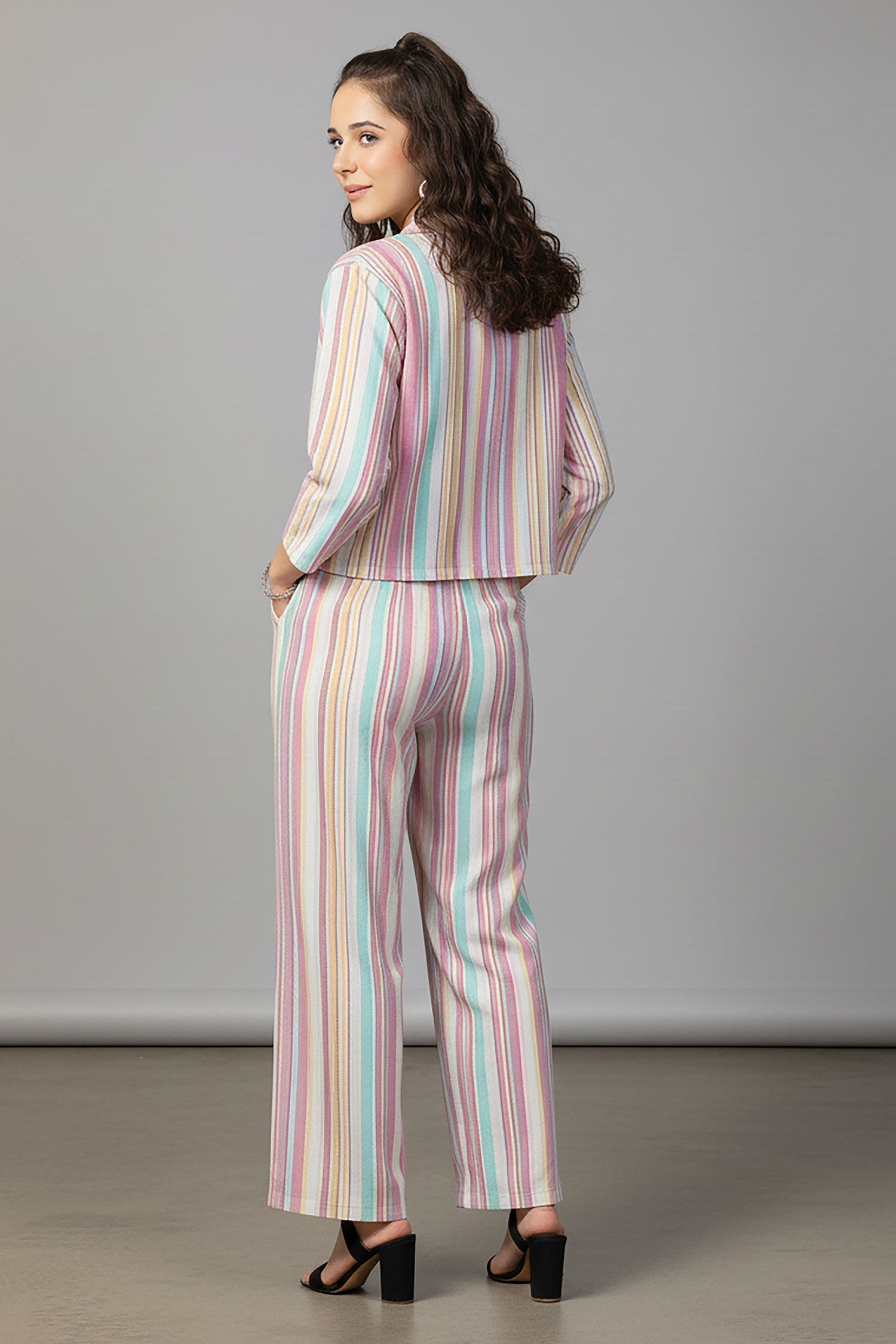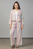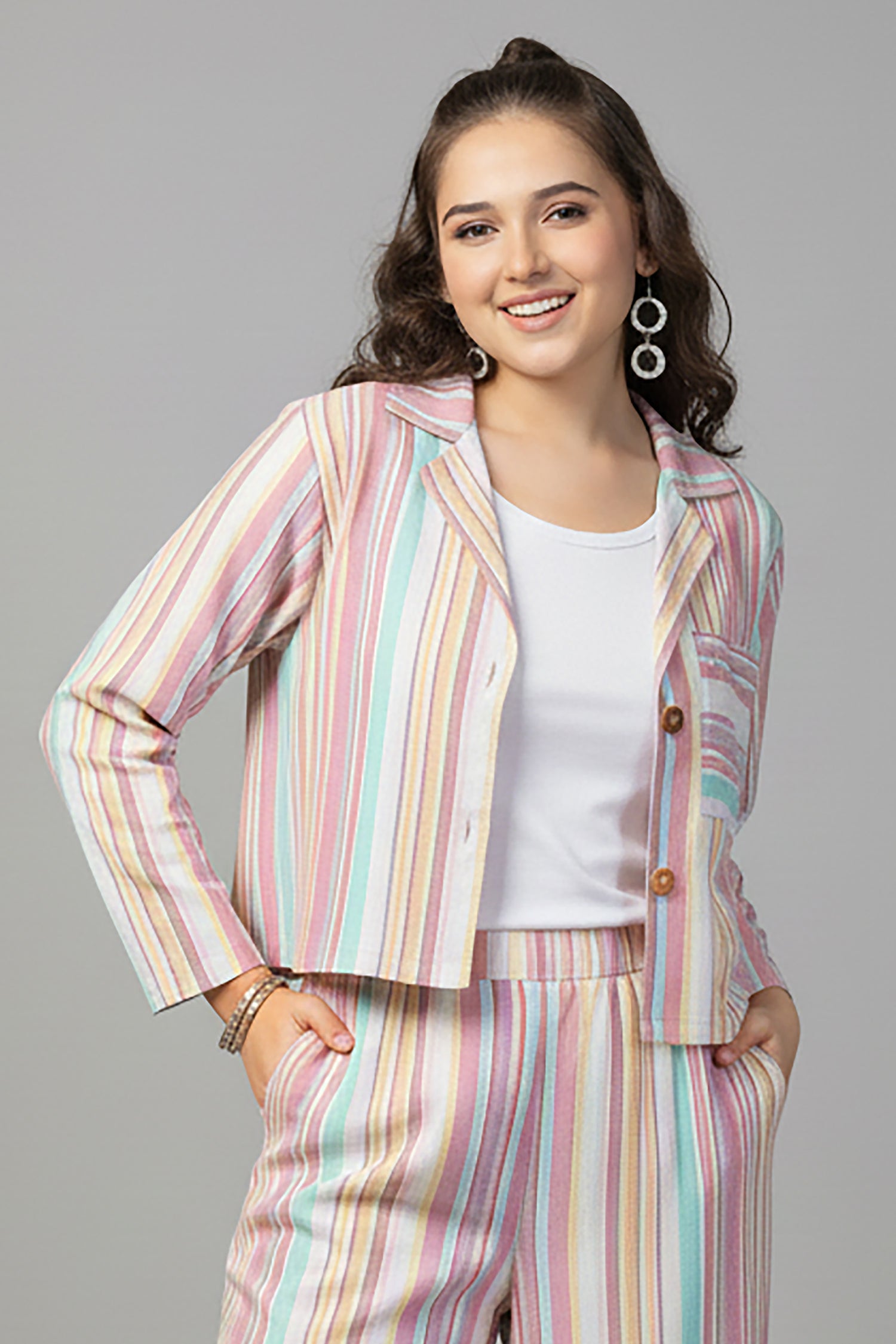 Shop a wide range of Girls Combo Sets. Perfect for your everyday use. This lightpink color co-ord set is made from soft and breathable cotton blend, offering comfort with a stylish edge. The three-piece outfit features a sleeveless inner crop top, a stripe printed jacket with a smart lapel collar neck, one side pocket, full sleeves, and a matching pant with two side pockets for added utility. The jacket gives a chic layered look for a neat finish. The pant ensures ease of movement with a relaxed fit, while the crop top adds a modern touch for a fashionable vibe. The vibrant stripe print across the set makes it playful and eye-catching, making this a must-have in every girl’s wardrobe. Pair it with sneakers for a trendy casual look and accessorise with a cute hairband, sling bag, or minimal jewellery to complete the look effortlessly. "Note: The accessories and props used in these photoshoots are for aesthetic purposes only and may not be included in the final product or service."