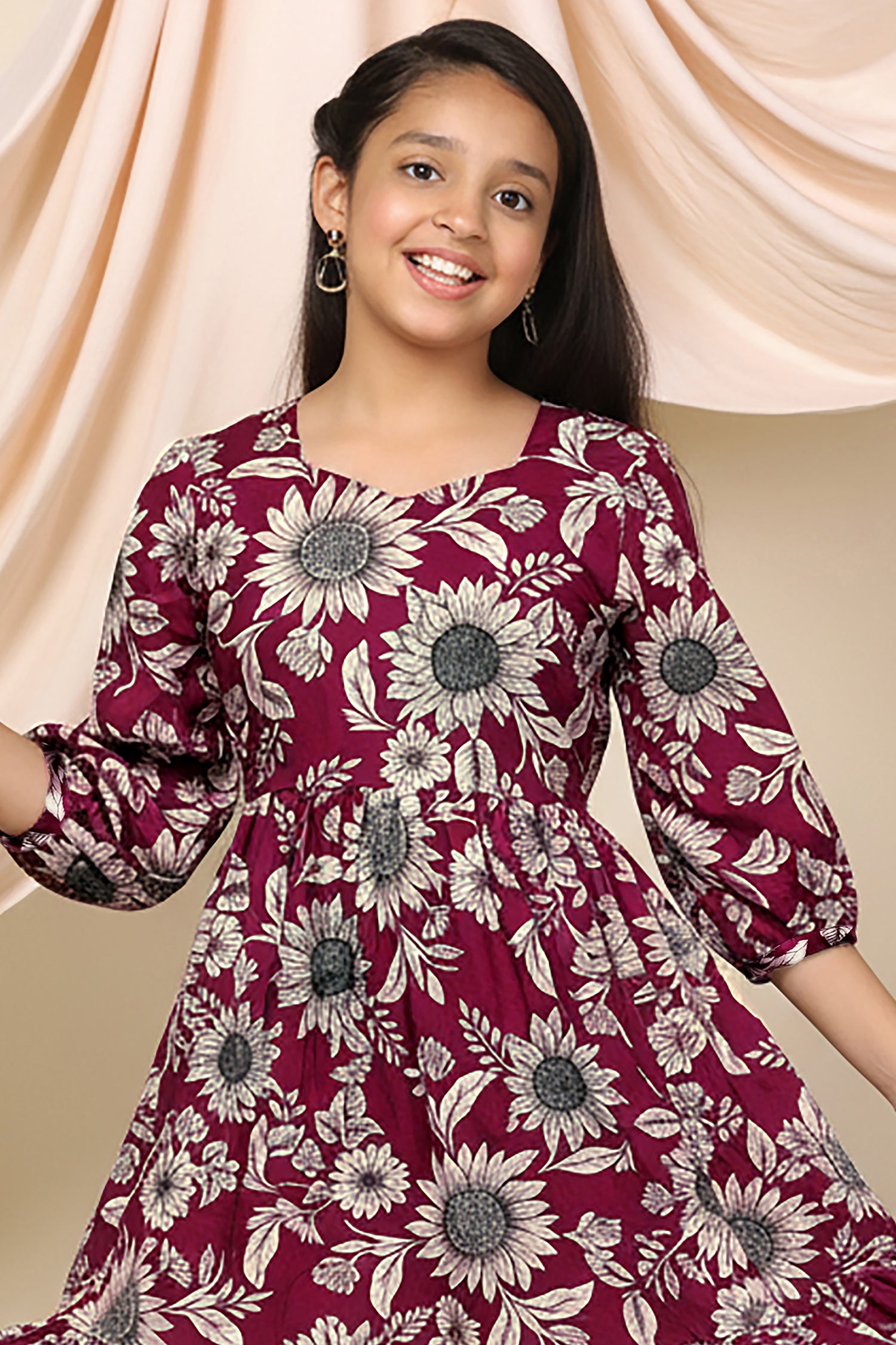 Spruce up your wardrobe with this stylish floral dress for girls from Fashion Dream. This casual kids dress for girls in a magenta color with all-over sunflower prints is the perfect outfit for day outings, birthdays, picnics, or casual get-togethers. Crafted from soft and breathable rayon fabric, this girls dress keeps your child comfortable and relaxed while offering a smooth and flowy drape. The fit-and-flare silhouette with a tiered hemline adds playful charm, making it perfect for twirls and happy moments. Designed with 3/4th puff sleeves and a smart pentagon neckline, this dress for kids girls combines cuteness with everyday style. Easy to style, this versatile girls dress can be paired with sandals or sneakers for a casual look, Whether it’s a fun family outing or a small celebration, this magenta floral dress for girls will keep her shining in comfort and confidence. Stylish, breathable, and easy to wear—this piece is perfect for your little princess’s everyday adventures.