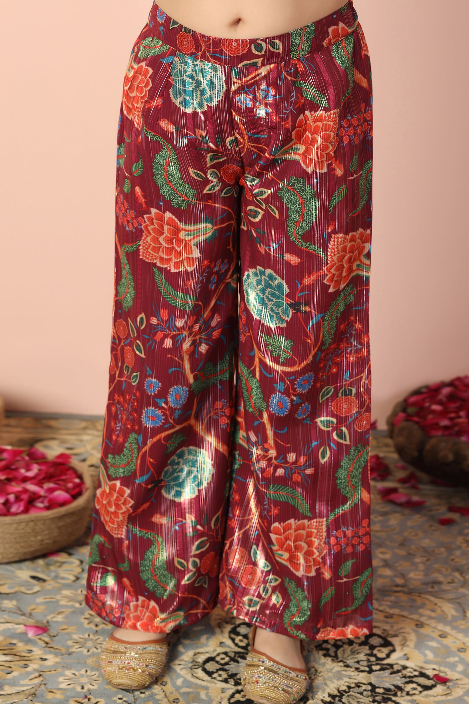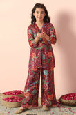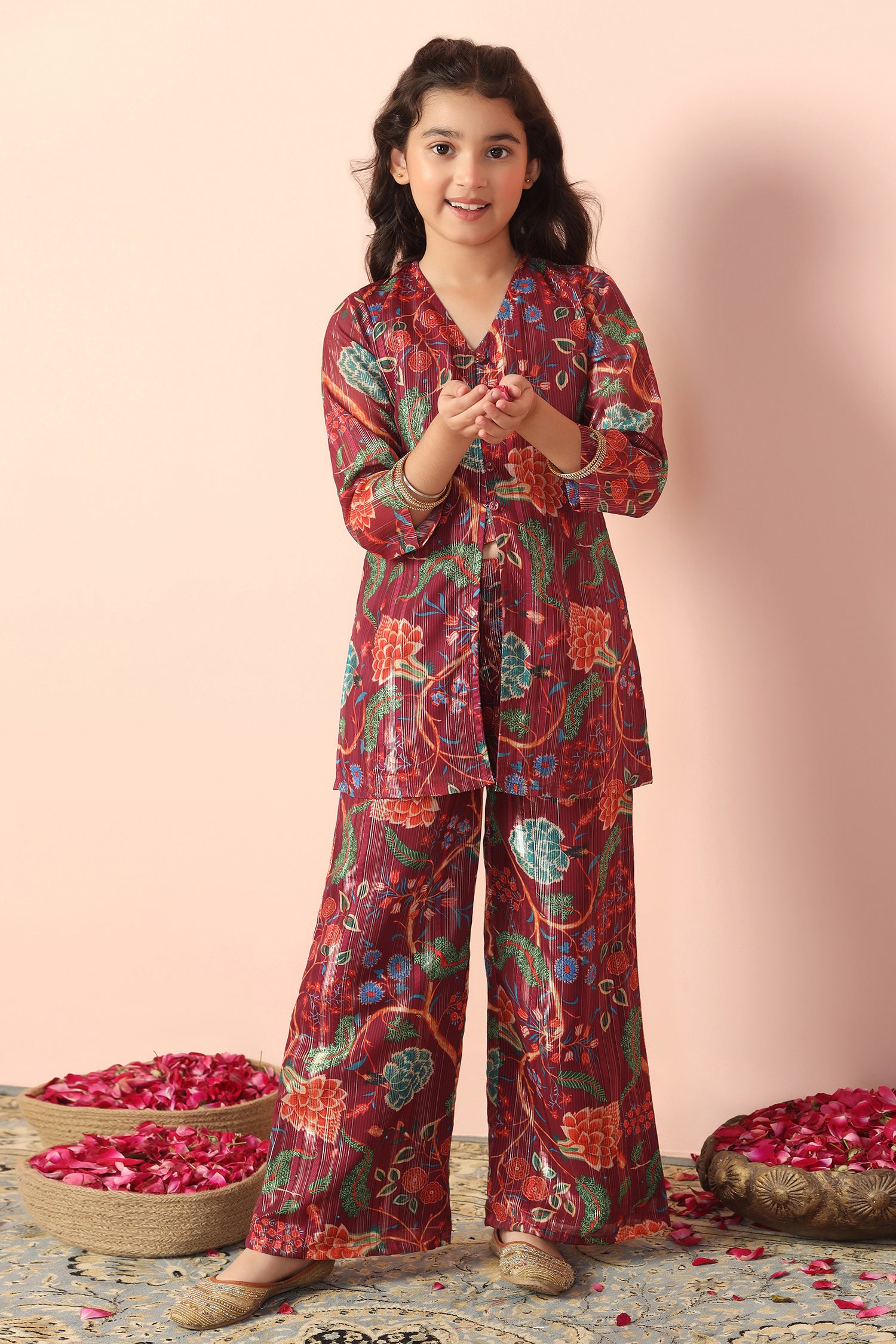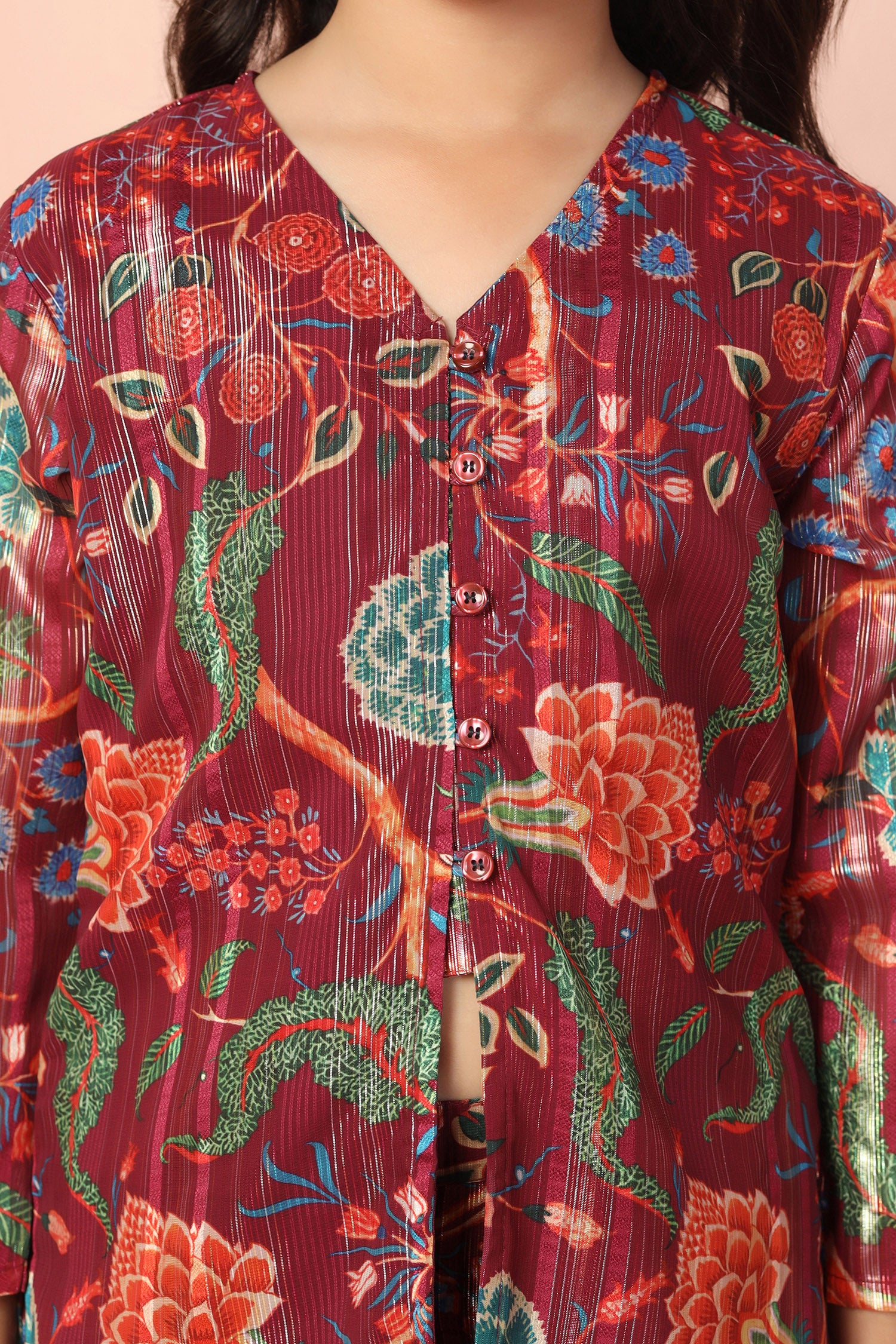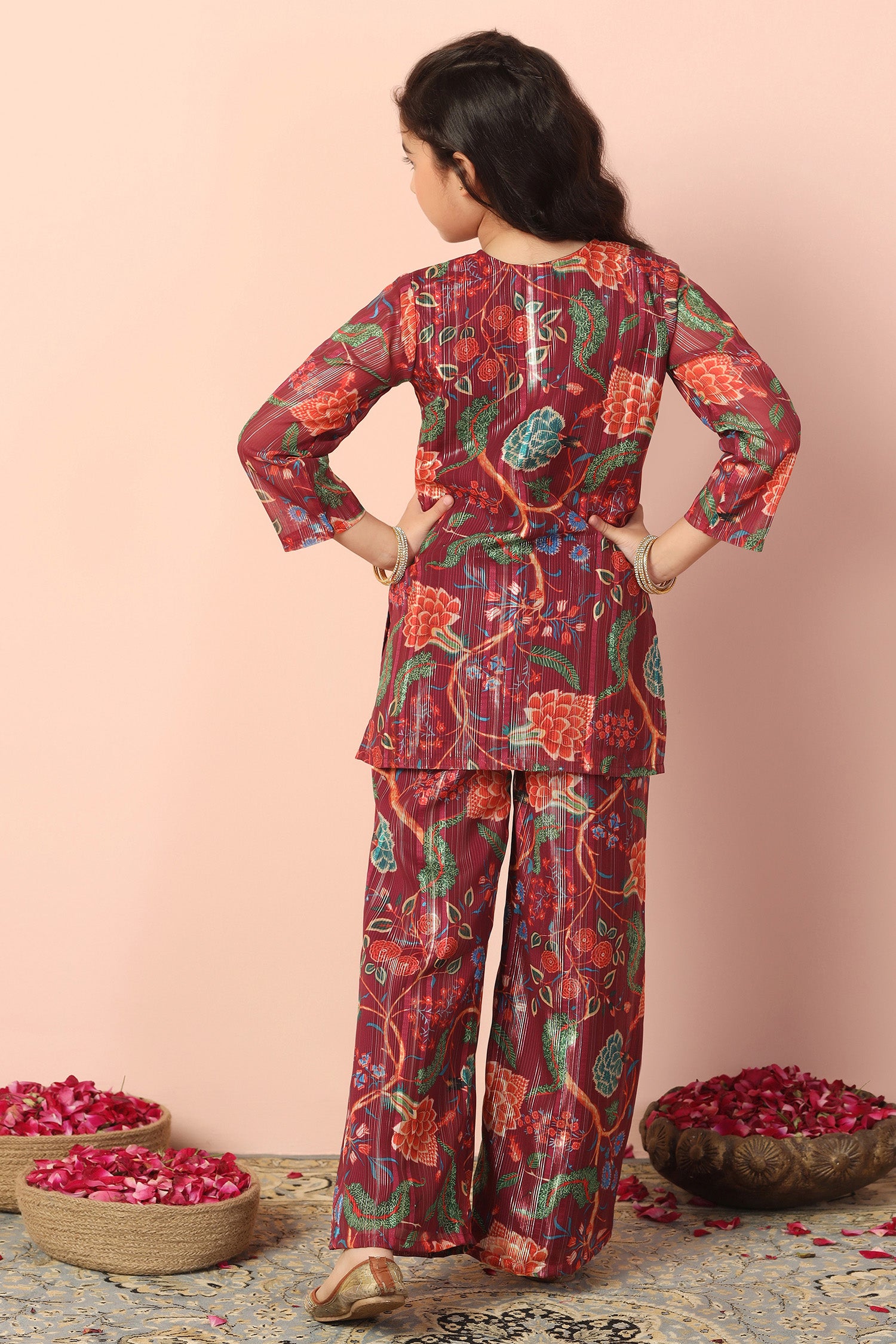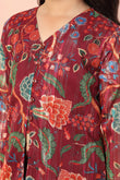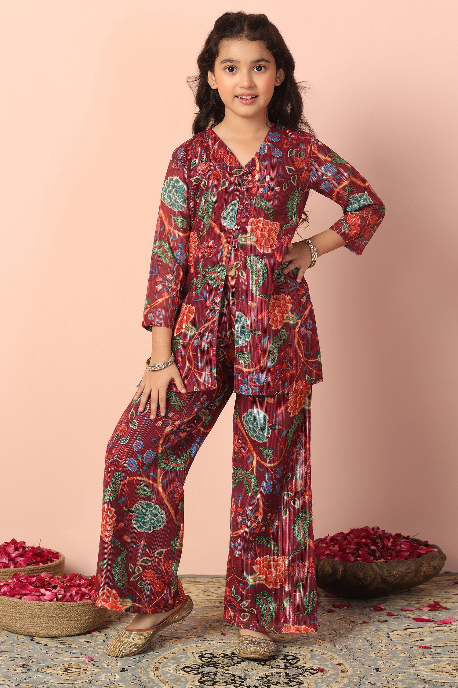 Stay stylish with this elegant Maroon colord Girls Georgette Kurta Sharara Set from fashion dream featuring a graceful V-neck and comfortable 3/4 sleeves. Designed with a beautiful printed pattern this trendy ethnic kurta Palazzo set is perfect for daily wear, festive occasions, office wear, and casual outings. "Note: The accessories and props used in these photoshoots are for aesthetic purposes only and may not be included in the final product or serviceā