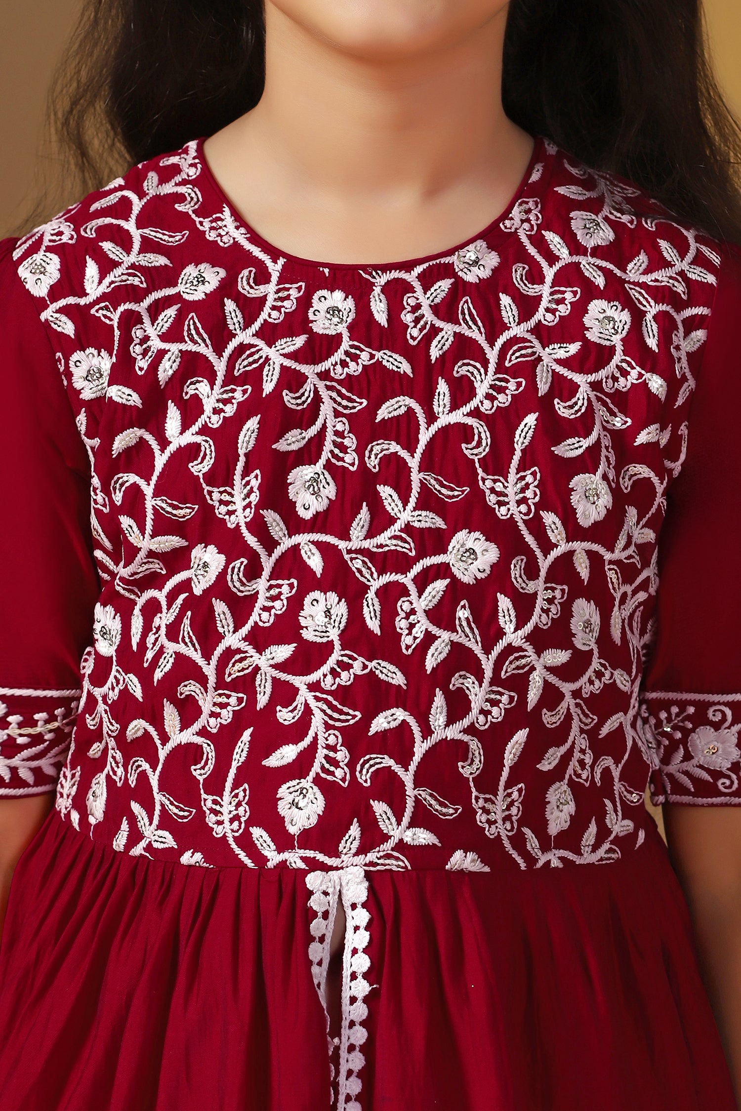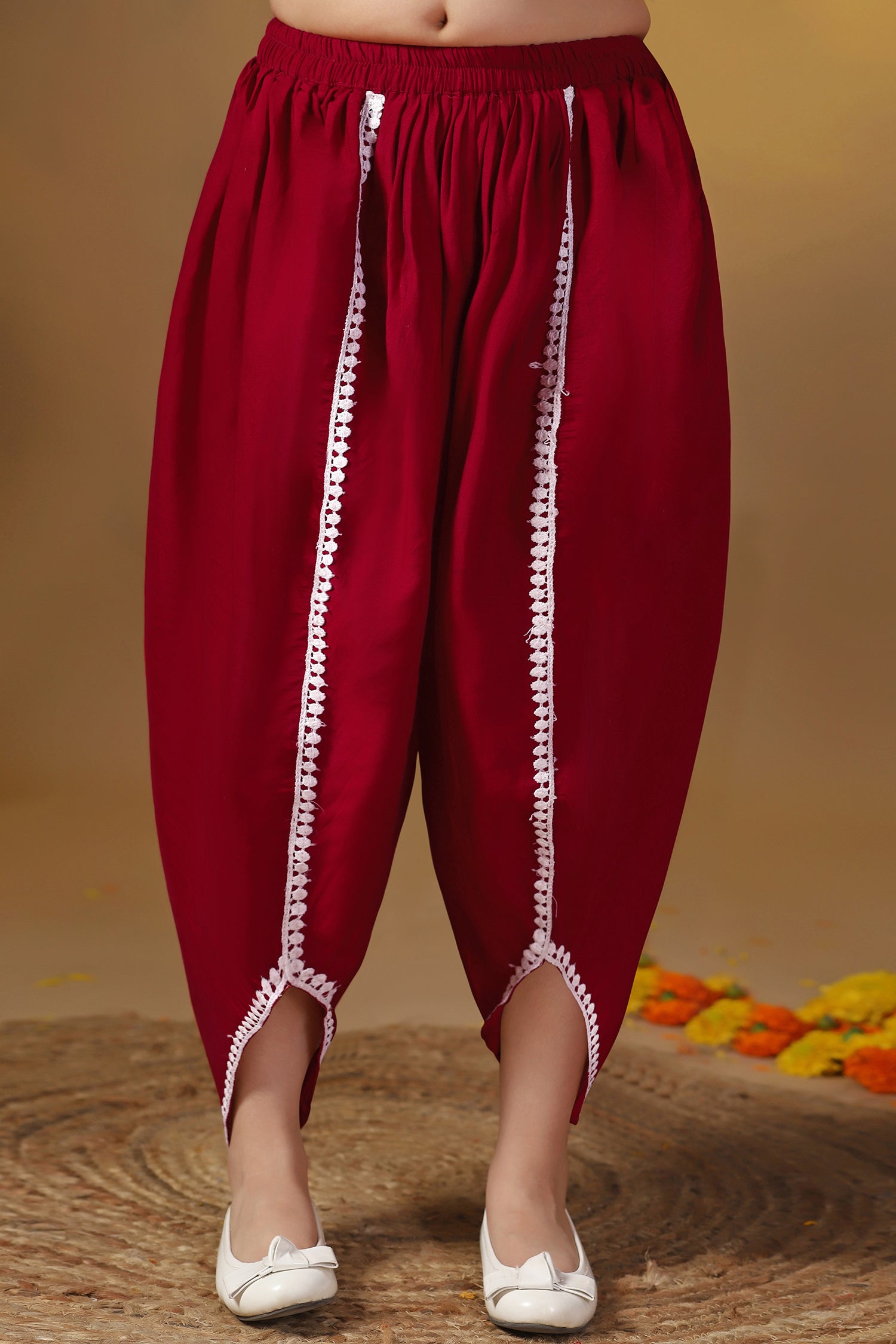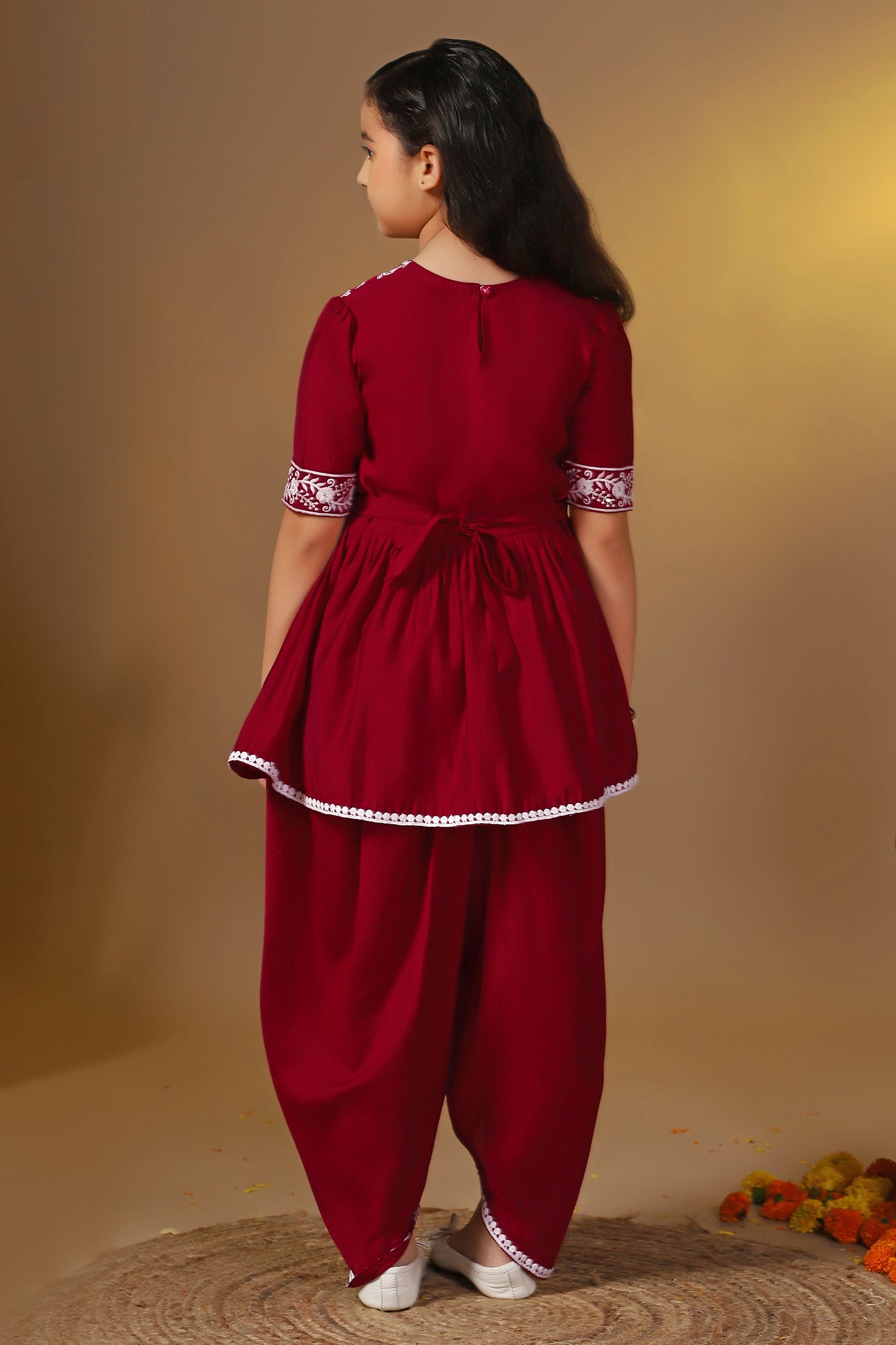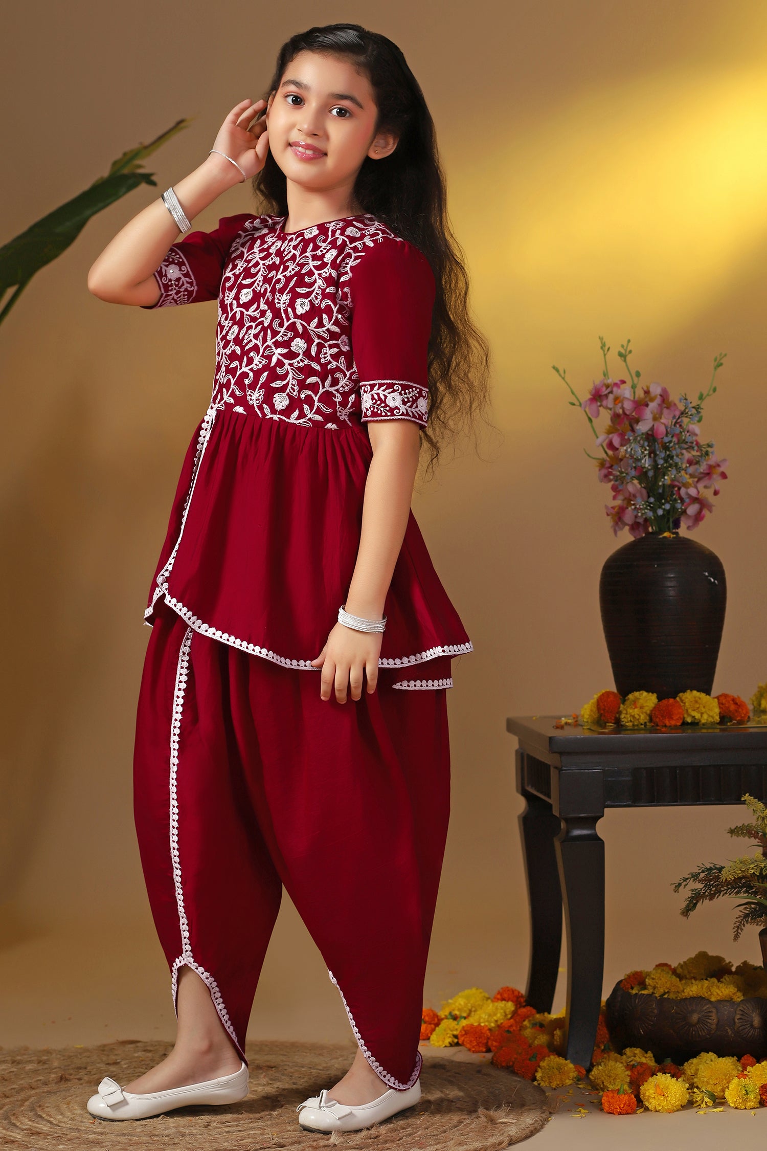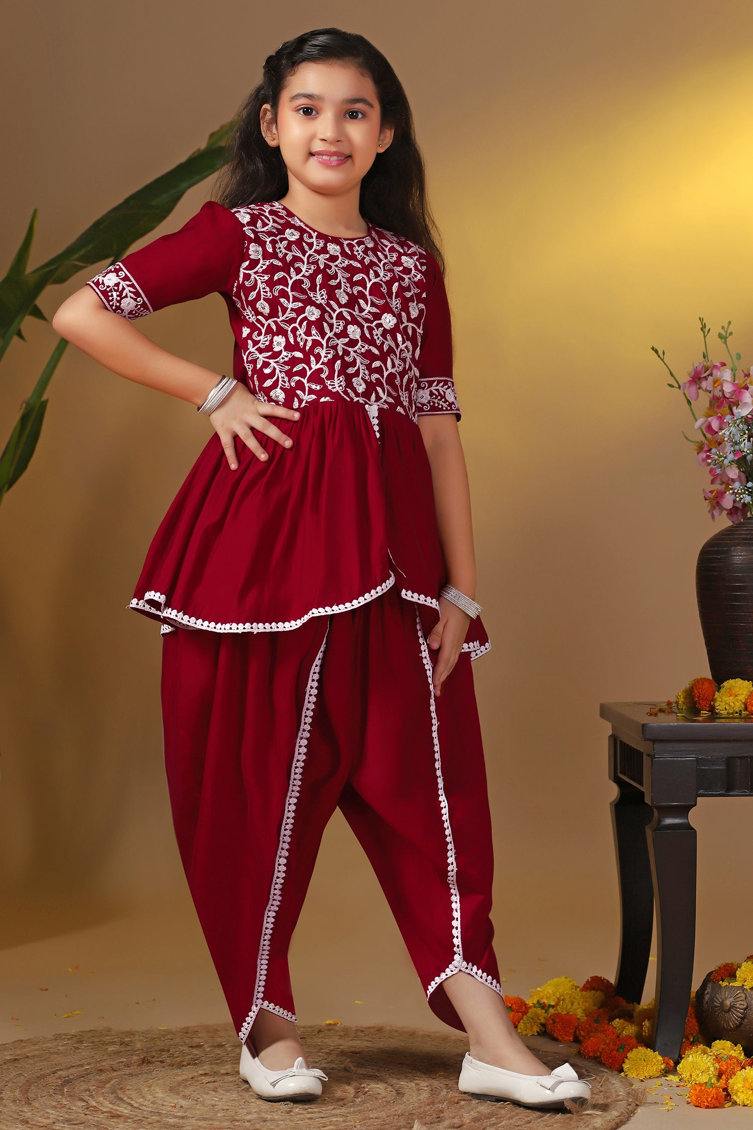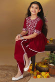 This kurta set completes your girl's look for your special occasions. Get ready your girls for the season of celebrations in this elegant maroon kurta and dhoti suit set crafted from silk blend fabric with a butter crepe inner. It is designed with a round neckline with back button, short sleeves, and flared silhouette. It comes along with Solid dhoti style bottom having fully elasticated waistband for comfortable and easiness. This graceful outfit will make her look gorgeous with light jewelry. It can be worn at festivals or family functions.