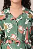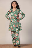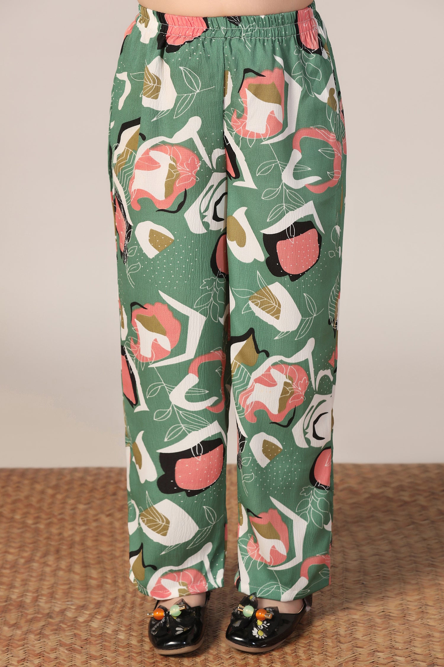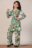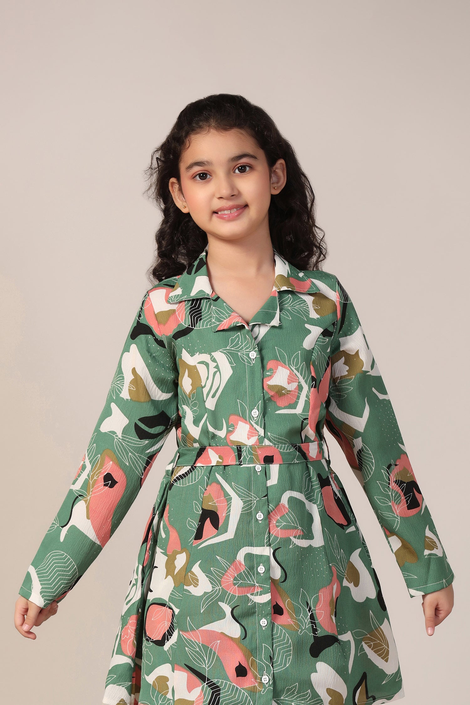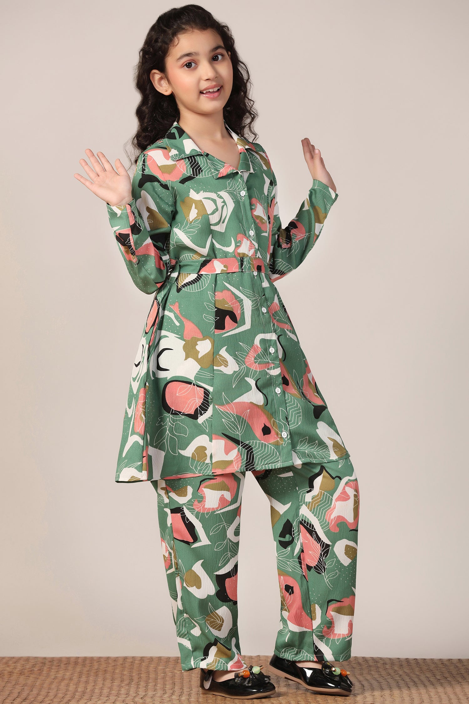 Refresh your wardrobe with this Mehndi colored co-ord set from Fashion Dream. This girls combo set is designed to bring elegance and comfort, making it a perfect choice for outings, casual gatherings, or weekend wear. Crafted from a soft rayon fabric, the top features a smart lapel collar, full sleeves, front button closure, and comes with a self-fabricated belt that cinches the waist, adding shape and style to the overall look. The abstract print in multicolor accents enhances its modern appeal while keeping it playful and chic. The matching printed pant bottom is tailored in a straight fit with a fully elasticated waistband for ease of movement and day-long comfort. Designed with functionality in mind, it also comes with side pockets, making it both trendy and practical. Pair this top and pant set for girls with ballerinas or sneakers along with minimal accessories for a smart and casual everyday look. This versatile set works beautifully as clothing set for girls, western dress for girls, top and bottom set for girls, co ord set for girls, girls cord set, and kids clothes for girls stylish. Note: The accessories and props used in these photoshoots are for styling purposes only and not included in the final product or service.