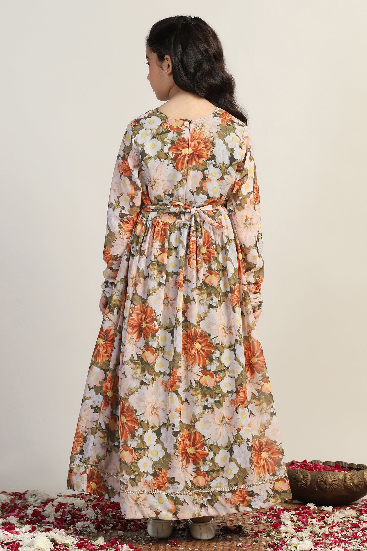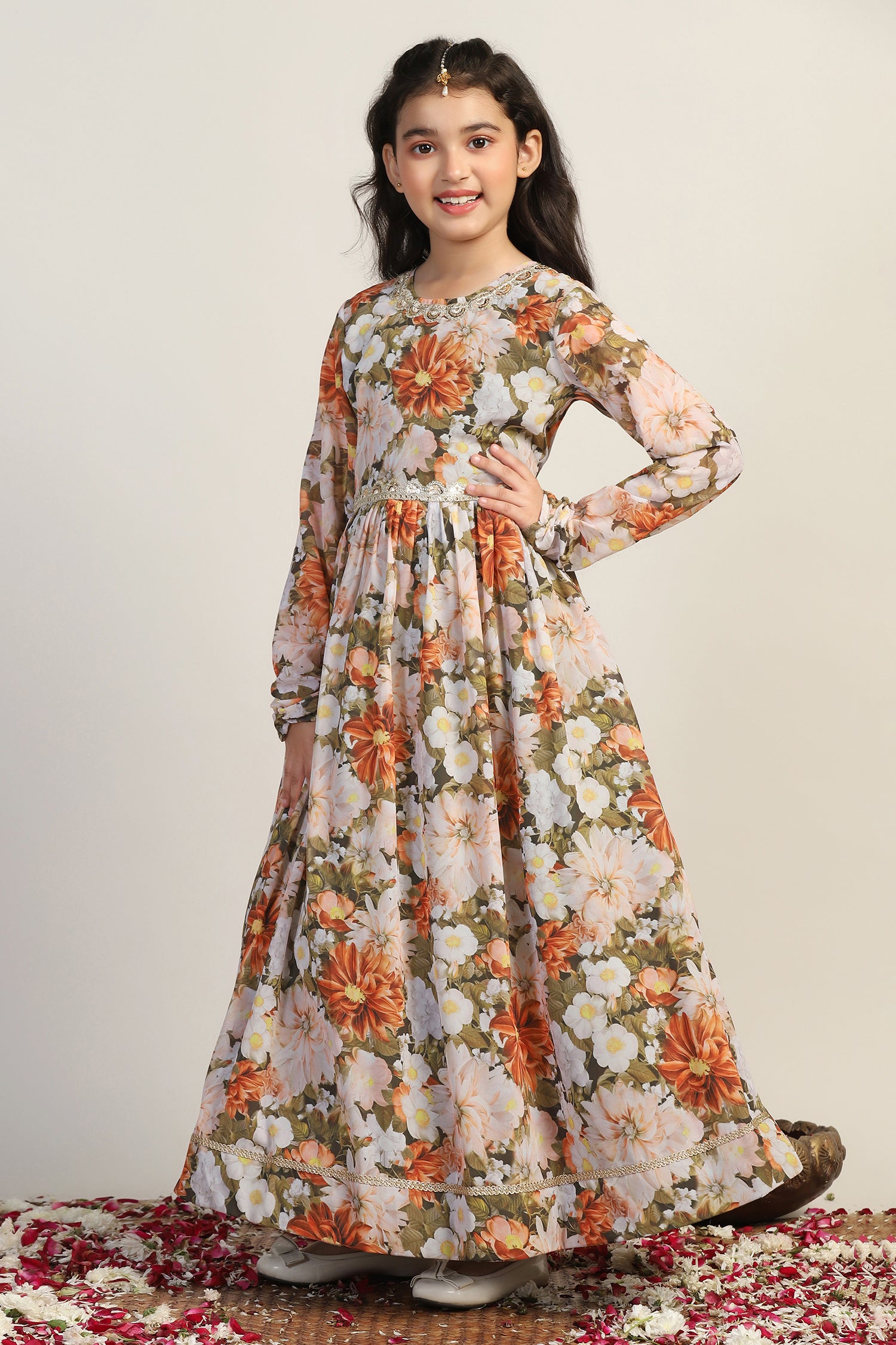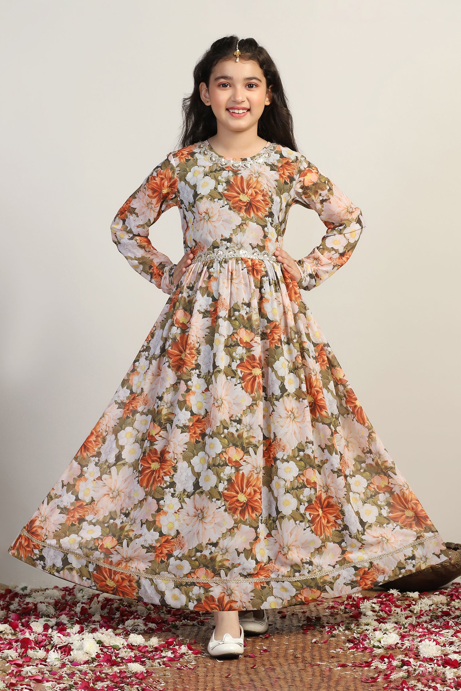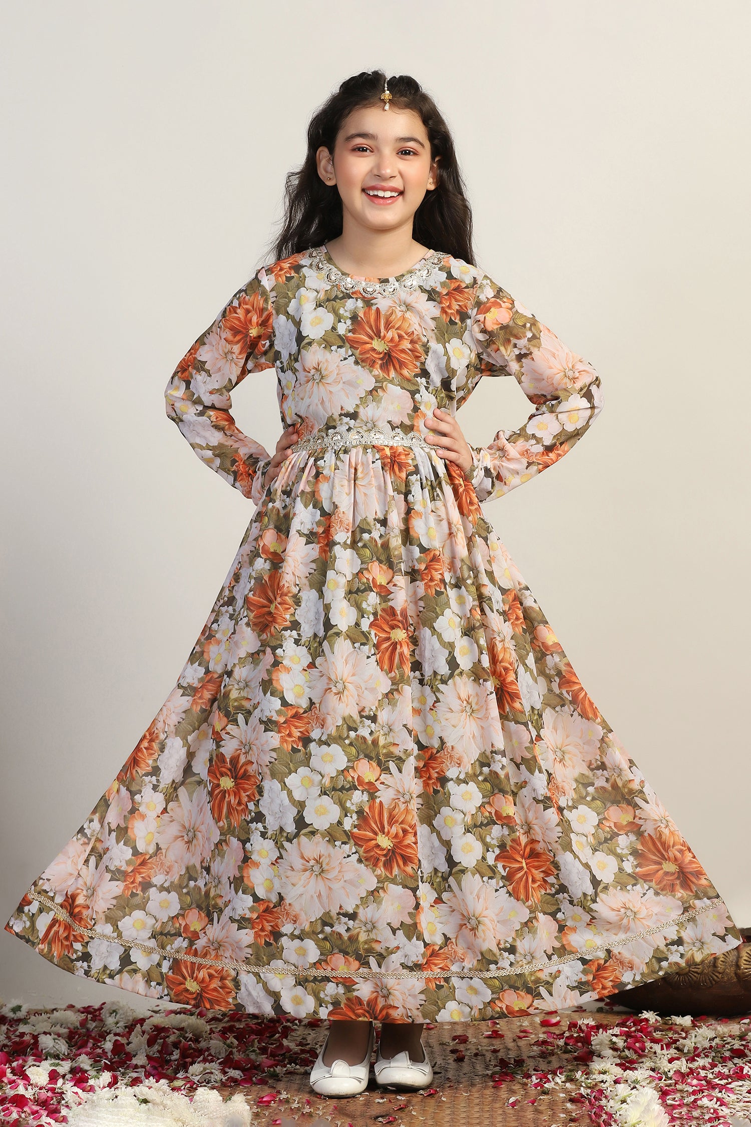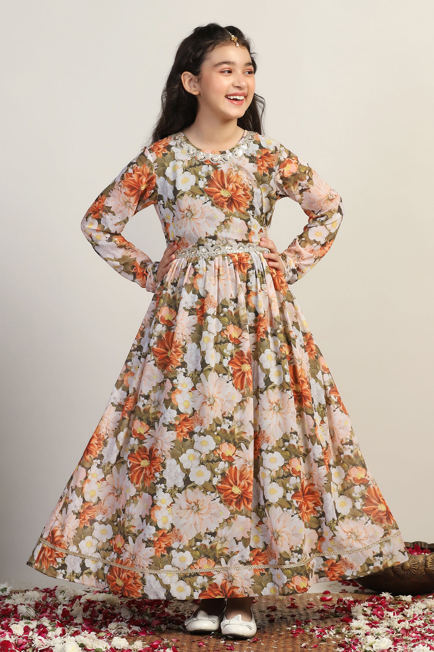 Spruce up your wardrobe with this girls dress from Fashion Dream. This maxi style girls dress has a floral print as pattern type and is perfect for a day out with friends or a night of get-togethers with family. Kids dress for girls crafted from a soft cotton blend with smooth crepe lining, this full-length gown for girls showcases a flattering round neckline, long ruched sleeves, and a flared hemline finished with delicate lace detailing. The back zip closure with a self-fabricated belt ensures both comfort and style, making it a charming dress for girls. Pair this floral maxi with cute ballerinas, delicate hair accessories, or a bracelet to complete the perfect party wear dress for girls look.Perfectly versatile, this design works as a girls dress 12-13 years new fashion or a girls dress 7-8 years. It also fits beautifully in categories like kids clothes for girls, dress for girls 12-13 years, kids dress for girls, western dress for girls, party dress for girls, princess dress for girls, girls dress 10-11 years new fashion, fancy dress for girls, girl dress 13-14 years new fashion, dresses for girls, maxi dress for girls, and kids girls dress. Whether styled for birthdays, festive gatherings, or casual outings, this piece delivers elegance and comfort every time.