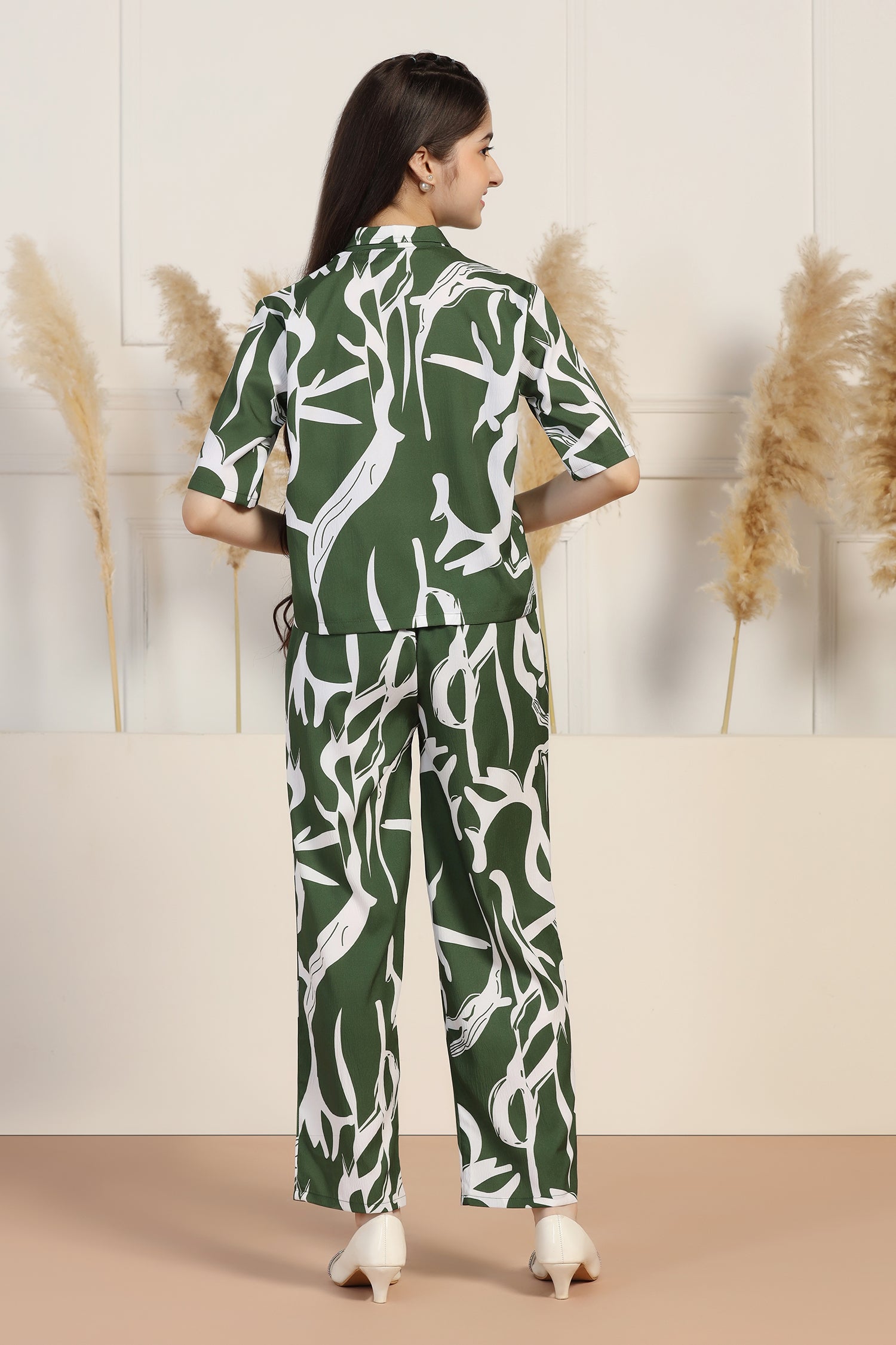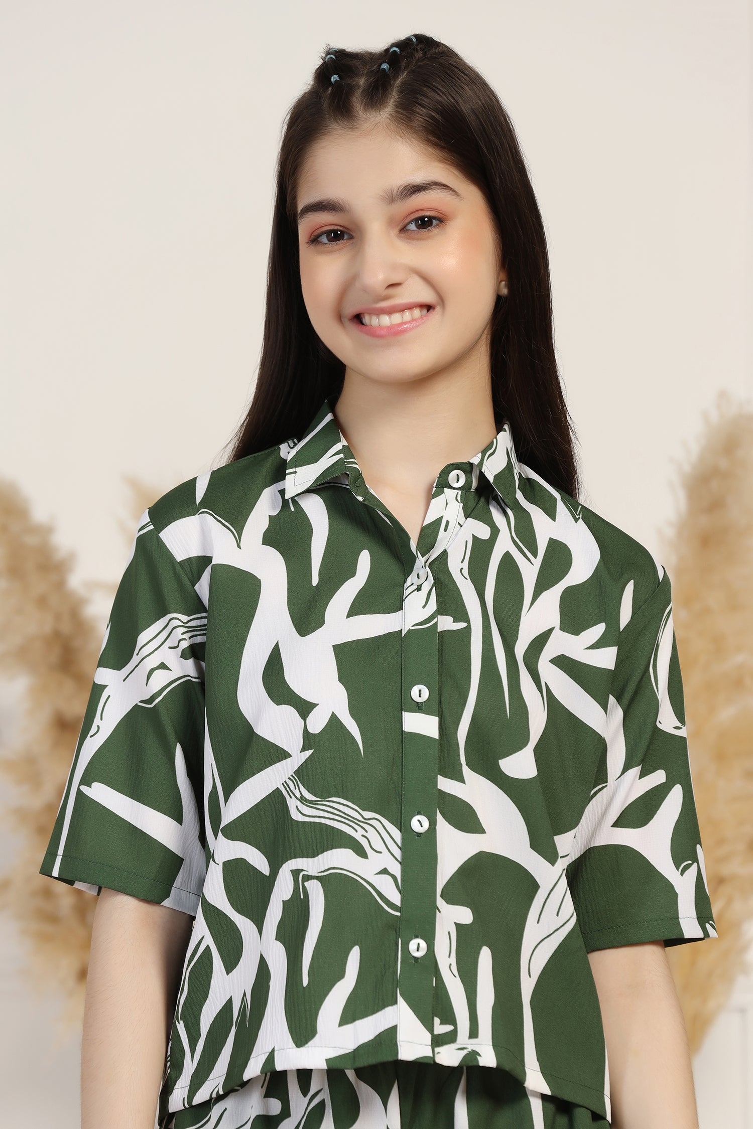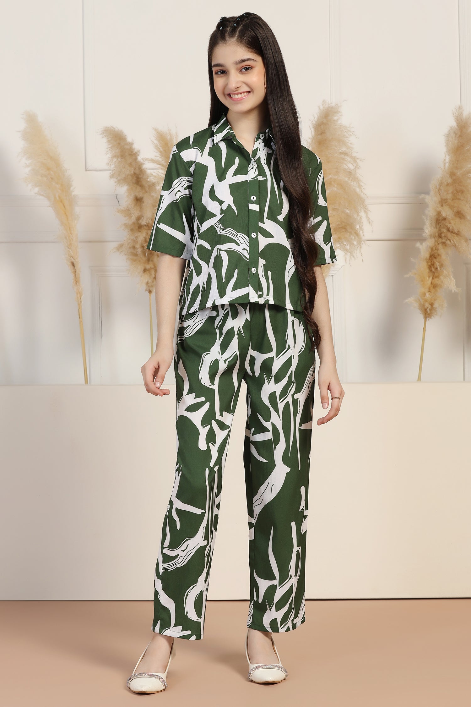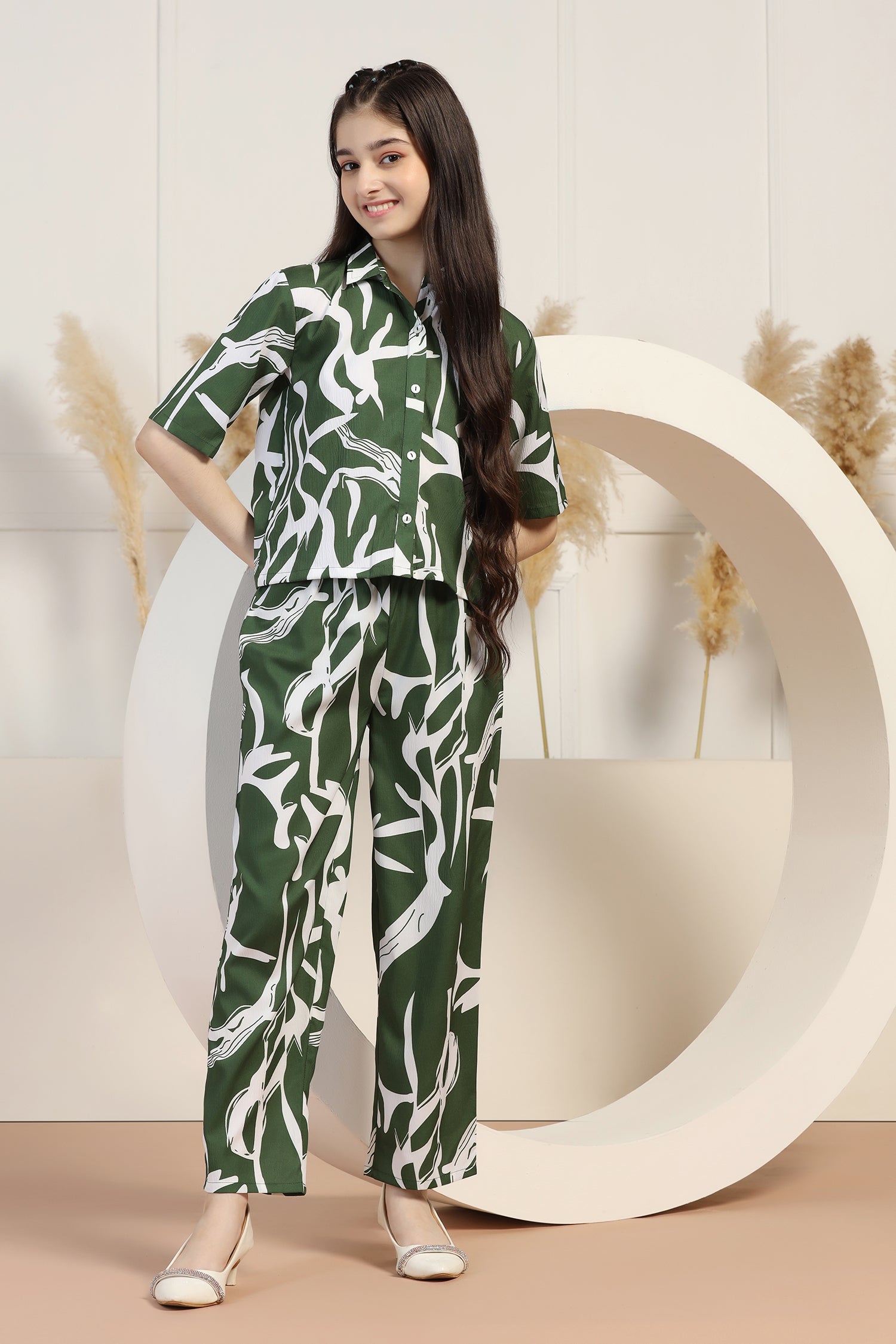 The two-piece set can be mixed and matched with other items in your girl’s wardrobe for extra versatility. With dreamy olive color with all over printed clothing set is made for laidback dressing for your little girl's. It is crafted from Delta (cotton blend) fabric in a comfy fit, featured with a shirt collar neck with front opening button plackets and regular short sleeves for a relaxed feel. The hemline finishes at a straight short length. This combo set comes with a printed pant style bottom that have fully elasticated waist easy-to-wear. Style up your girl’s summer holiday look with this clothing set and complete with her favorite sneakers, hair band and stylish glasses. "Note: The accessories and props used in these photoshoots are for aesthetic purposes only and may not be included in the final product or service."