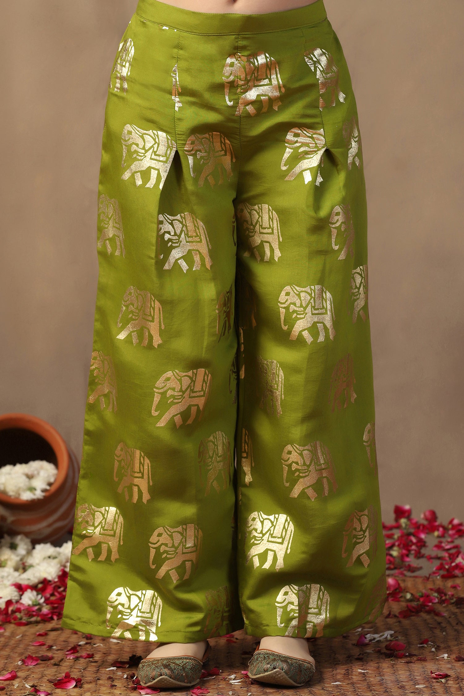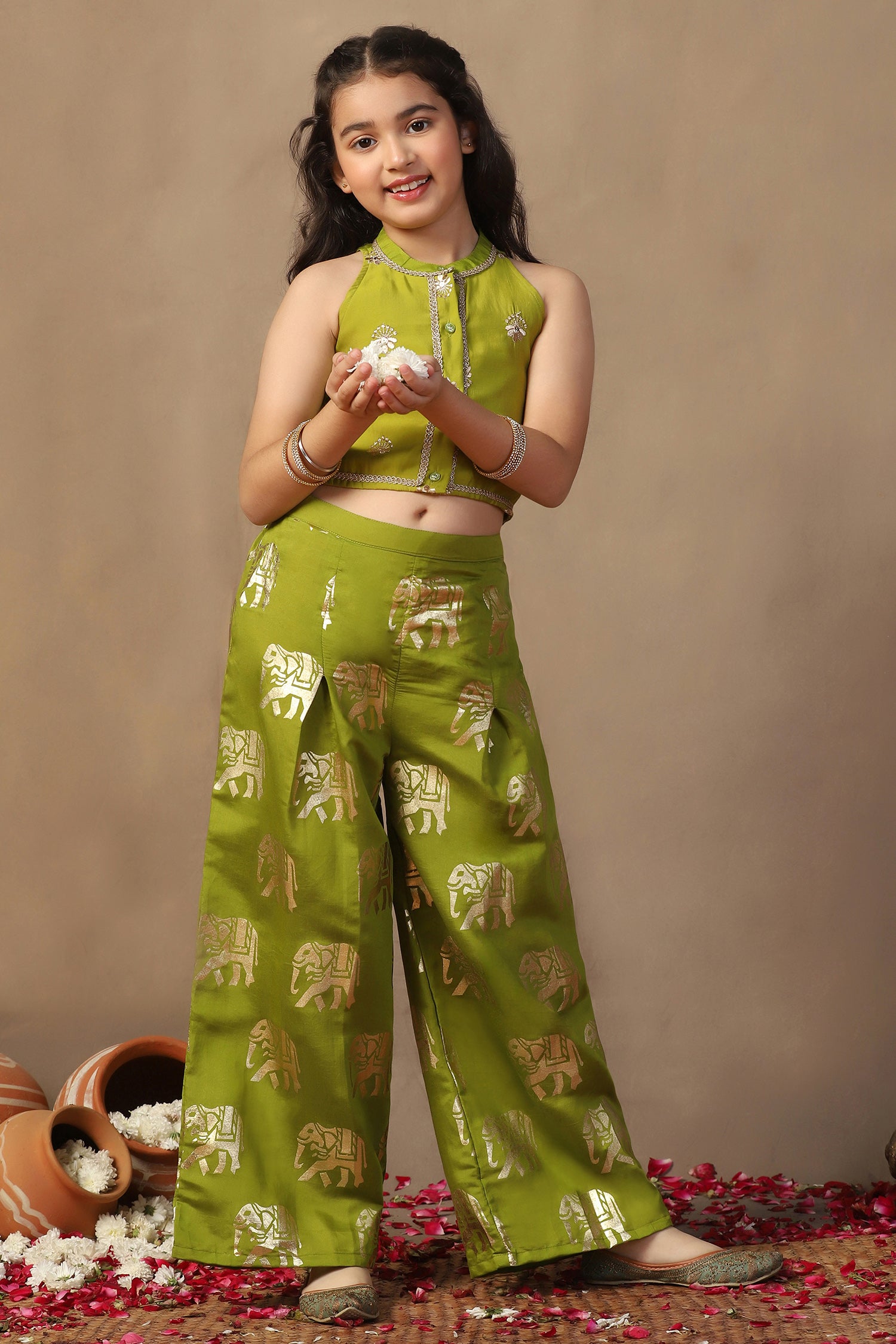 Girl's Olive Roman Silk Foil Printed Crop Top And Palazzo set