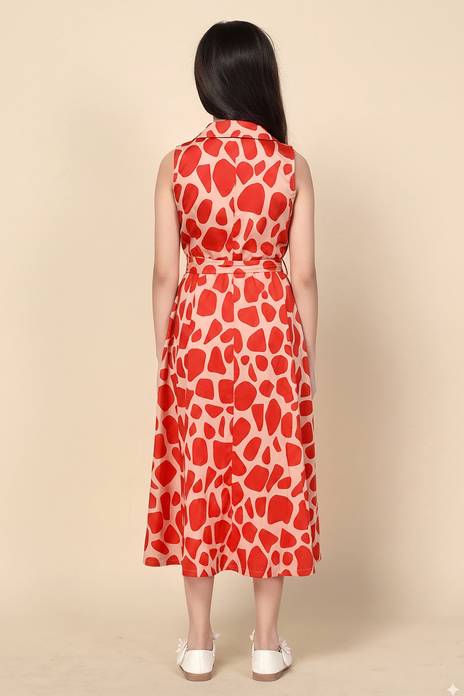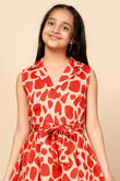 Spruce up your wardrobe with this girls dress from Fashion Dream. This sleeveless kid dress for girls has a animal printed pattern and is perfect for a fun day out with friends or festive get-togethers with family. Crafted with a soft and durable fabric blend, this stylish dress for girls ensures breathability and comfort while maintaining a elegant look. The collared neckline, and tie-up waist belt add a chic touch, while the A-line silhouette gives the outfit a graceful flow. The striking orange and beige combination makes it a fashionable pick in kids clothes for girls, perfect for both casual and festive occasions. Whether worn as a party wear dress for kids girls, a trendy everyday outfit, or a special function look, this gown for girls adapts beautifully to different events. Pair it with sneakers for a playful daytime look, or ballerinas and accessories for a festive occasion.