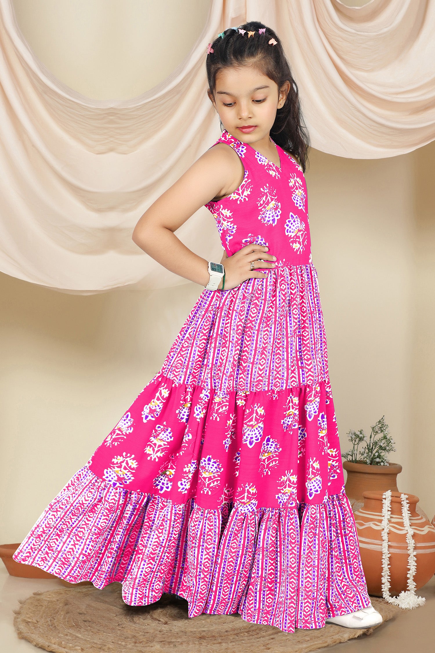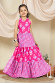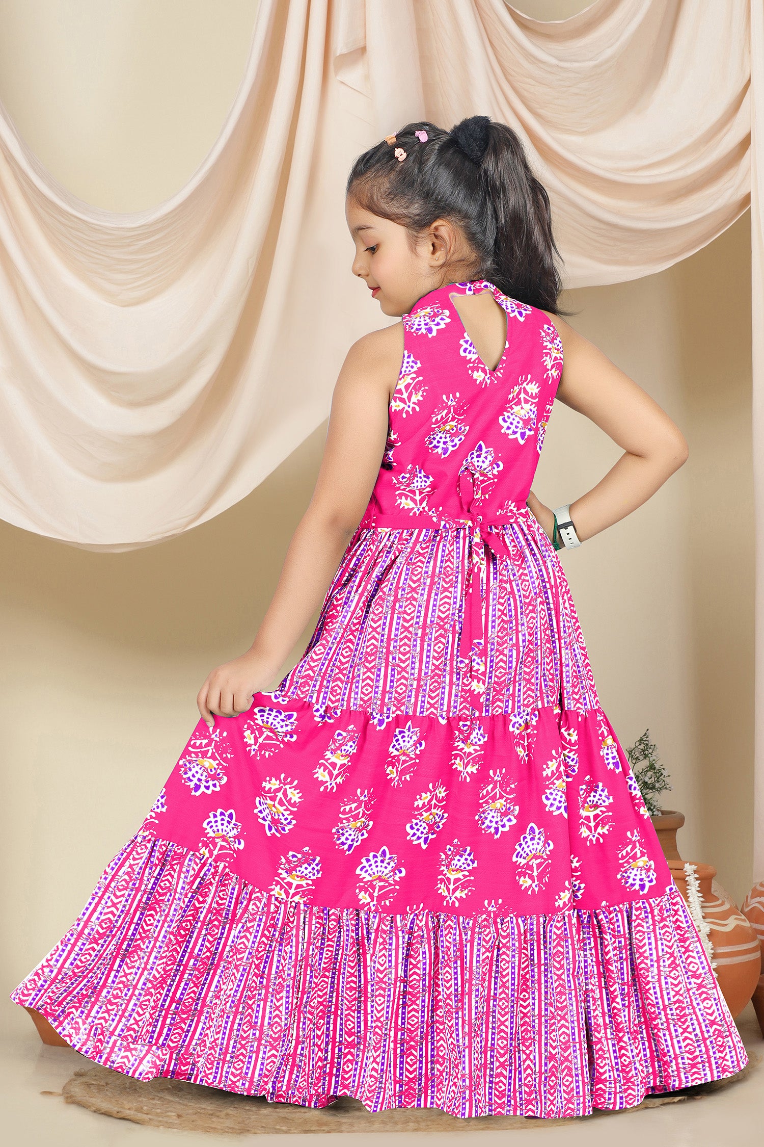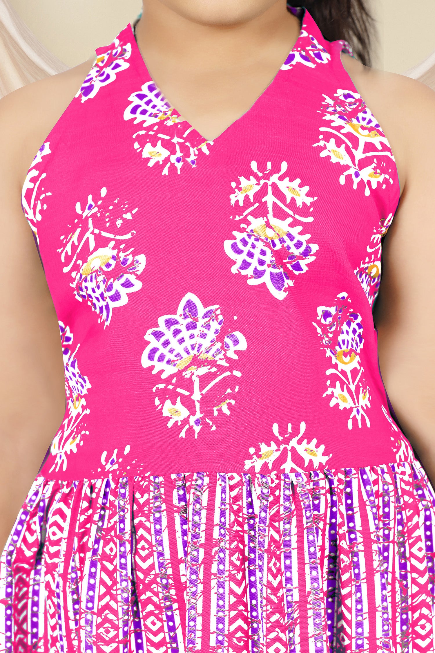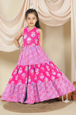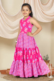 Dress your little girls with this pink colored maxi length kids dress from Fashion Dream. Pair it up with a cute hair accessory and closed shoes for her to shine at the best friend’s birthday party. Add a touch of elegance and charm to your girl's wardrobe with this stunning floral printed maxi dress. Crafted in cotton blend fabric this dress features halter neck, sleeveless bodice, and all over print. This fit and flare style dress comes along self fabricated belt and back button closure makes it ideal for both party wear and festive wear. Style this dress with her favourite flats or heels and use light jewellery to make her look more beautiful.